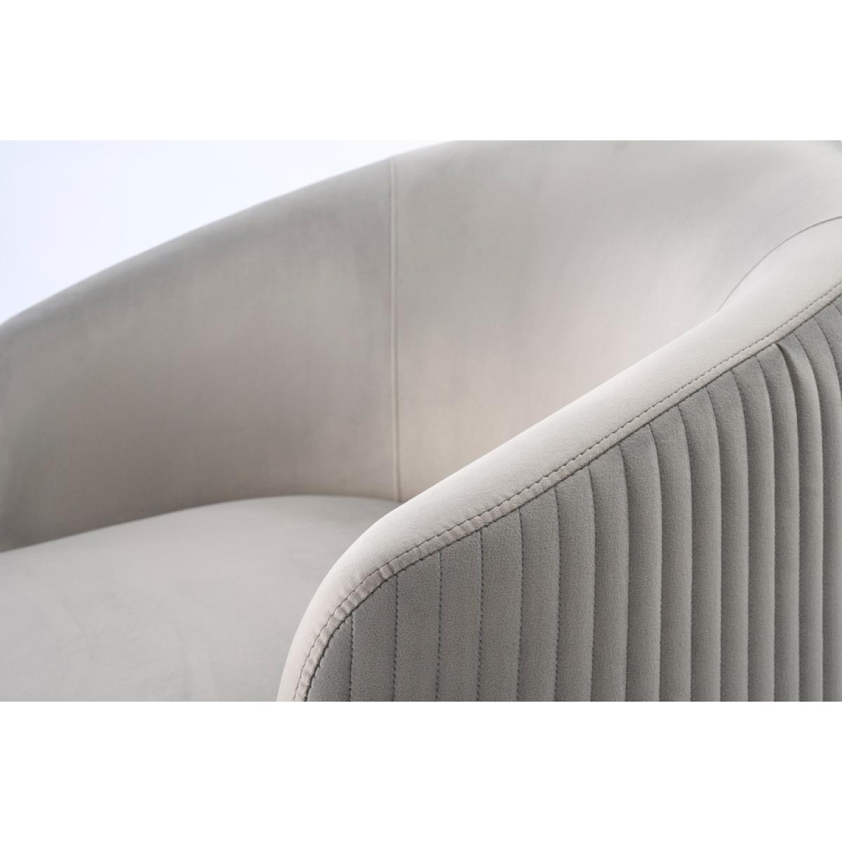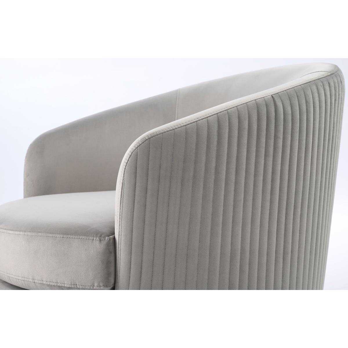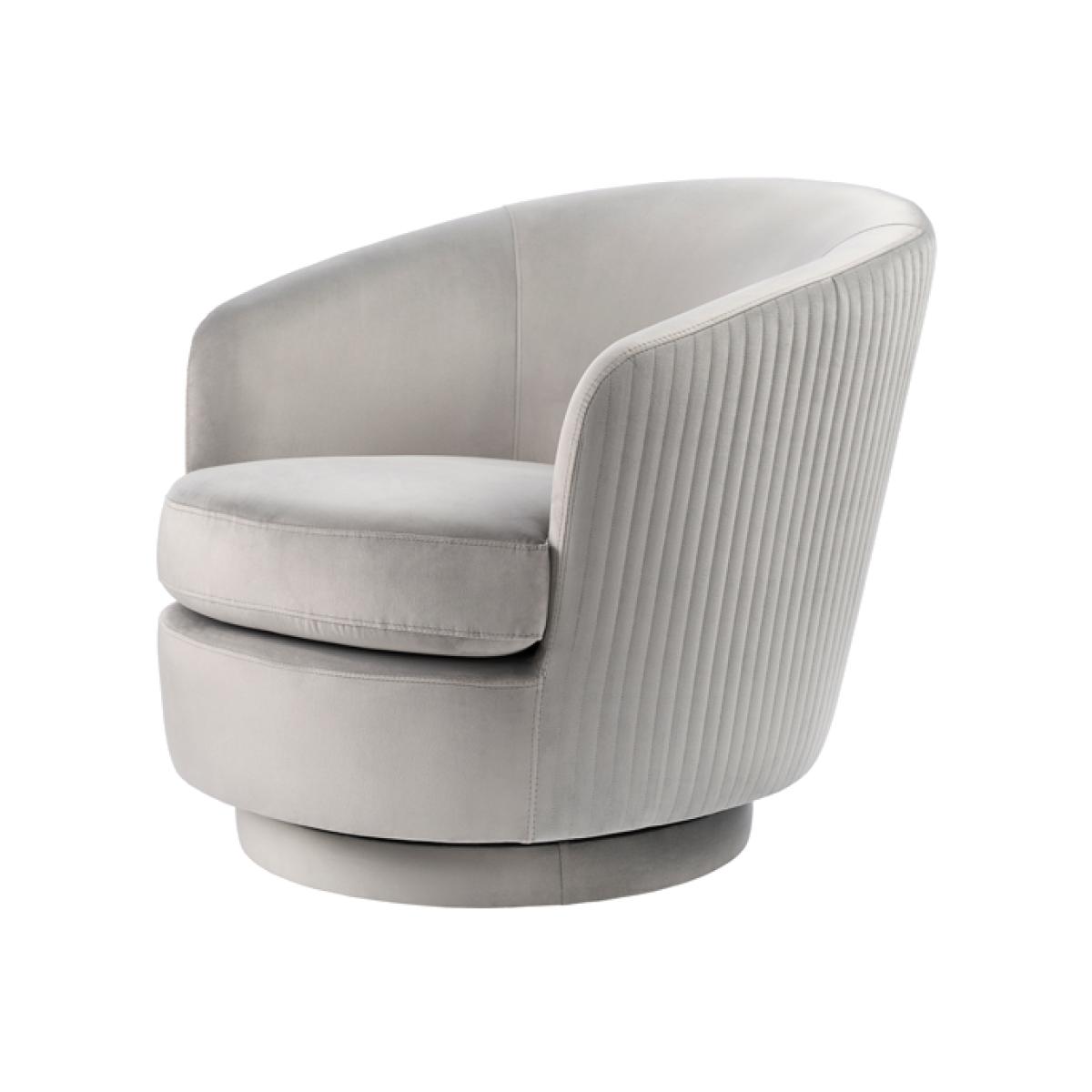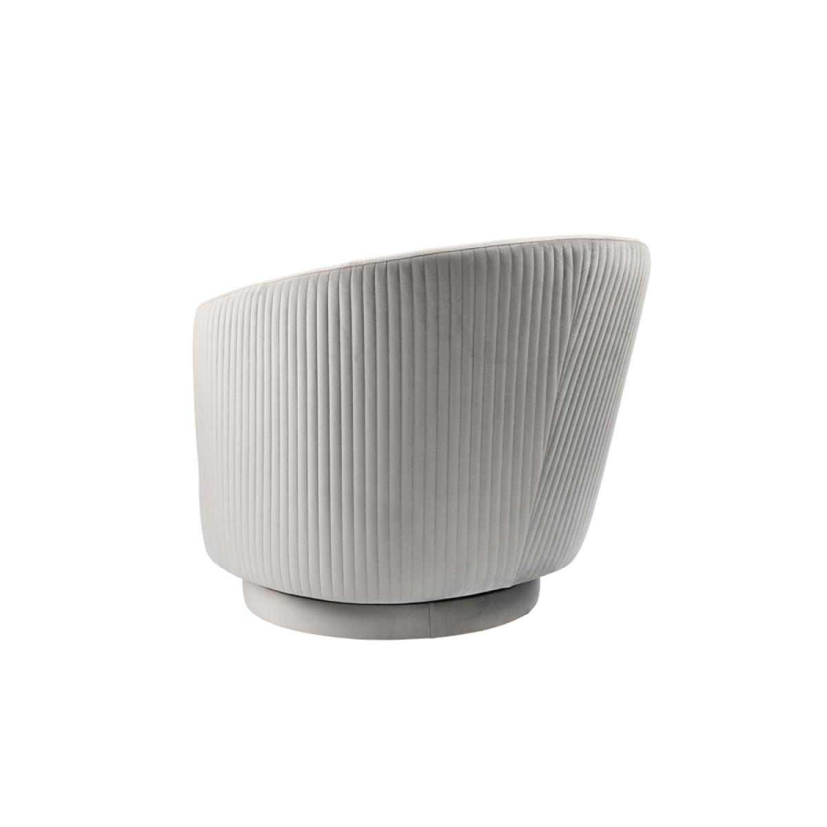 A luxurious and indulgent lounge chair, perfect for reading and watching movies. Very comfortable sprung seat with generous deep padding. Elegant fluted quilting pattern to the exterior. Swivel base. Fully upholstered in velvet fabric.