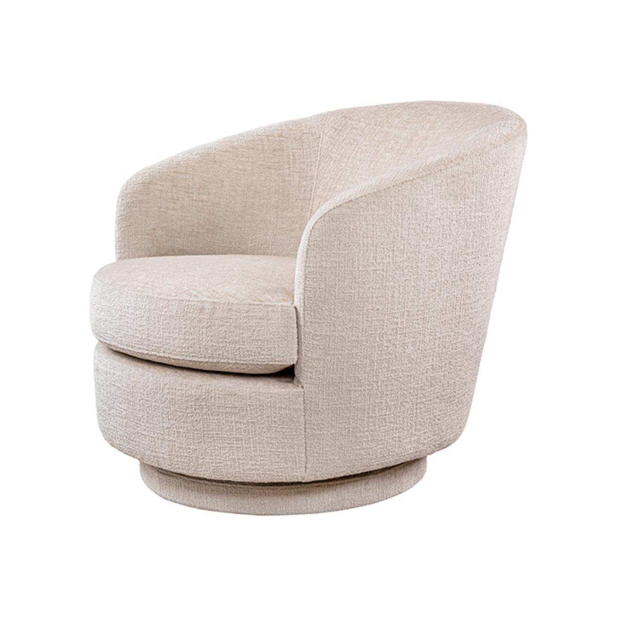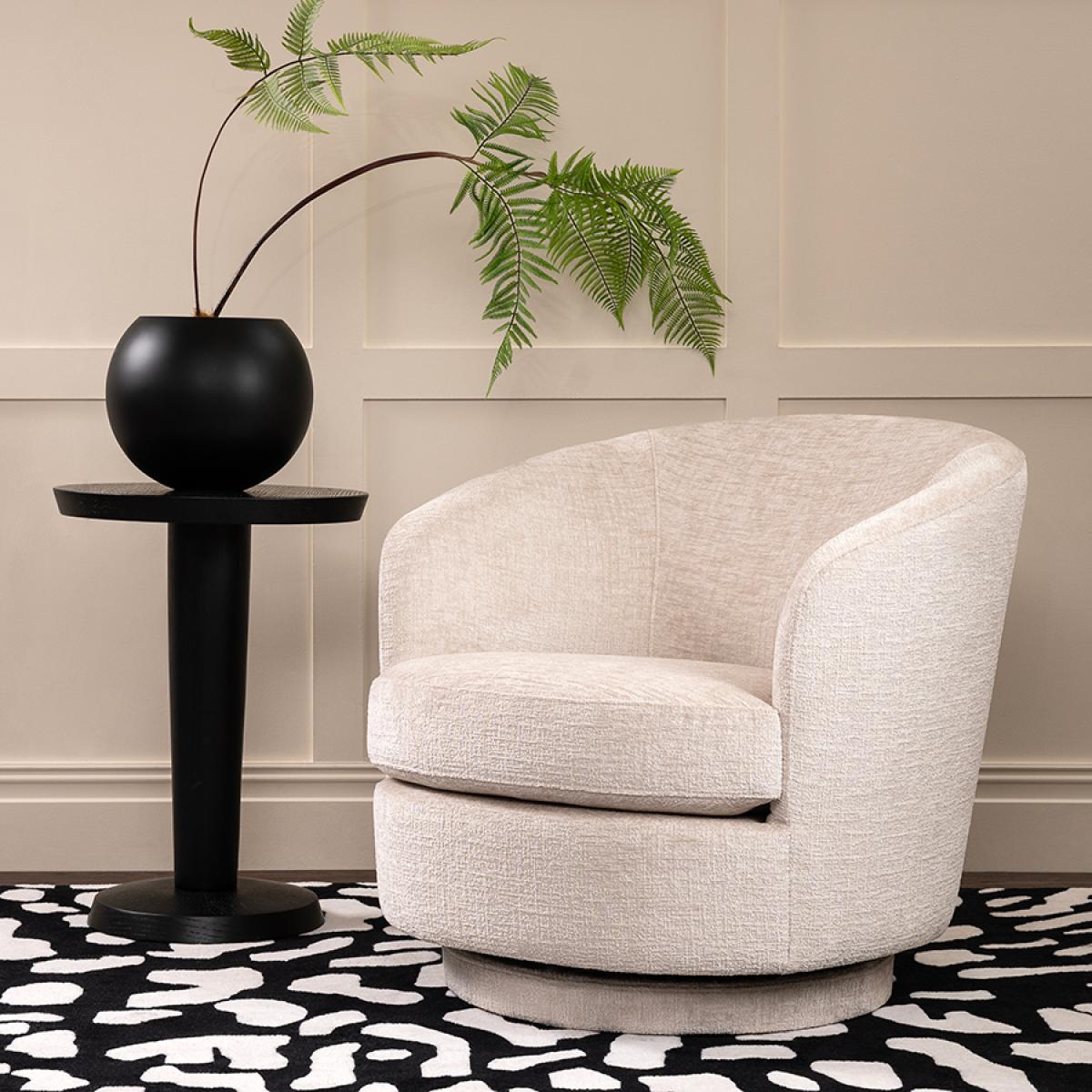 The Melville swivel chair in light taupe is a versatile piece that combines comfort with contemporary style. I love its neutral tone, which makes it adaptable to various colour schemes, from minimalistic modern to softer, more textured interiors. Its rounded silhouette and swivel feature add practical appeal, making it ideal for cosy corner reading nooks or as an accent within a living room. To style it well, consider pairing with textured throws or colourful cushions to create visual interest, or position it near a statement side table to enhance its functional and aesthetic appeal. This piece works particularly well in relaxed, elegant spaces where comfort and style are both priorities.