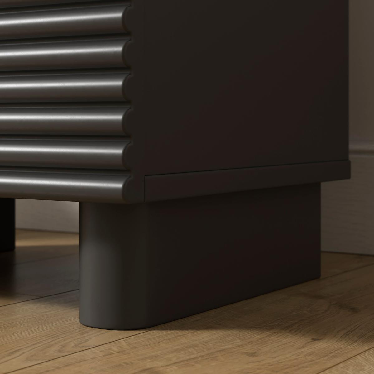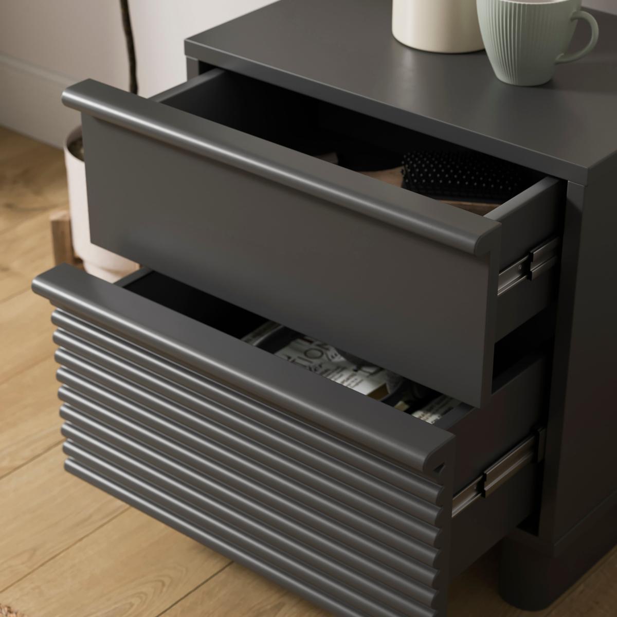 I love this bedside table for its striking midnight blue colour, which adds a modern and sophisticated touch to various interiors. Its clean lines and discreet two-drawer design make it both practical and stylish, perfect for those who want functional storage without clutter. It works well in contemporary or minimalist bedrooms, but can also be paired with other bold or contrasting colours for a more eclectic look. For styling, try layering a few curated decorative items on top-like a ceramic lamp, a small plant, or some favourite books-to keep the surface interesting yet uncluttered. This piece offers great versatility and can be a statement feature while maintaining a sleek, organised feel.