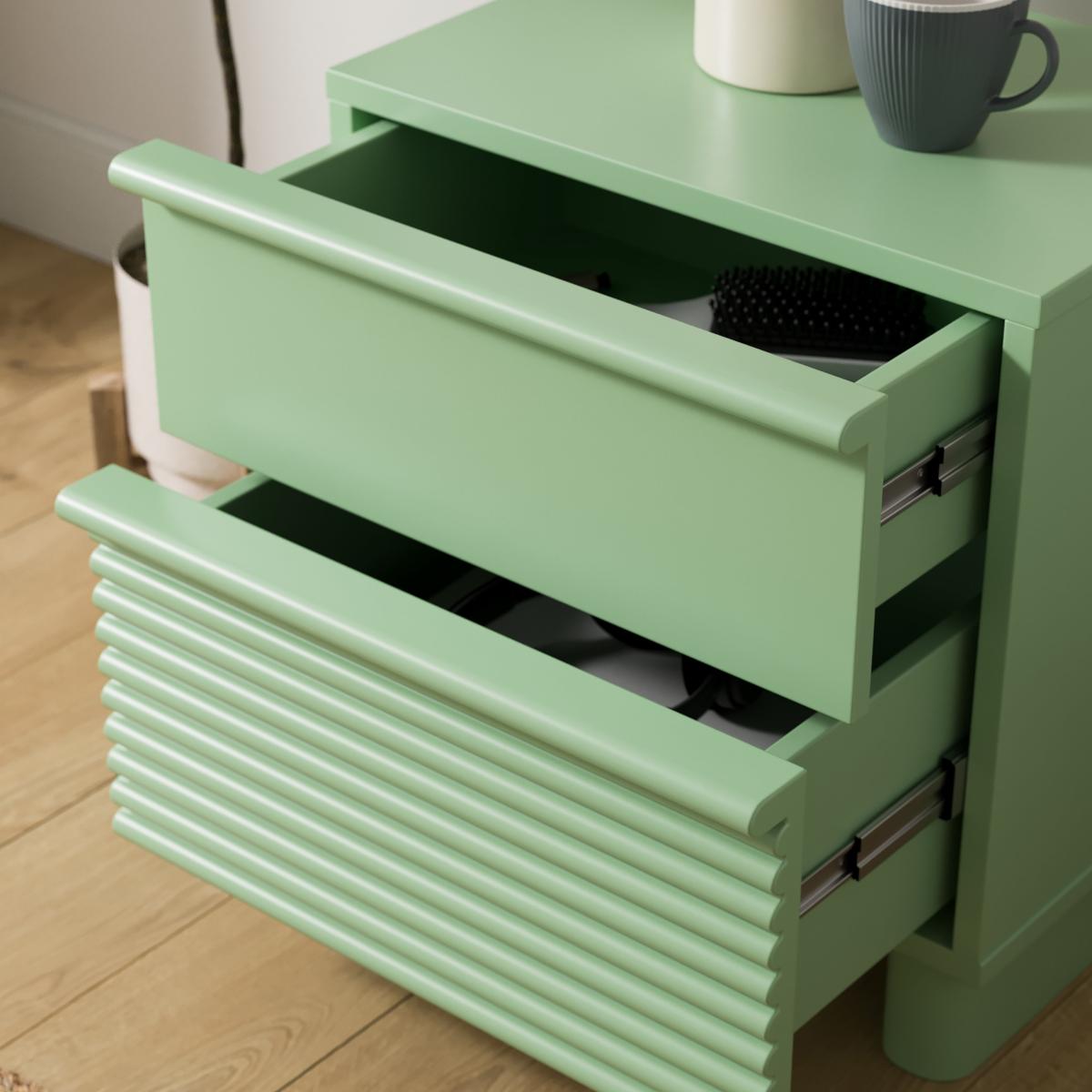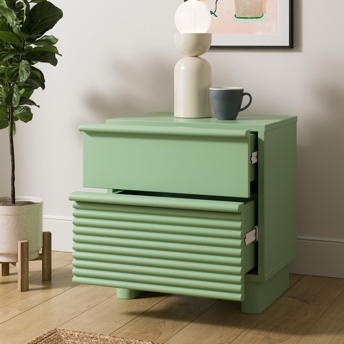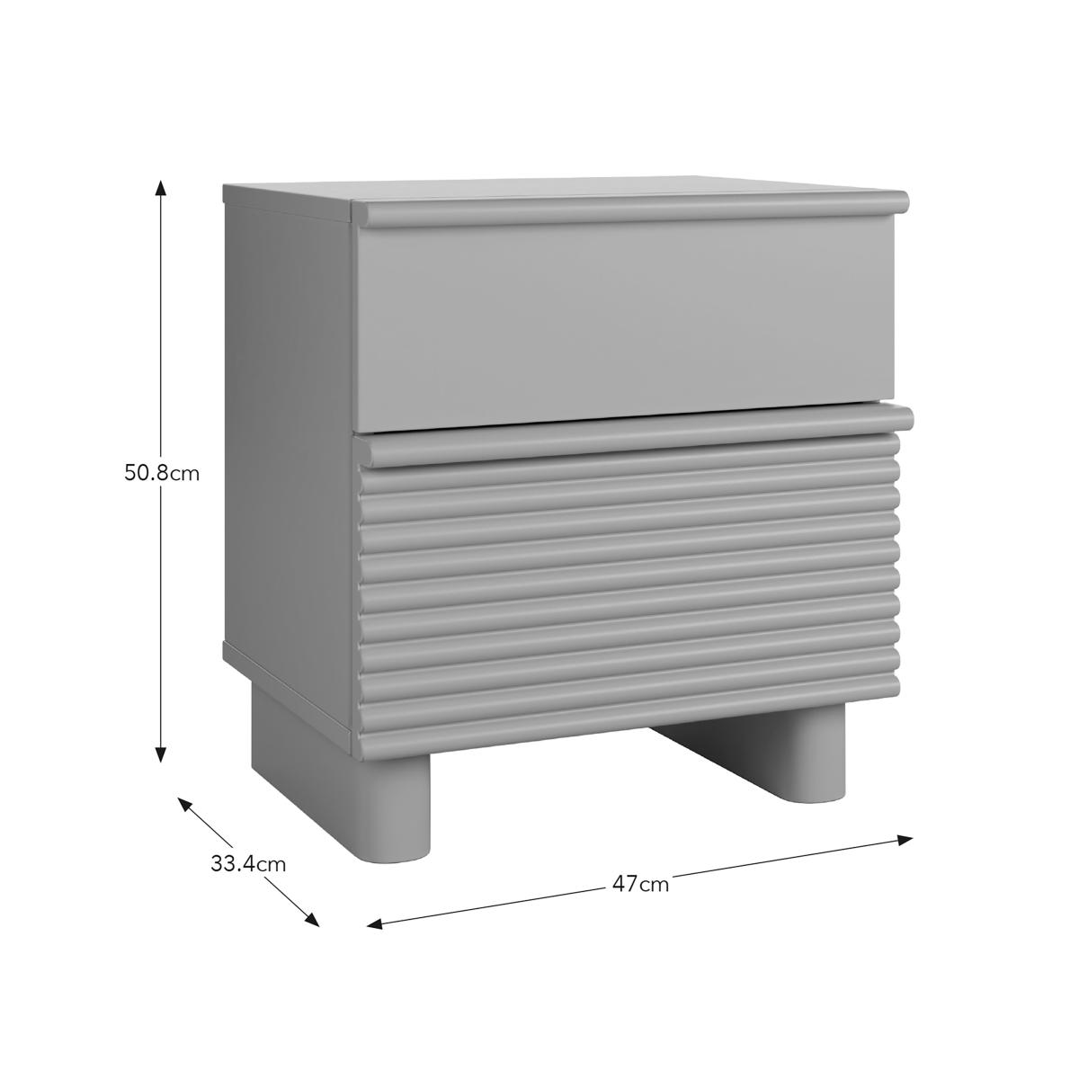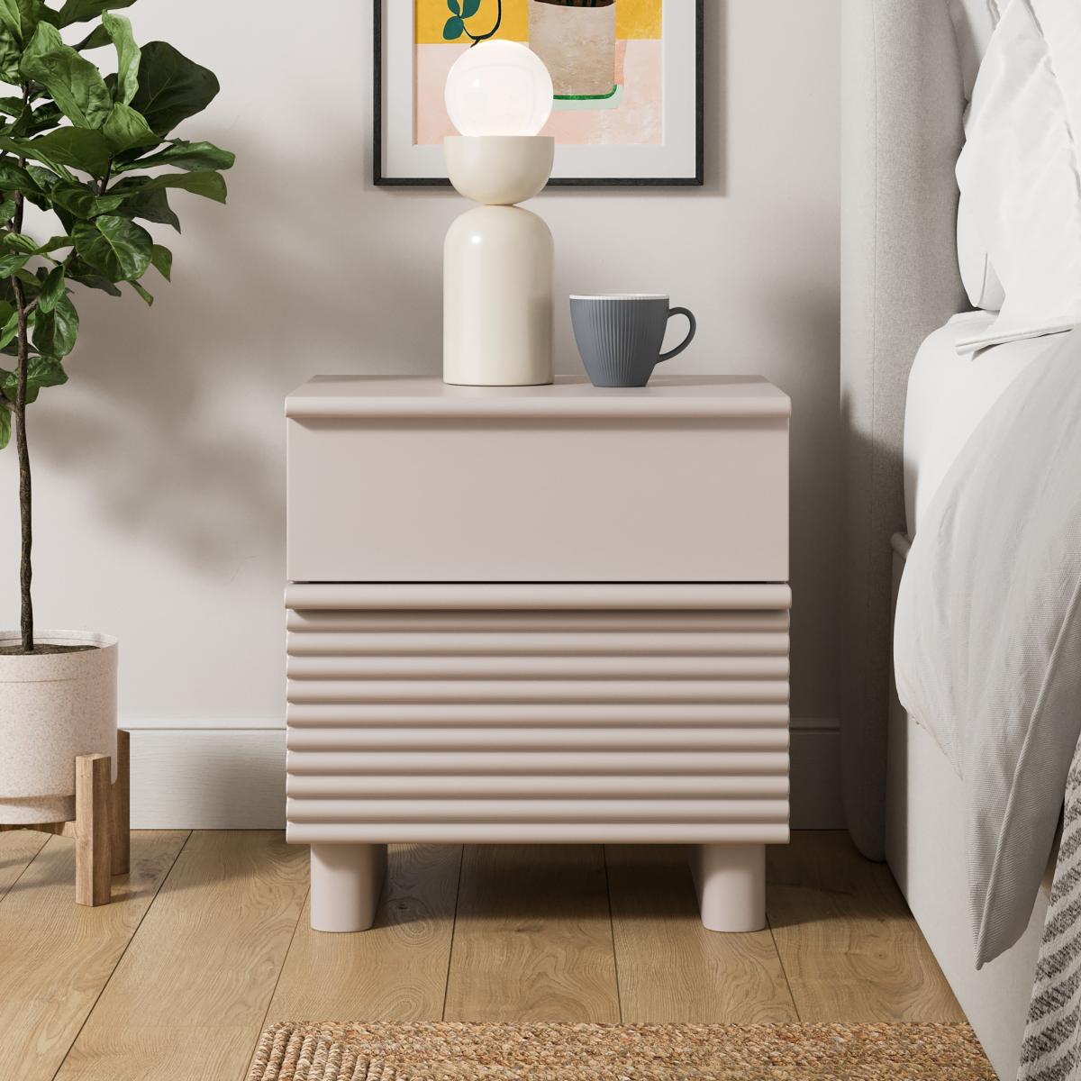 I love this bedside table for its clean, contemporary look and versatile warm grey finish, which easily complements both neutral and coloured interiors. It suits minimalist, Scandi, and modern styles particularly well, adding a subtle touch of texture with its ribbed detail. Practical styling tips include keeping the top surface simple with a lamp, a book, or a small vase, while the drawers are perfect for storing bedtime essentials out of sight. Pairing it with softer textiles like bedding or a cosy throw can add warmth to a sleek space, making it both stylish and functional.