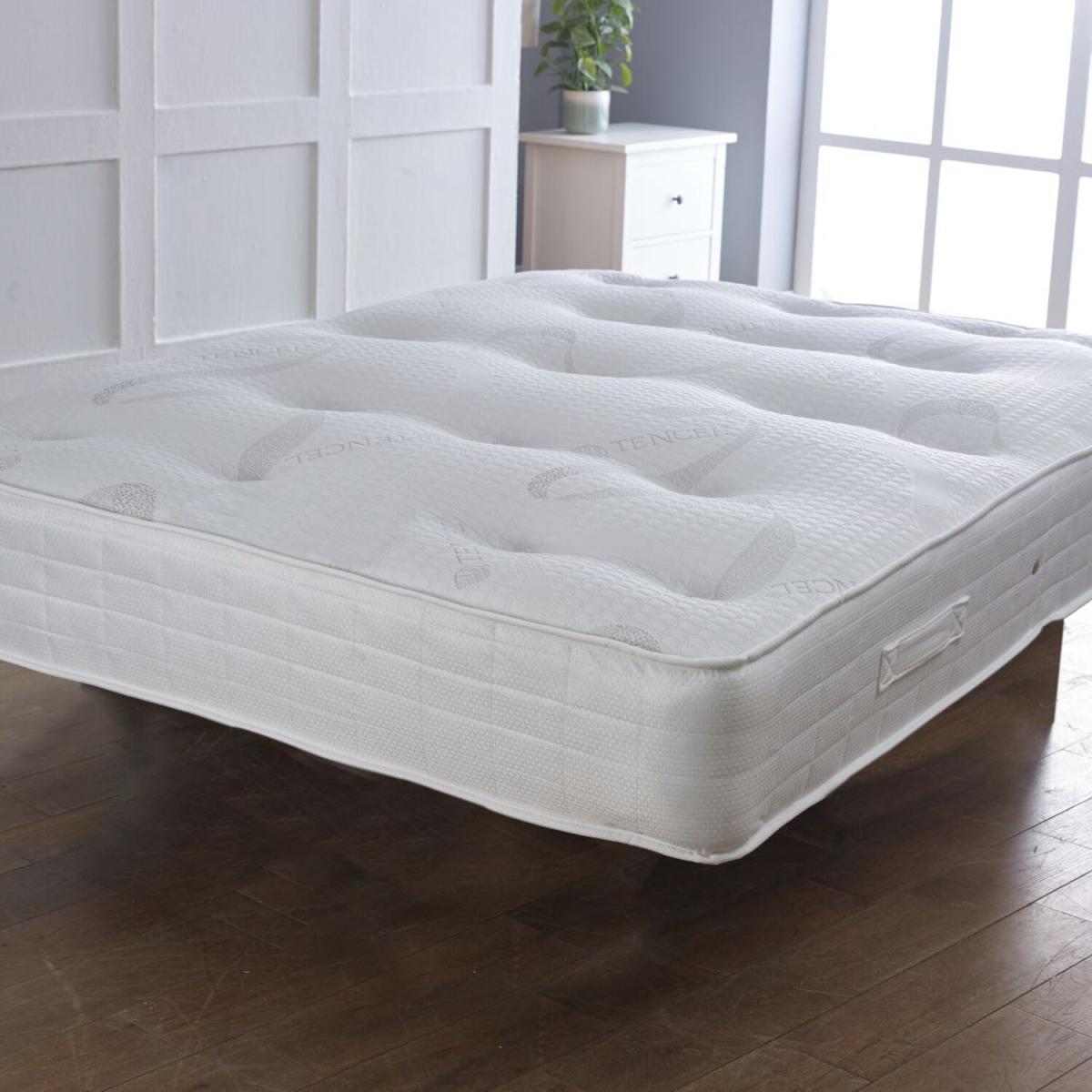 The Buckingham Memory Foam Spring 1000 Pocket Mattress has been carefully designed with a stretch knit fabric for the top panel, super soft on the skin keeping the body cool throughout the night for a comfortable and relaxing night's sleep. Carefully hand tufted with cooling air vents on each side, to allow the flow of air to pass through the mattress to keep it cool, fresh and odour free. The Buckingham mattress has a 1000 pocket spring unit, the individual nested springs allow the weight to be distributed evenly across the mattress cushioning the sleepers body for a medium soft comfort. Added with two deep layer of foam, the top layer of the mattress has a 2" inch layer of next generation open cell Memory Foam, which moulds and shapes to the contours of your body. With a deep layer of Reflex Foam for the bottom layer of the mattress providing a firmer comfort. The mattress has also been designed with an additional 7 individual comfort layers. The mattress is single sided with a hand stitched handles making it easy to rotate keeping it in pristine condition.