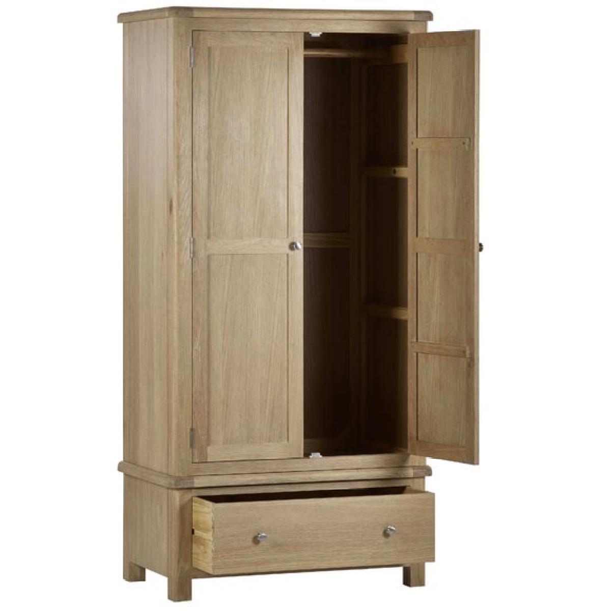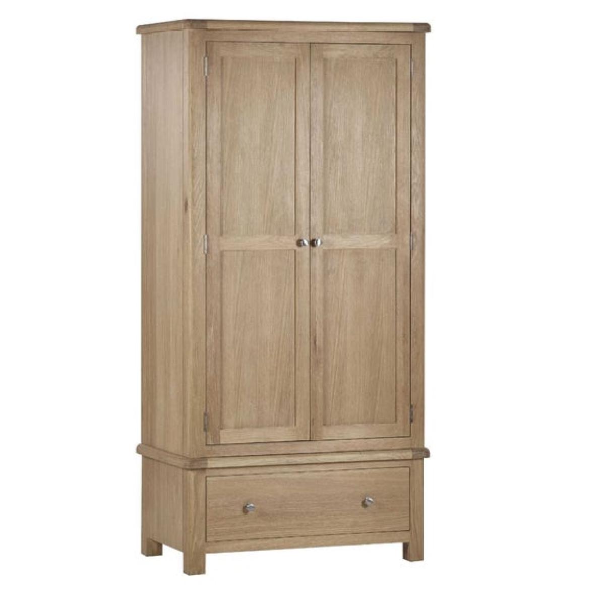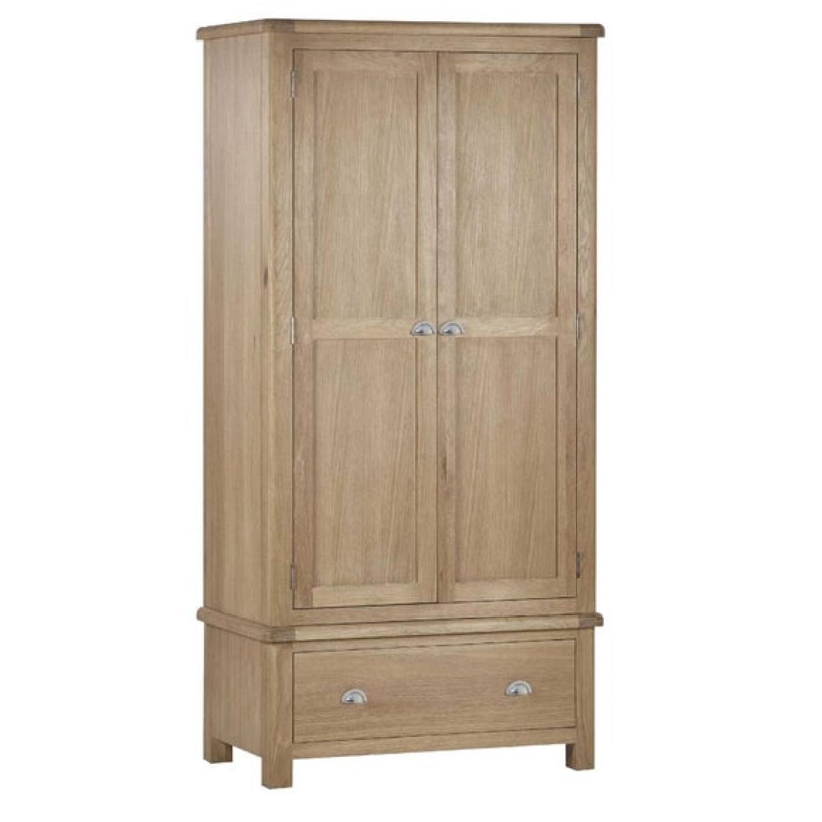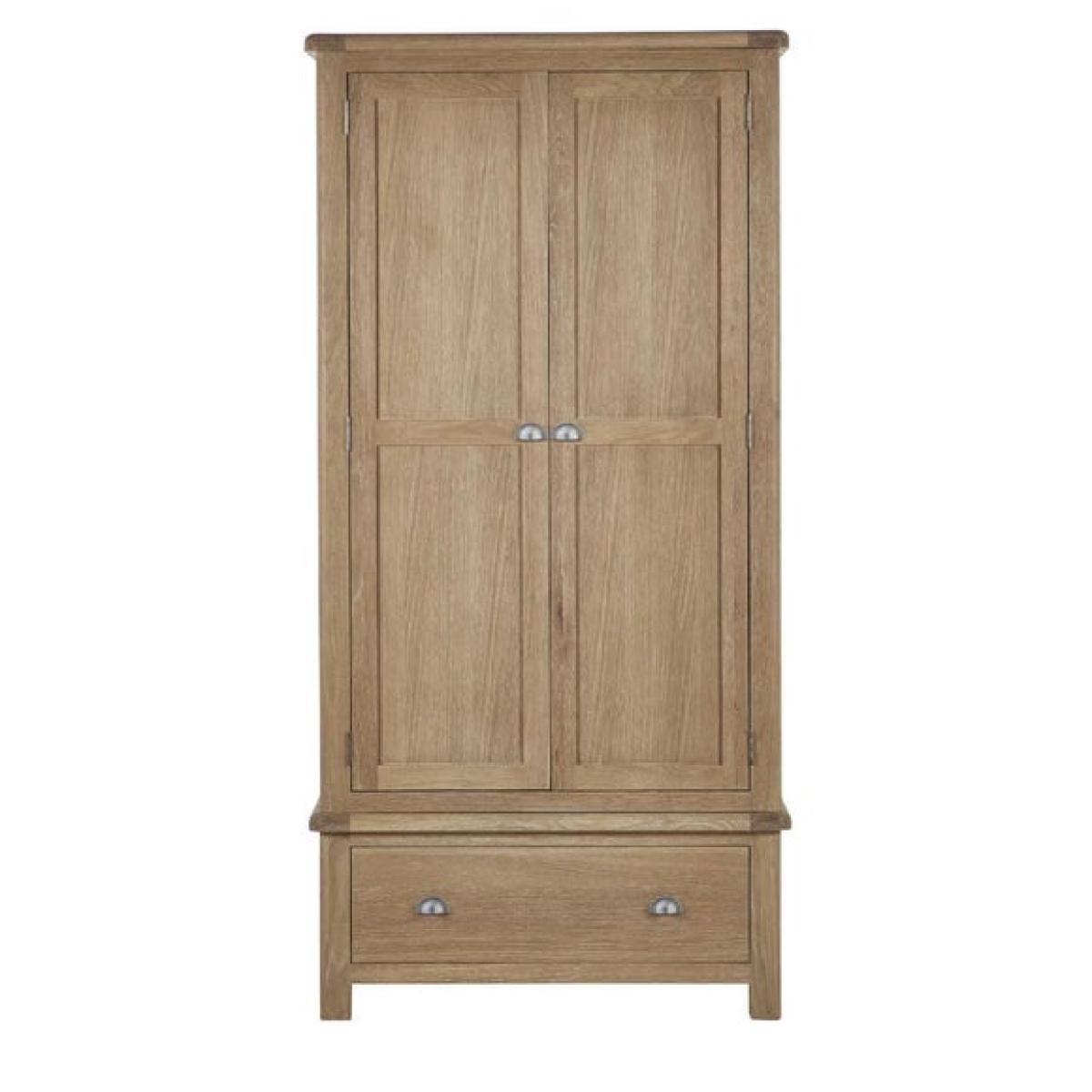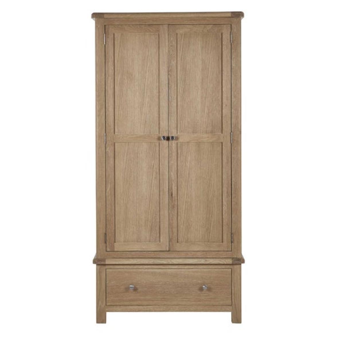 * Contemporary wardrobe * Limed oak finish * Curved edges This wardrobe offers a practical way to keep your clothes organised while adding a touch of elegance to your bedroom. Behind the two doors, you’ll find a full-length hanging space for garments, and the additional drawer provides room for folded items or accessories.