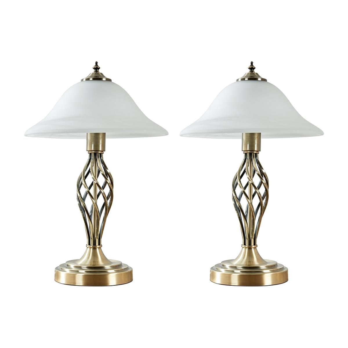 Pair of Traditional style barley twist table lamps in an antique brass metal finish with a frosted alabaster style shade. This contemporary table lamp will make a great addition to any room in your home. Its beautiful twist design matches most interiors whether its modern or traditional. Table lamps are a great way to bring additional lighting to a room or you can use them reduce your main light output, and create a more relaxing moodatmosphere. An instant update, you can change your room style in seconds.