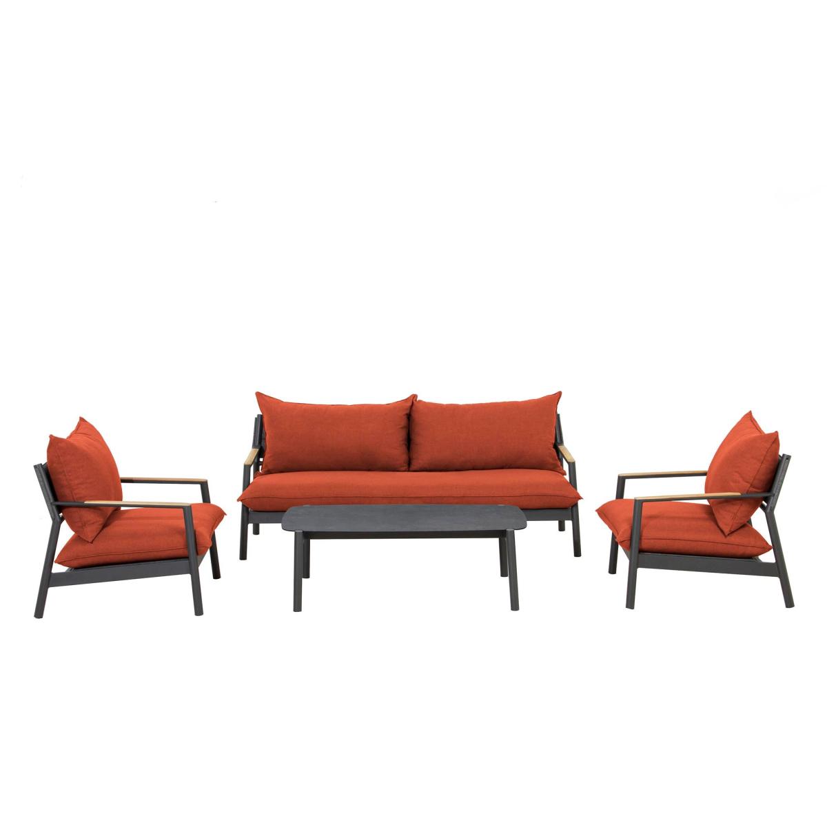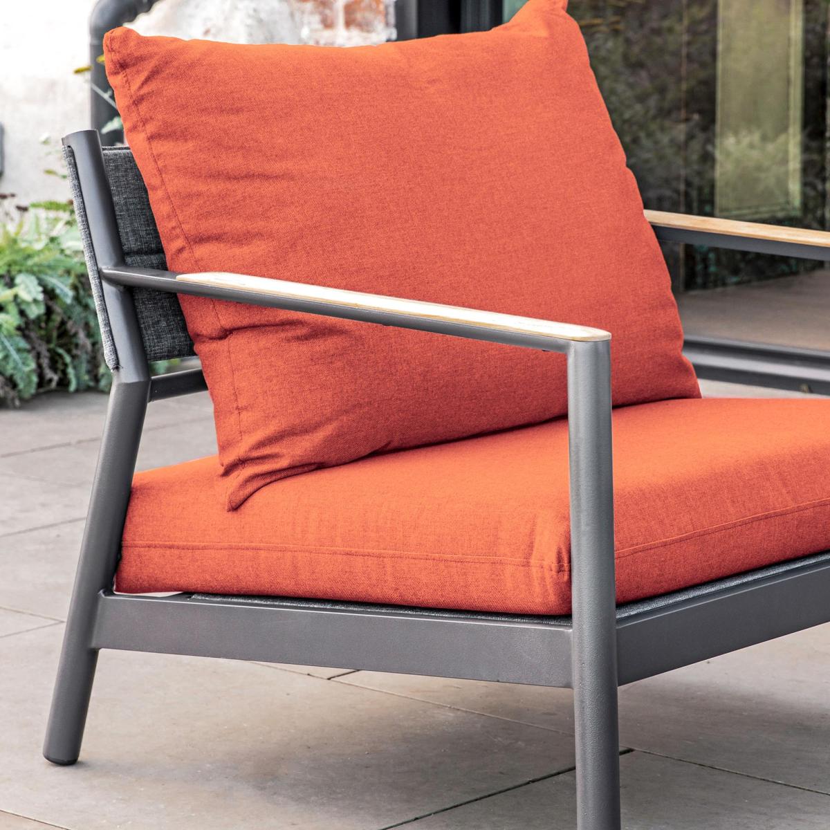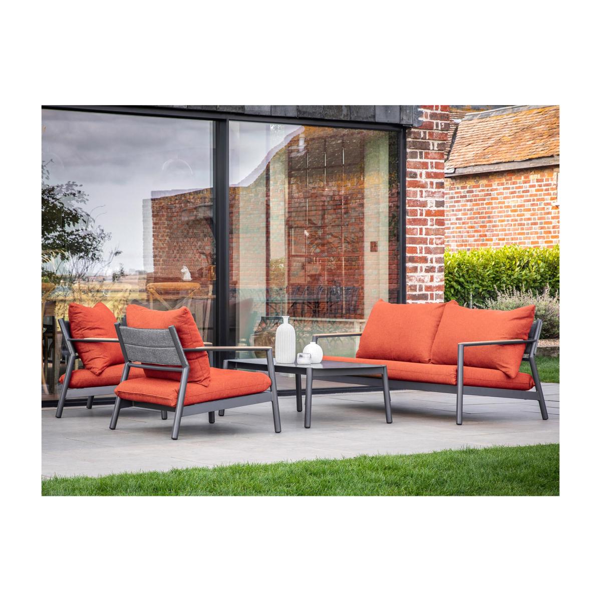 Bring a vibrant splash of colour to your outdoor furniture with the Mende Lounge Set, complete with 2 armchairs, two-seater sofa and a coffee table for a co-ordinated statement set. The stylish and contemporary design is accentuated with luxurious showerproof cushions, in a bold contrasting orange colour to add comfort while the seat frames and the table are crafted from all-weather powder coated aluminium with solid teak on the arms of the seats to add a lovely design feature.