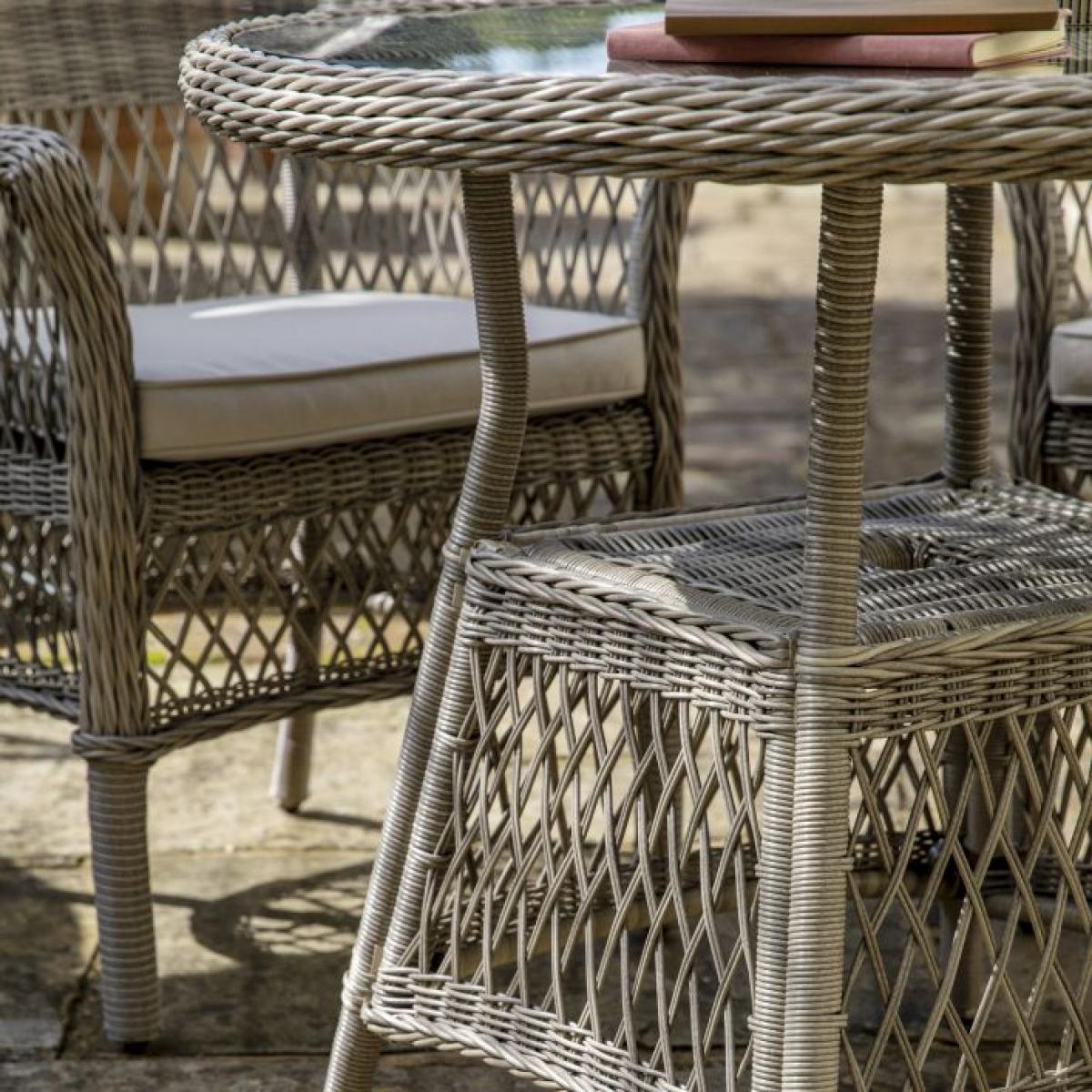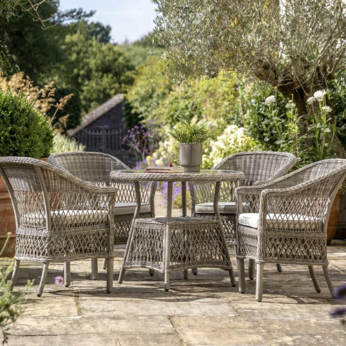 Charming set of 4 dining chairs with a matching glass topped dining table. The chairs have a luxurious showerproof seat cushions in a soft colour to complement the colour of the rattan while the practical table features a handy storage shelf and parasol hole. Made from all weather hand woven PE rattan with an eye catching combination of open weave and close weave patterns, all in a neutral stone colour. Also available as a 6 seater option and complementary to our Sofa Dining/Tea Set.