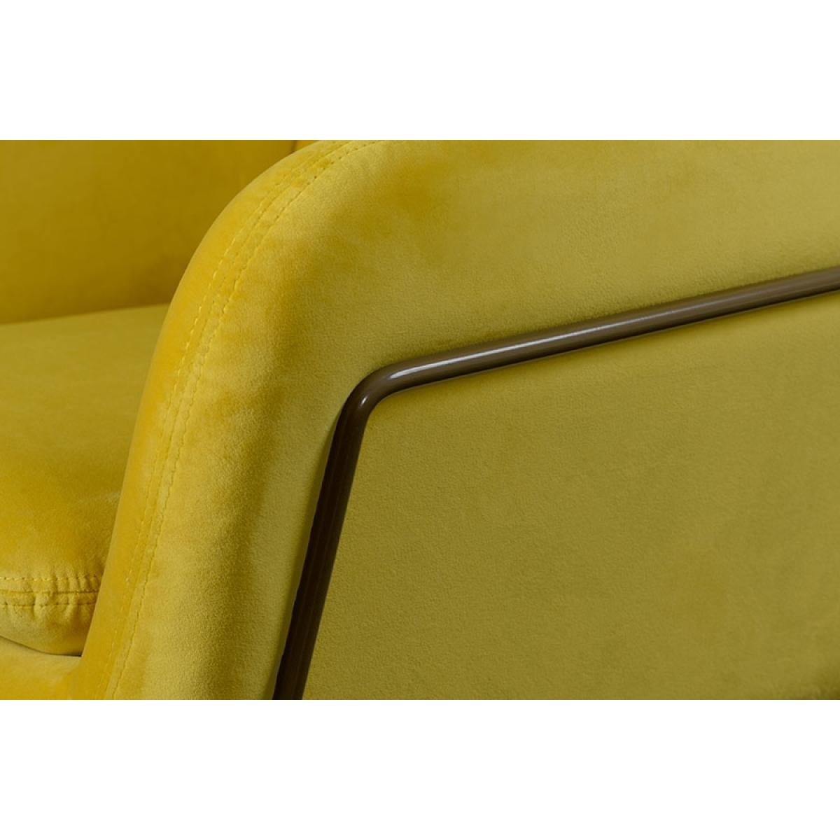 A striking armchair with a strong sculptural form. Distinctive external frame with powder coated brass coloured finish. Comfortable sprung seat. Velvet upholstery fabric. Supplied with removeable protective feet. Supplied fully assembled.