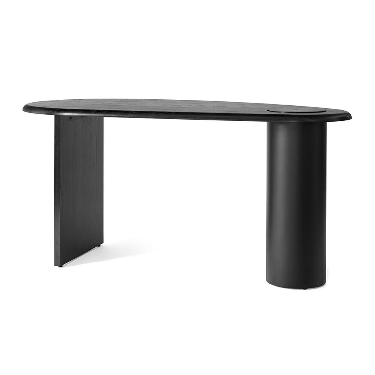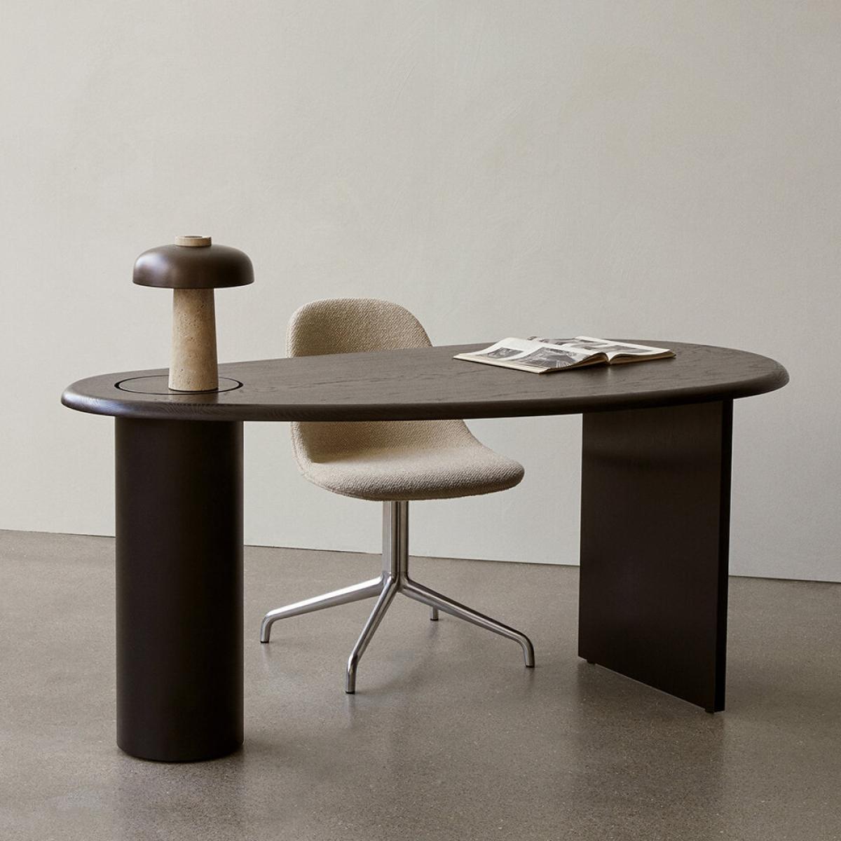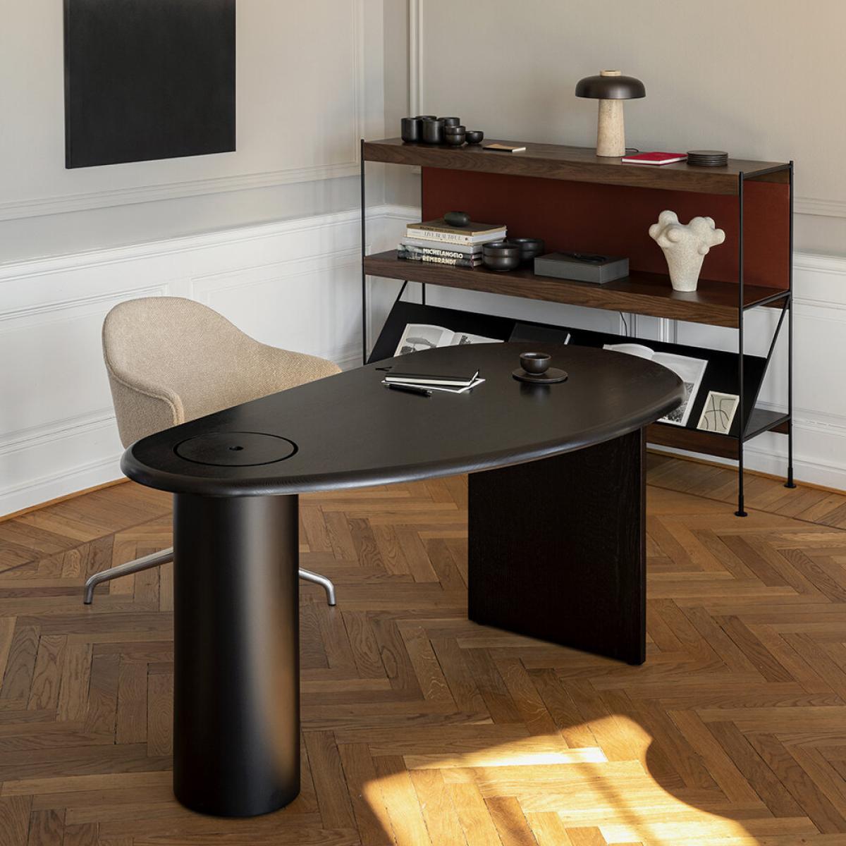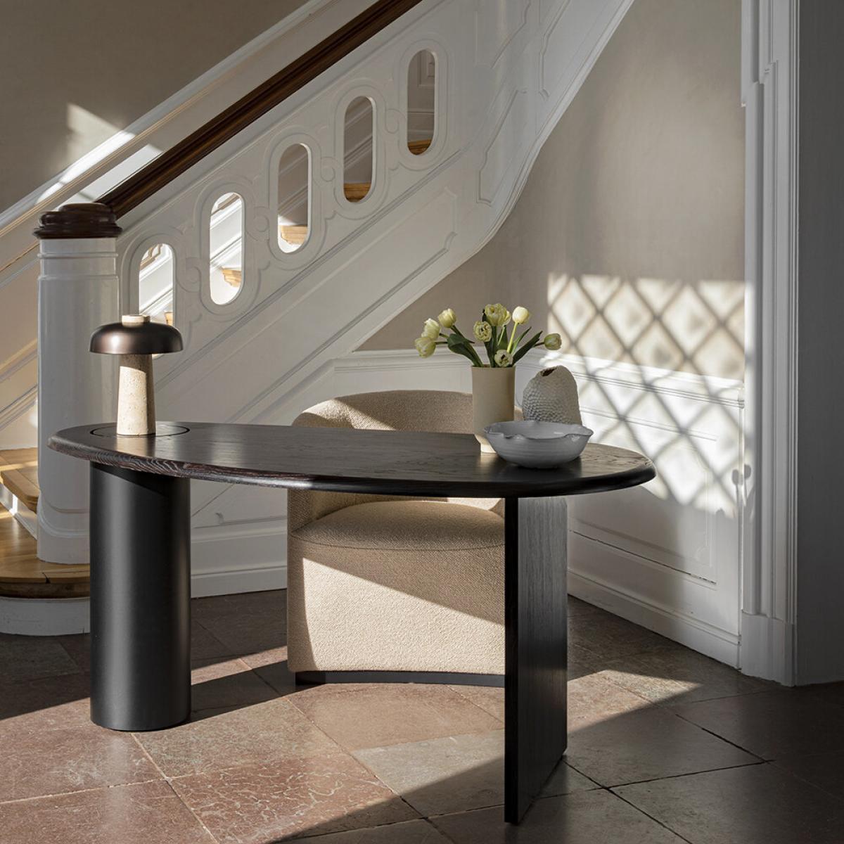 The Eclipse desk from MENU has a distinctive silhouette. Made from solid dark-oiled oak, the tabletop is fitted with a lid that lifts to reveal a hidden storage bucket in the column leg. A striking piece for your home office, its intriguing form makes a bold statement in any space.