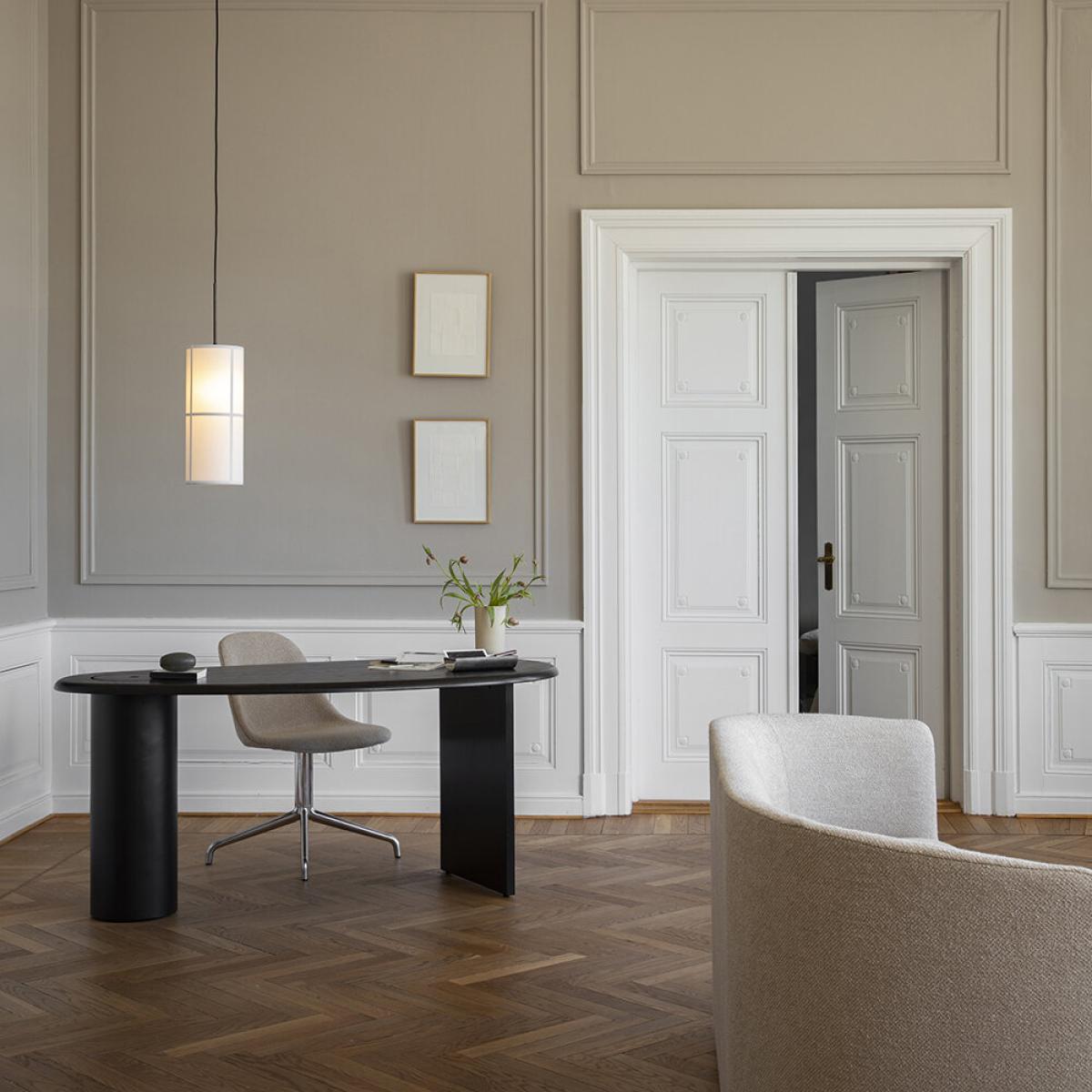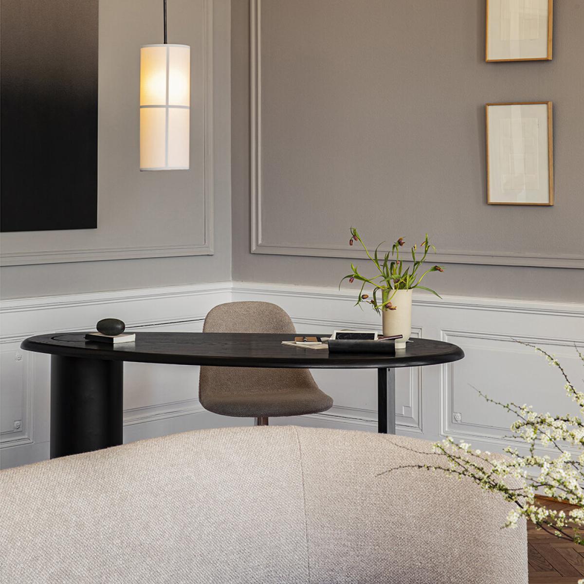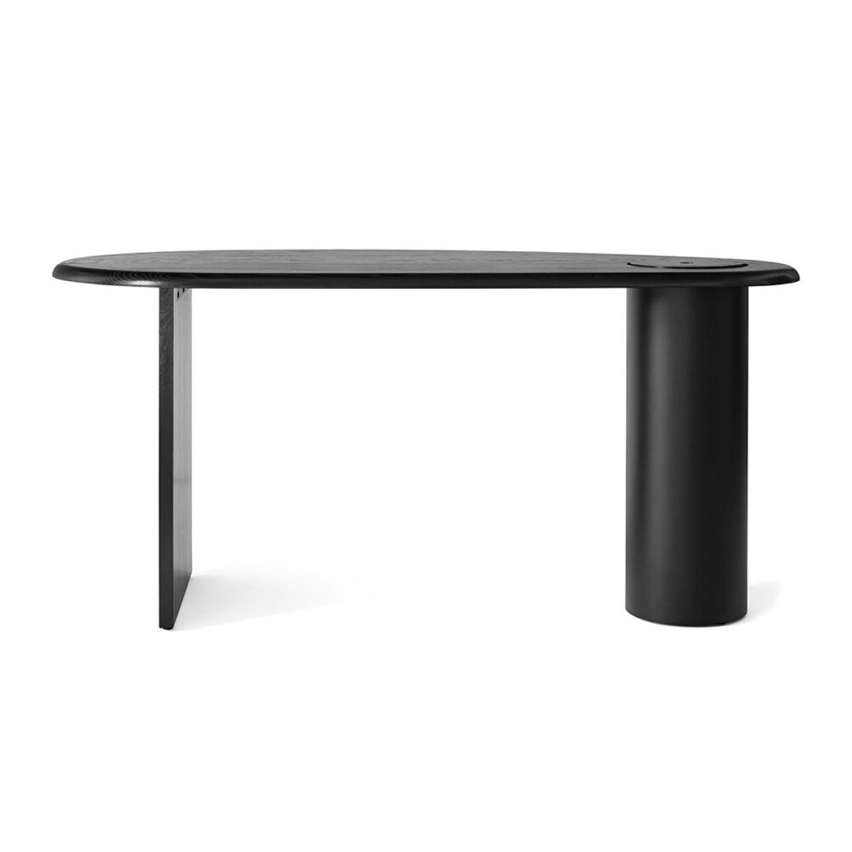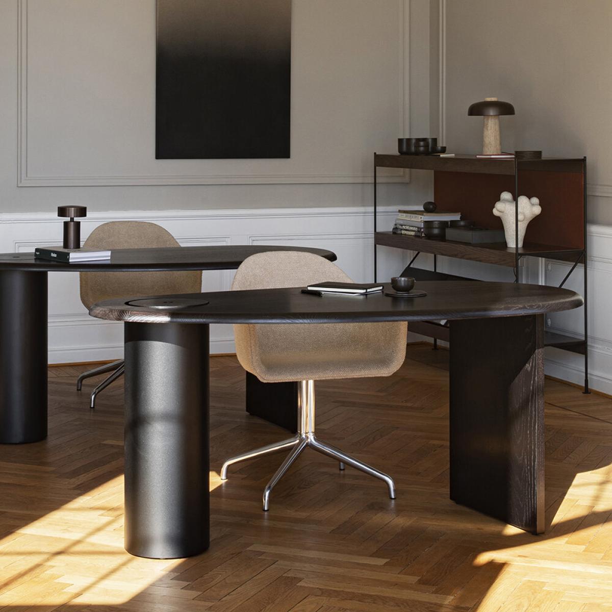 The Eclipse desk from MENU has a distinctive silhouette. Made from solid dark-oiled oak, the tabletop is fitted with a lid that lifts to reveal a hidden storage bucket in the column leg. A striking piece for your home office, its intriguing form makes a bold statement in any space.