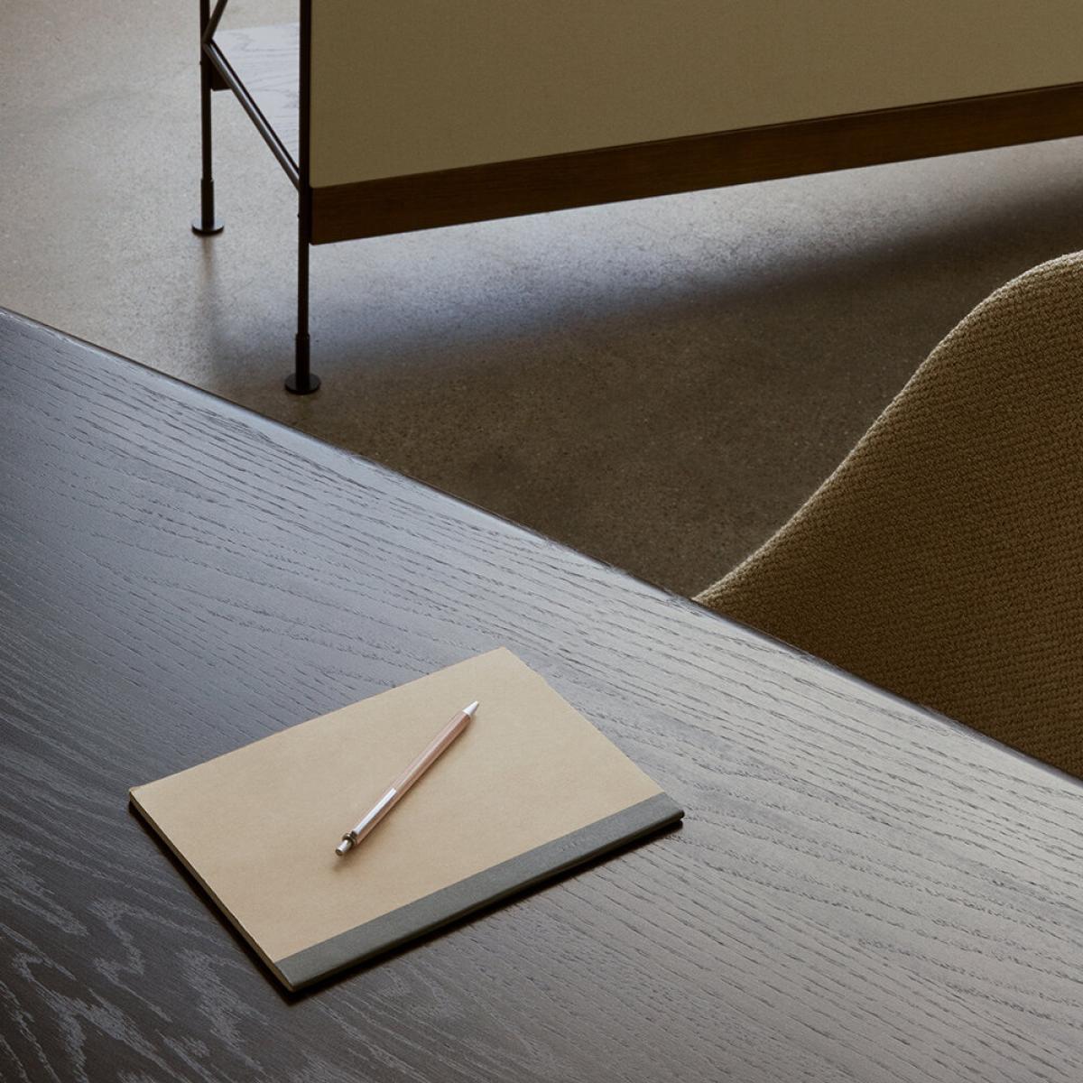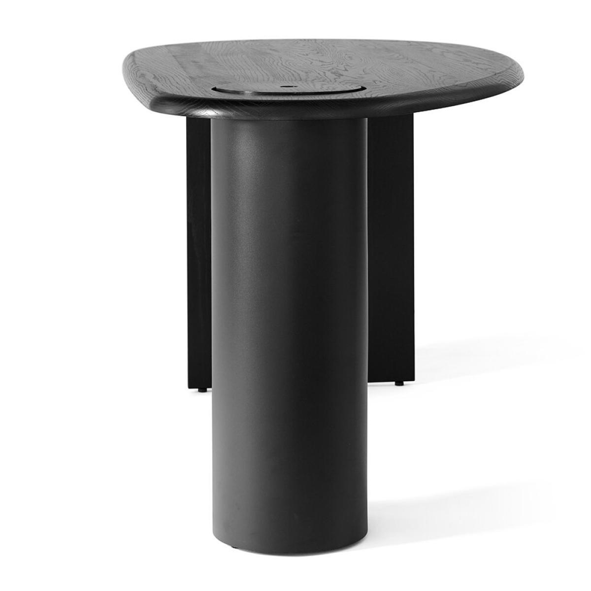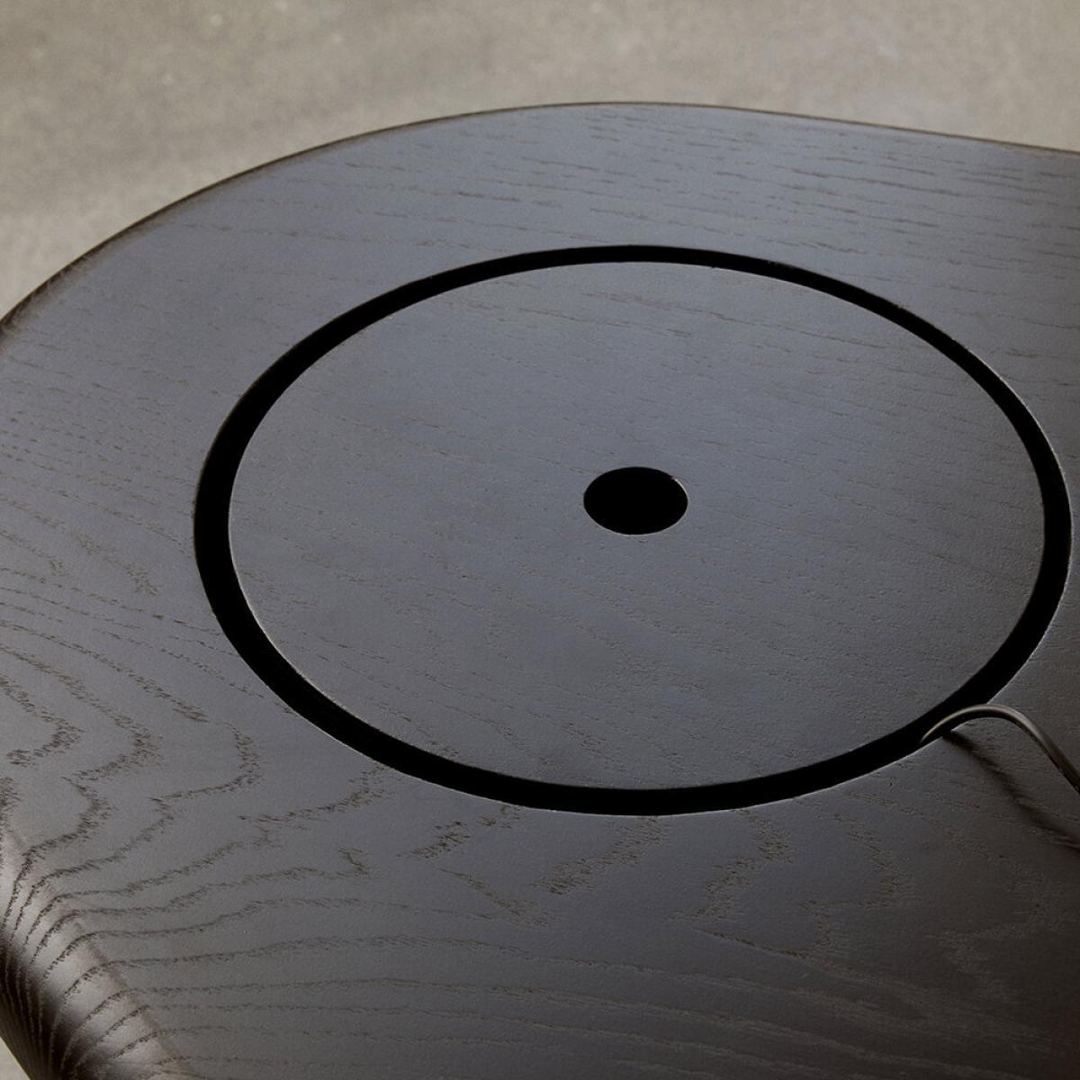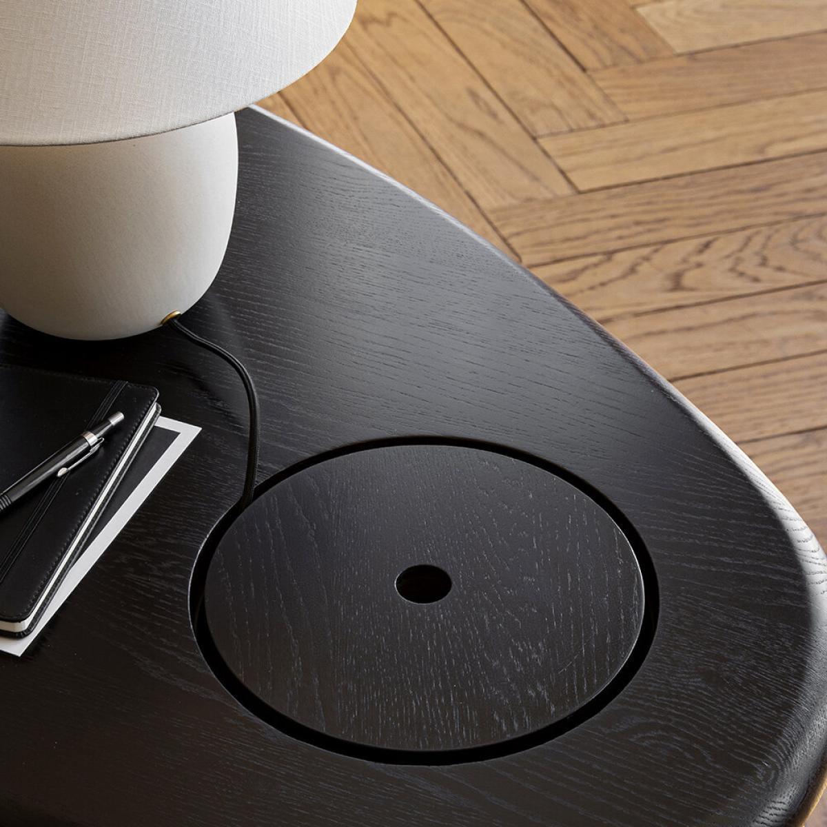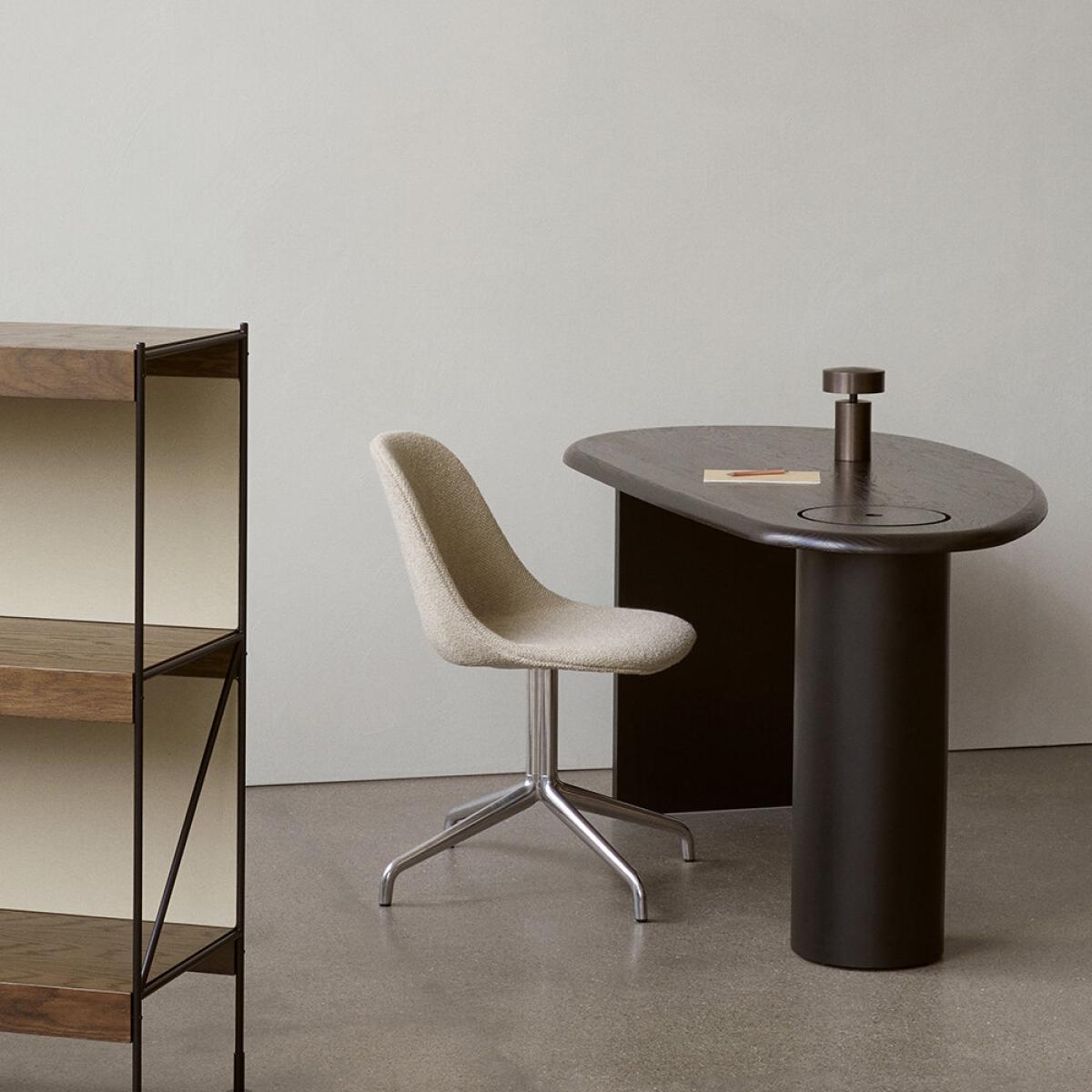 The Eclipse desk from MENU has a distinctive silhouette. Made from solid dark-oiled oak, the tabletop is fitted with a lid that lifts to reveal a hidden storage bucket in the column leg. A striking piece for your home office, its intriguing form makes a bold statement in any space.