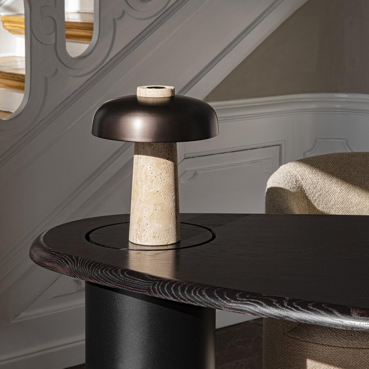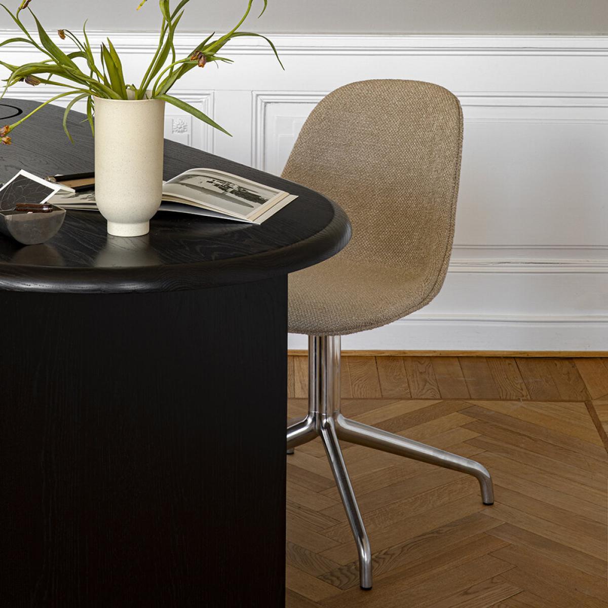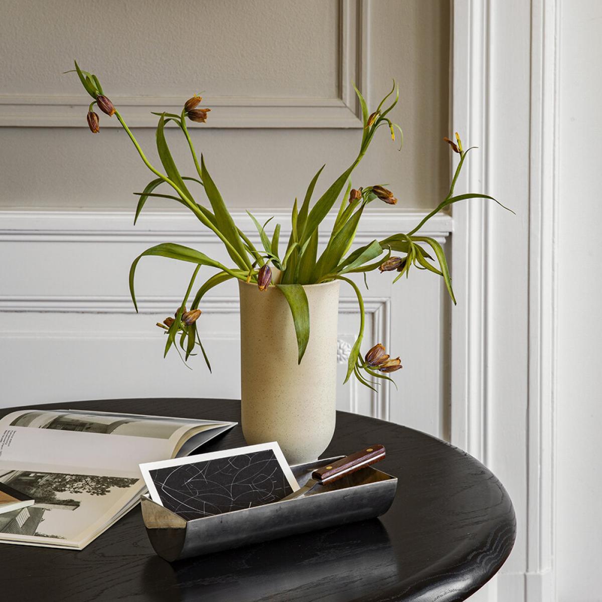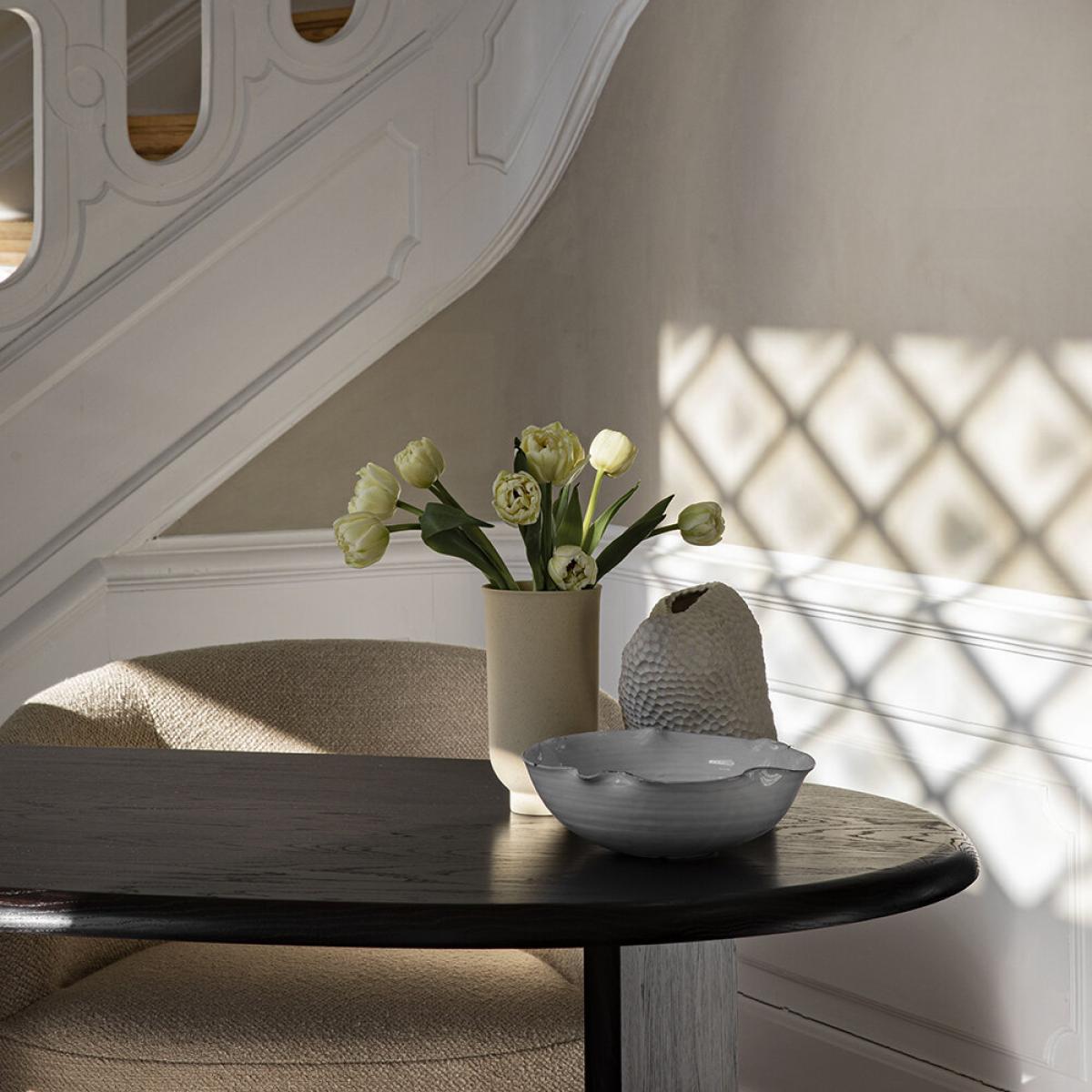 The Eclipse desk from MENU has a distinctive silhouette. Made from solid dark-oiled oak, the tabletop is fitted with a lid that lifts to reveal a hidden storage bucket in the column leg. A striking piece for your home office, its intriguing form makes a bold statement in any space.