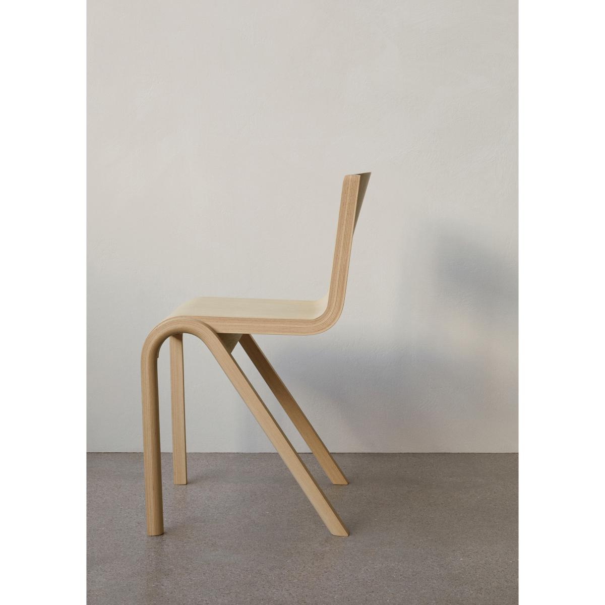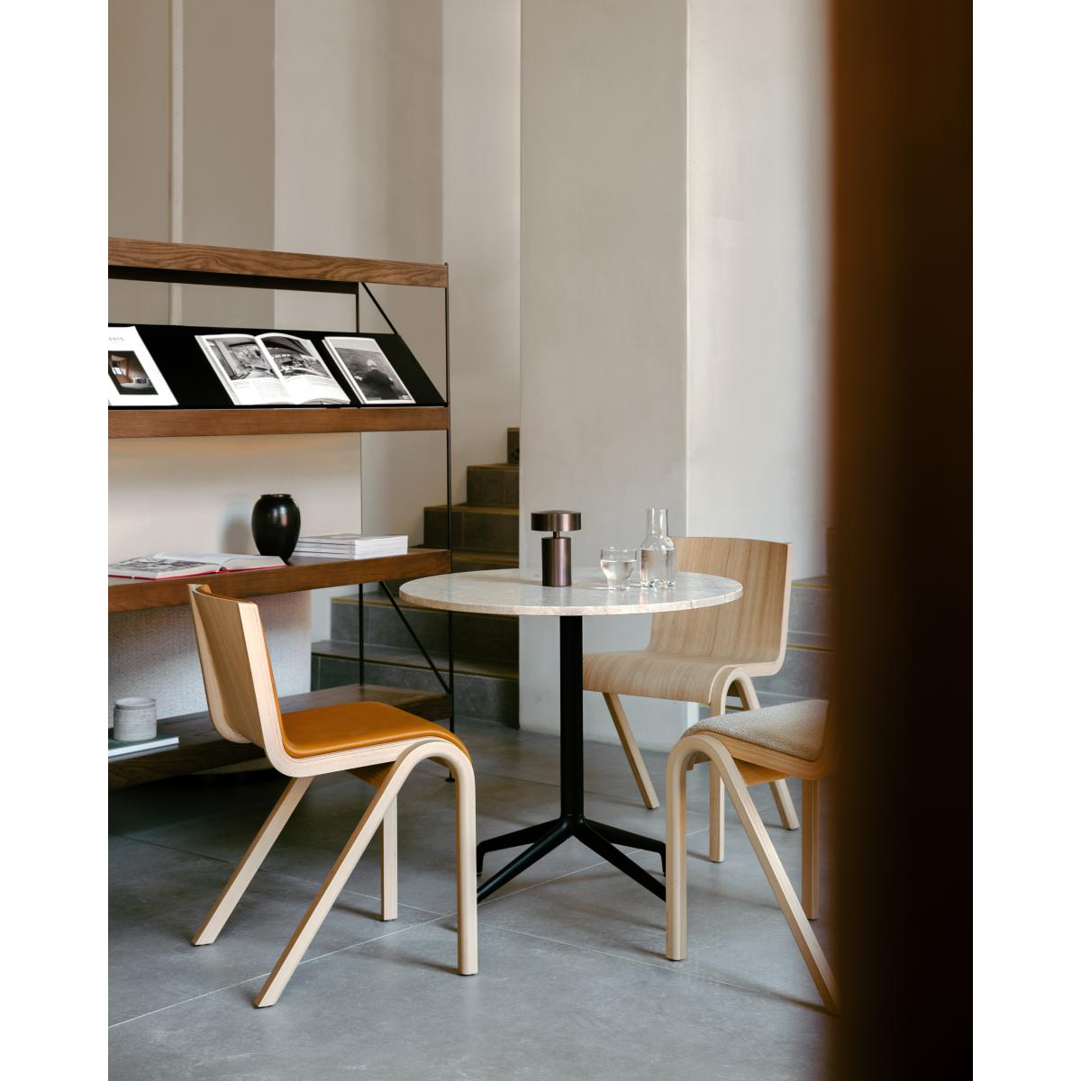 The Ready dining chair from Audo Copenhagen is designed by Matias Moellenbach and Nick Rasmussen and is a molded chair in beech and FSC-certified oak veneer. The chair's cantilevered seat and backrest appear to be made in one piece, creating an airy impression. Ready is a stackable chair that takes up minimal space thanks to its design.