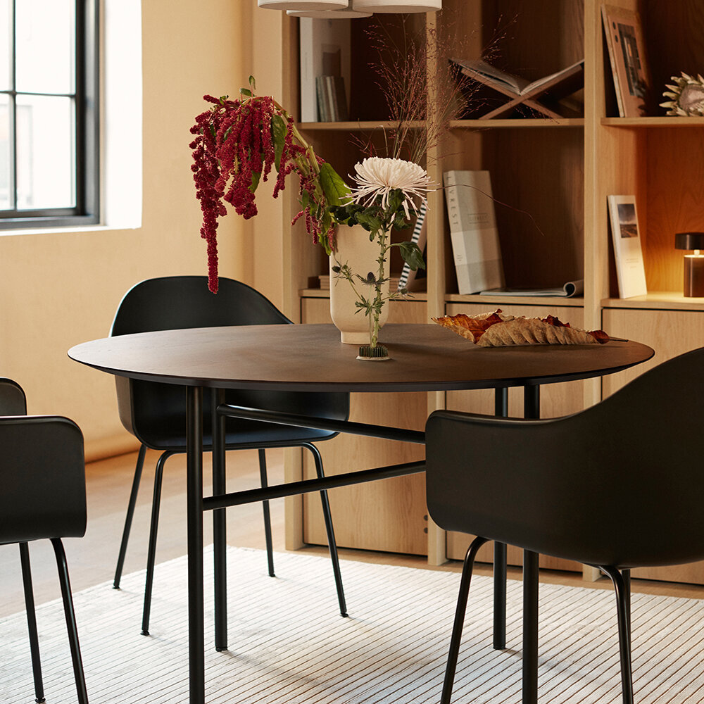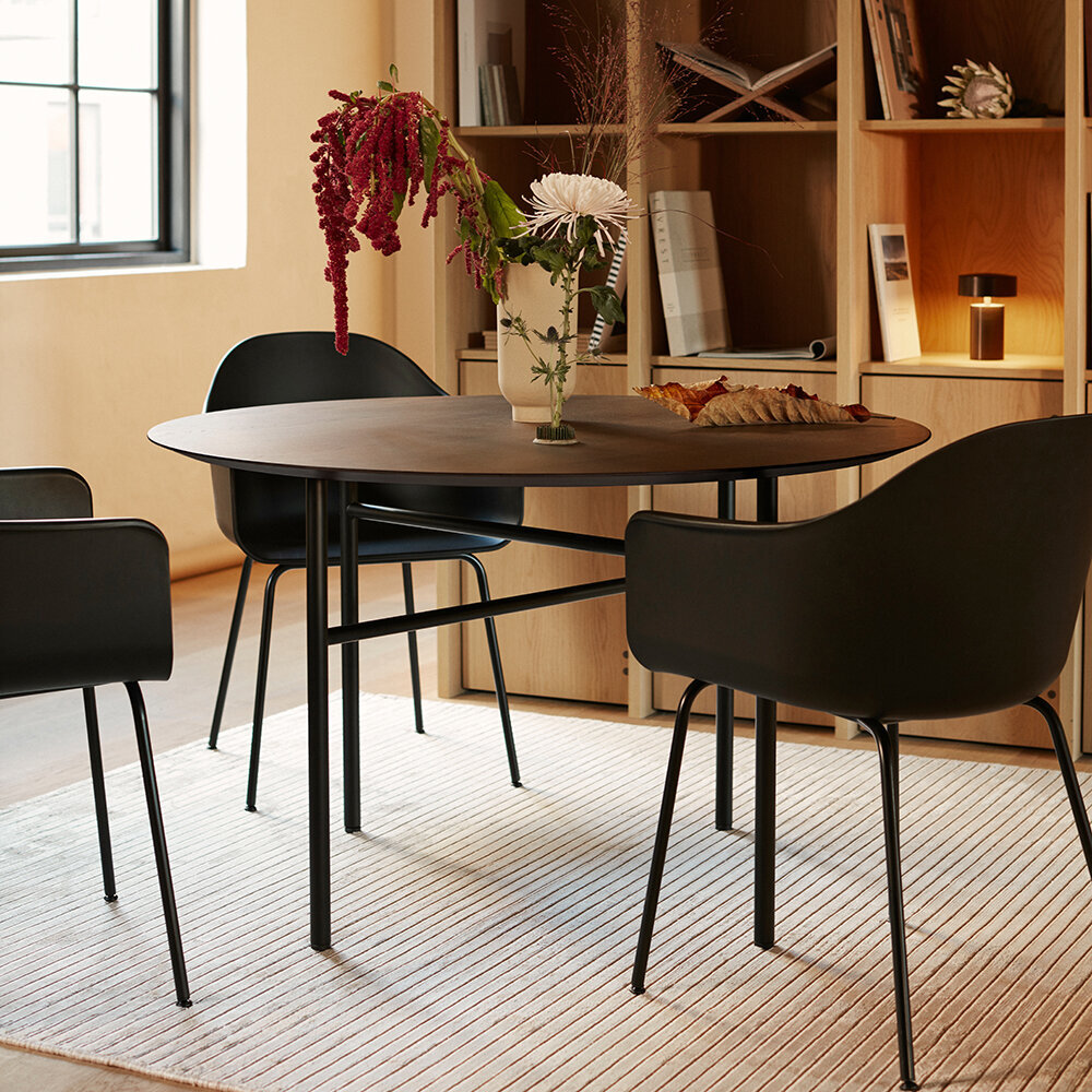 Dine in style with this Snaregade Round Dining Table from Menu. With a dark stained oak top and slender black legs, this elegant and minimalist design will give your home an elegant look. Available in two sizes.