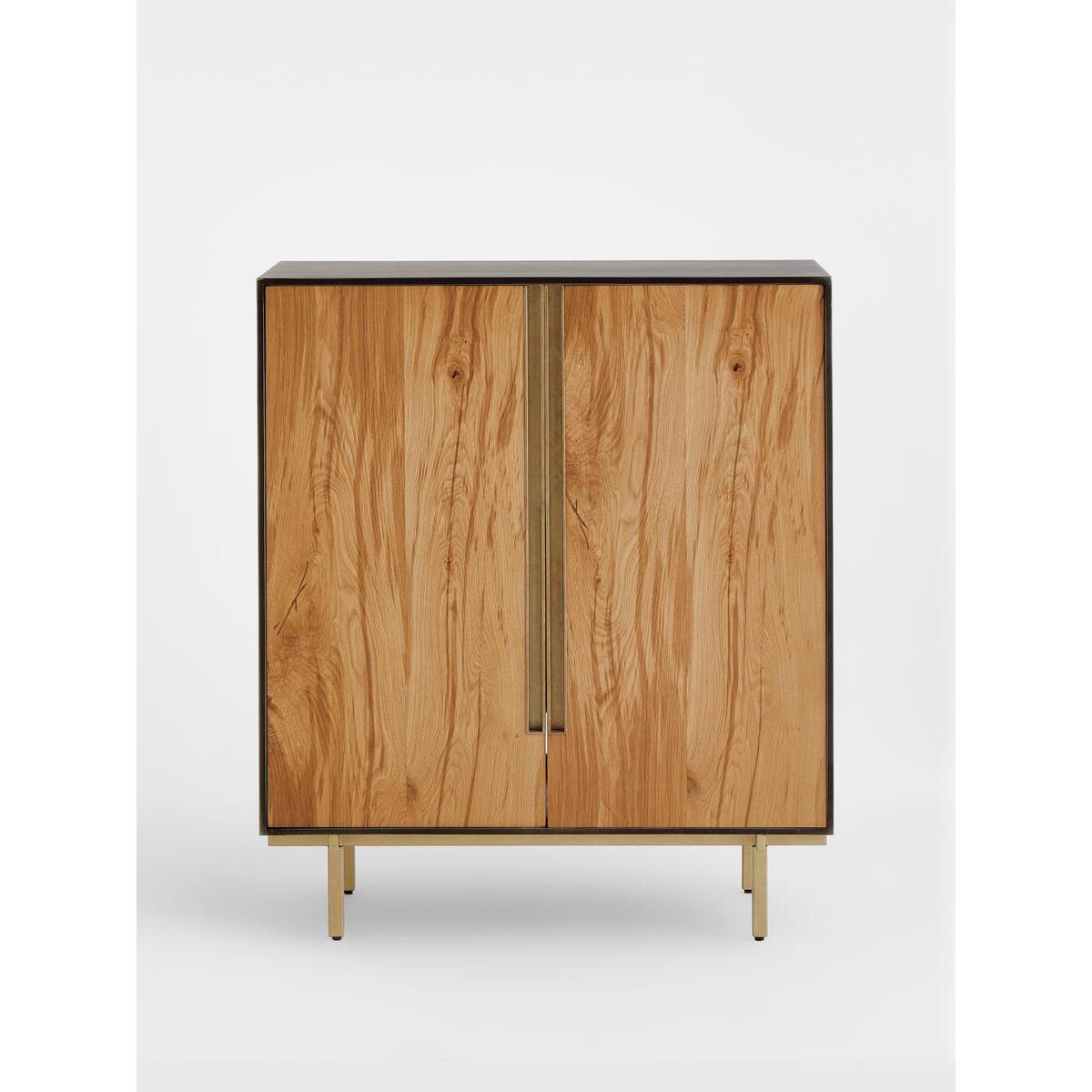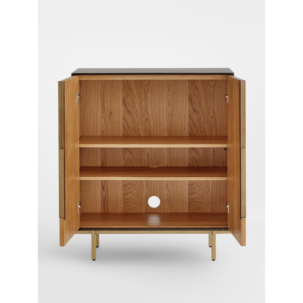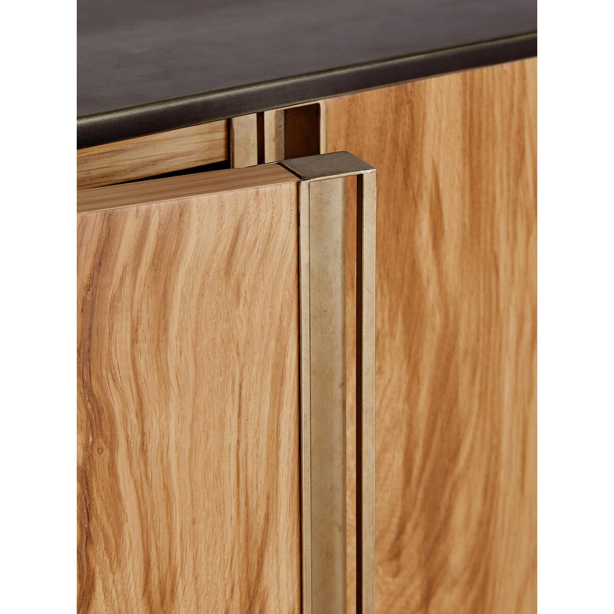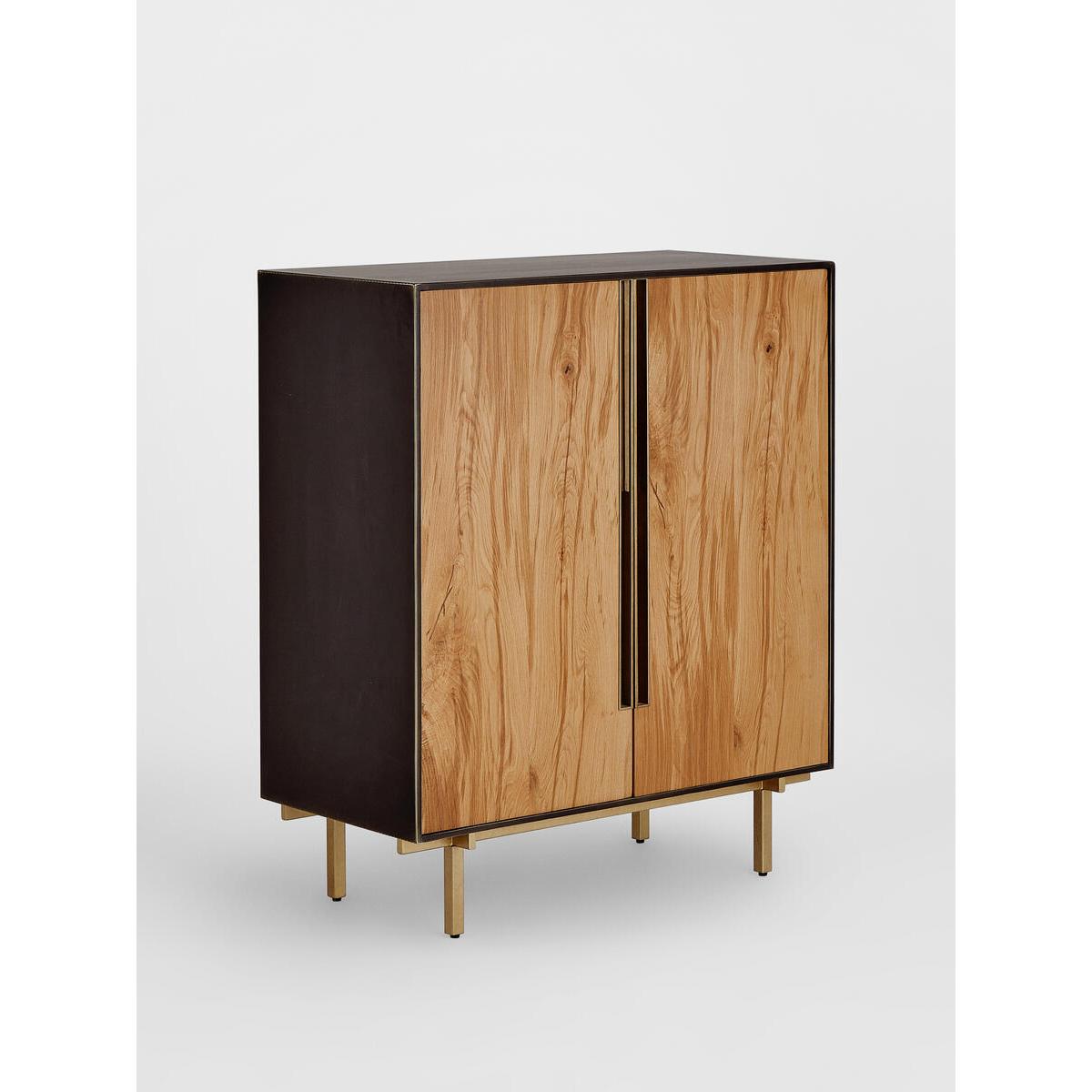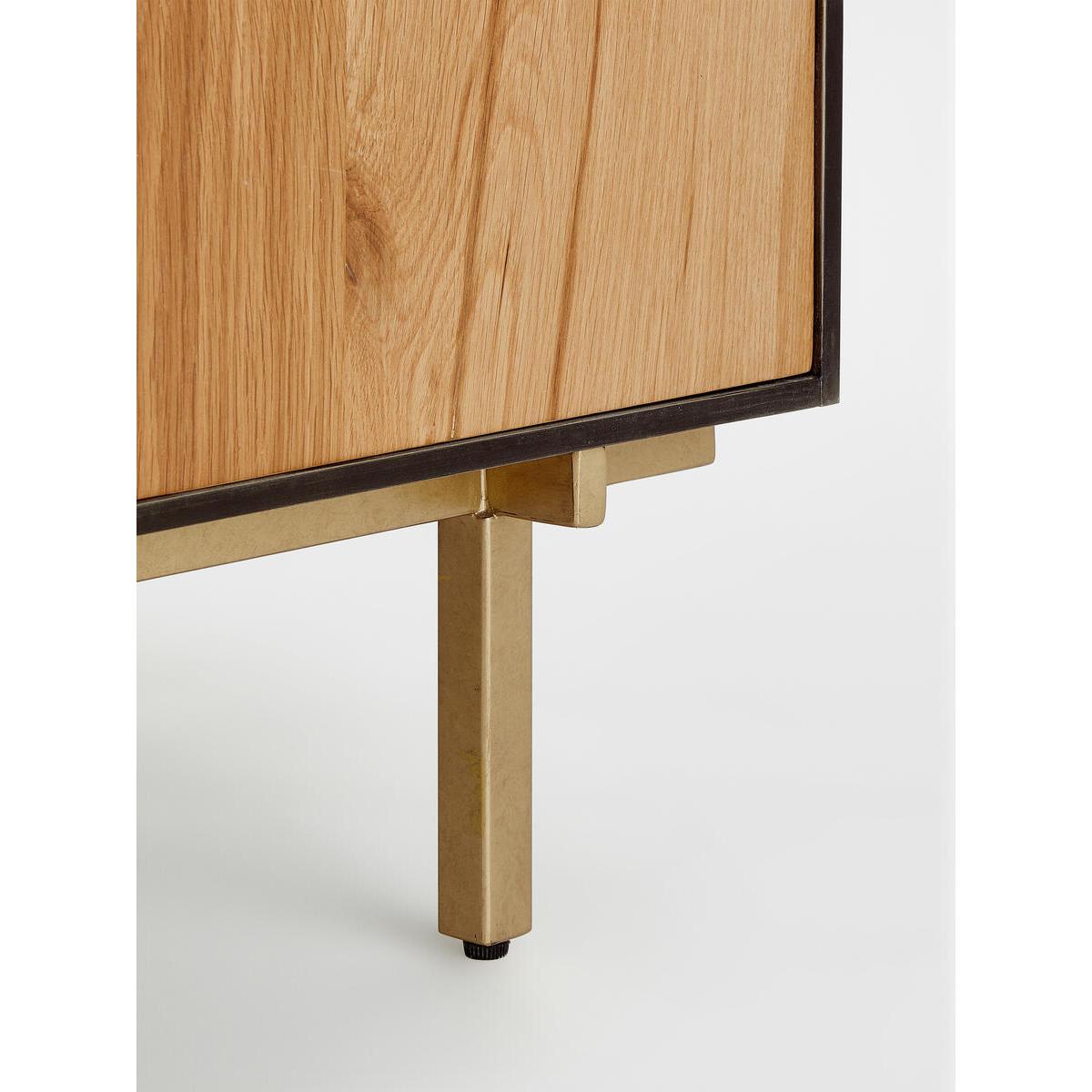 Our Mercer cabinet is made from French oak, combined with cleansteel and antique brass detailing to highlight the splits in thetimber - a natural characteristic of reclaimed French oak. Thedesign echoes the furniture found in our lounge spaces at Soho House Amsterdam, set inside the historic Bungehuis building. French oak veneered doors. Blackened brass-finish metal frame. Antique brass-finish legs and hardware. Splits in the timber are a natural characteristic of reclaimed. French oak. Adjustable and removable shelves with cut-out detail forcables. Statement brass and steel accents. Inspired by Soho House Amsterdam.