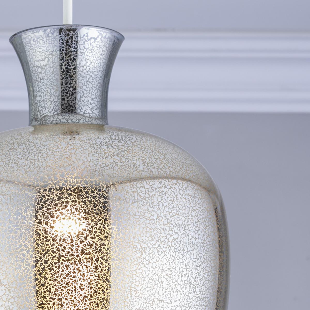 A glamorous and modern choice for your hanging light fixtures, this Mercury Crackle Effect Pendant features a sleek domed design with a tapered vase-like top and is presented in a silvery metallic tone. Its gorgeous crackle effect turns your light into a gorgeous decorative feature and casts a stunning pattern as your bulb illuminates your room.