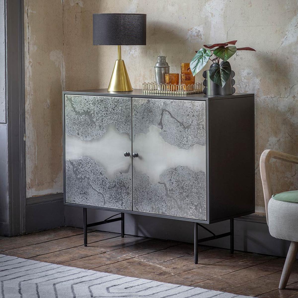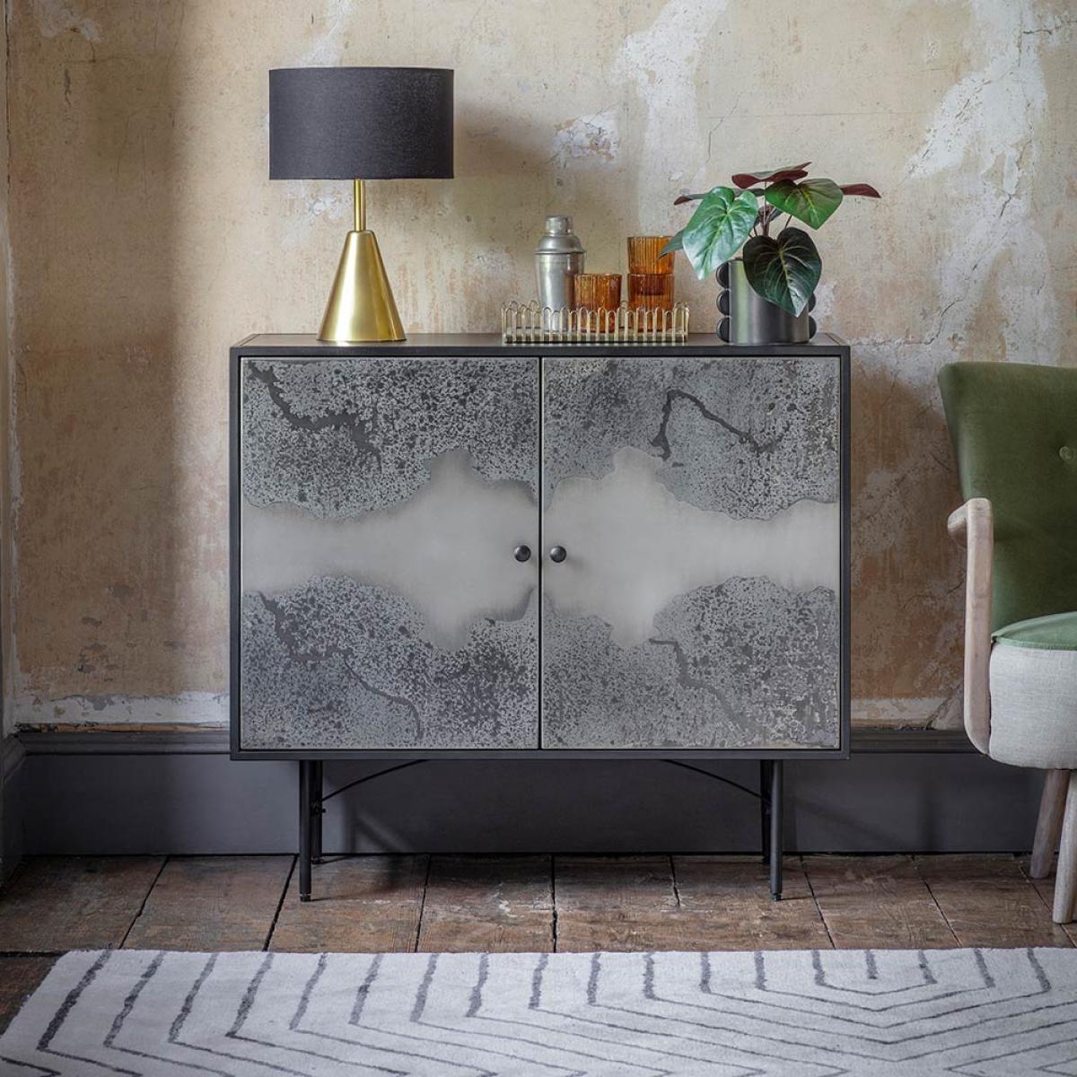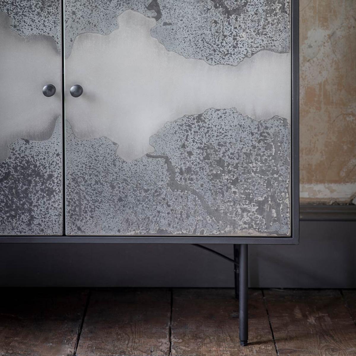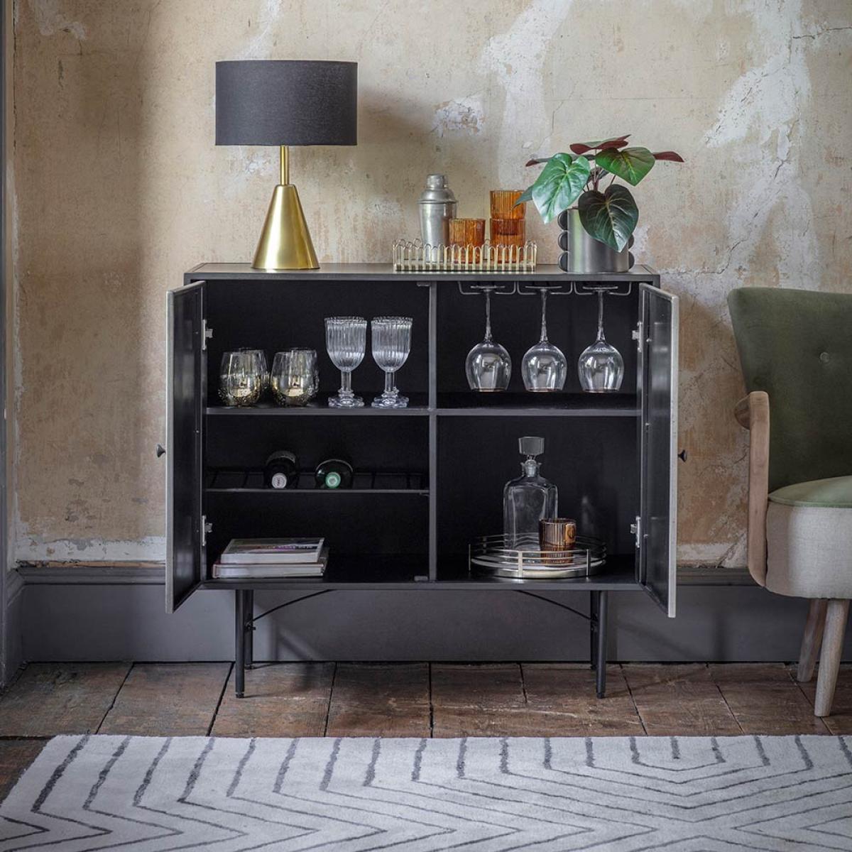 Make a statement in the dining room, living space or open-plan kitchen with our new Mercury Drinks Cabinet, which is perfect for entertaining. Its powder coated iron design features an intricate detailed finish on the double doors while the slimline matching legs create a Mid Century Modern feel, making this piece ideal for both classic and contemporary interiors. Inside, there is plenty of space for glasses, bottles, cocktail kits and decanters as well a hanging rack for wine glasses. Use to store and serve after-dinner drinks as well as extra sideboard-style storage for lamps, plants and nibbles for guests.
