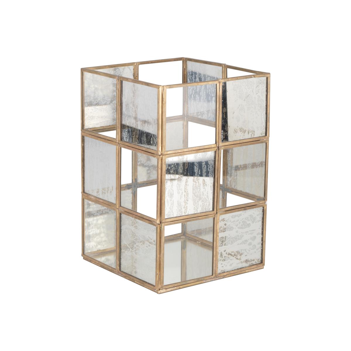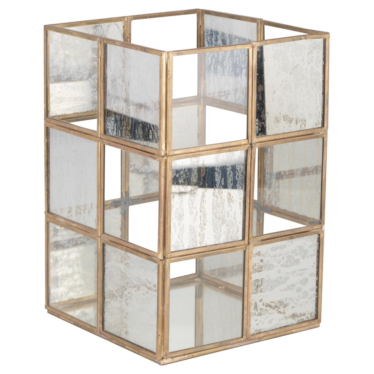 A stunning way to create inviting ambience in any room, this Mercury Effect Lantern is fashioned with an antique bronze frame in a rectangular form and features a mirrored base to bounce light upwards. Its walls are filled with alternating panels of clear and mercury-effect glass, allowing the glow of your pillar candle or tea light to filter through.