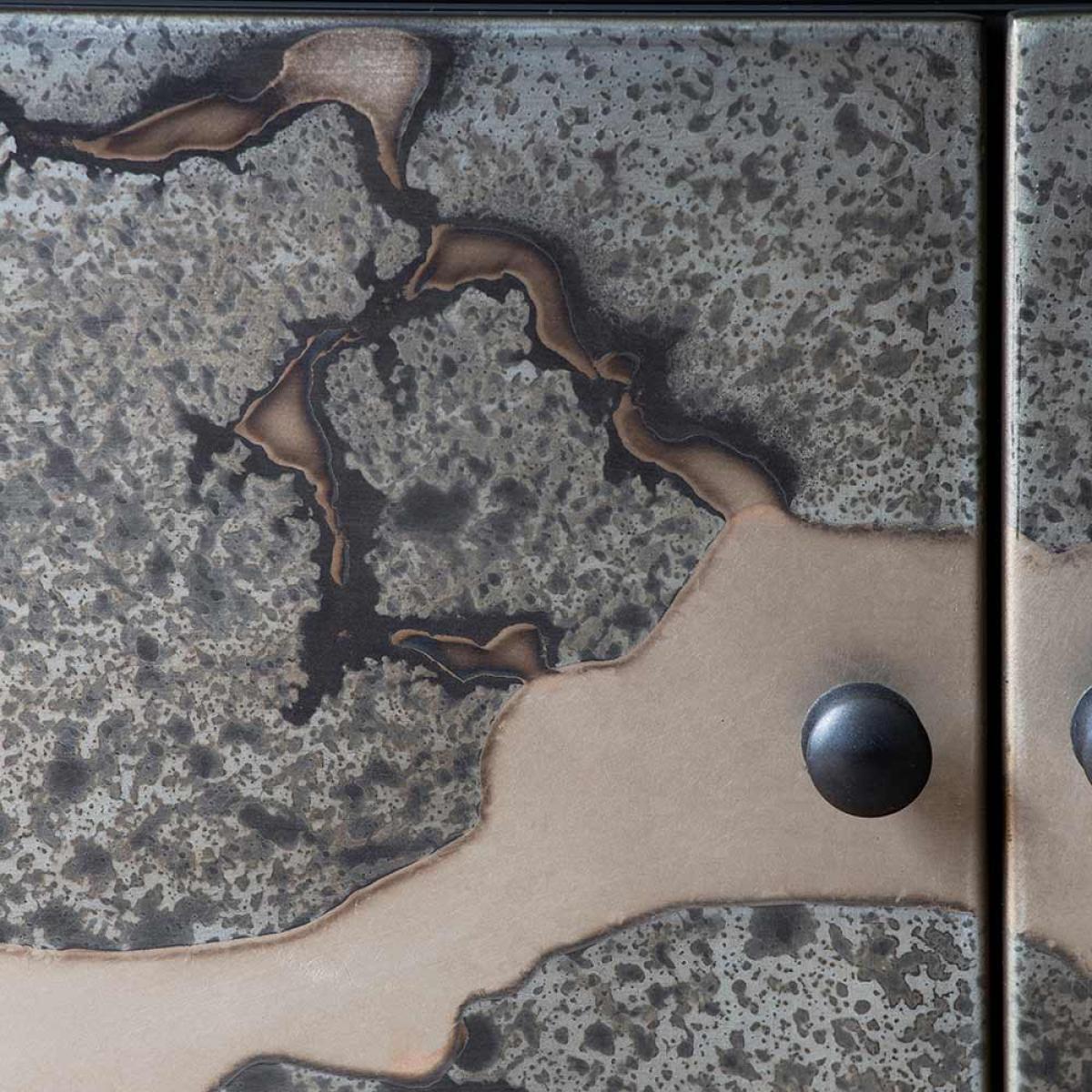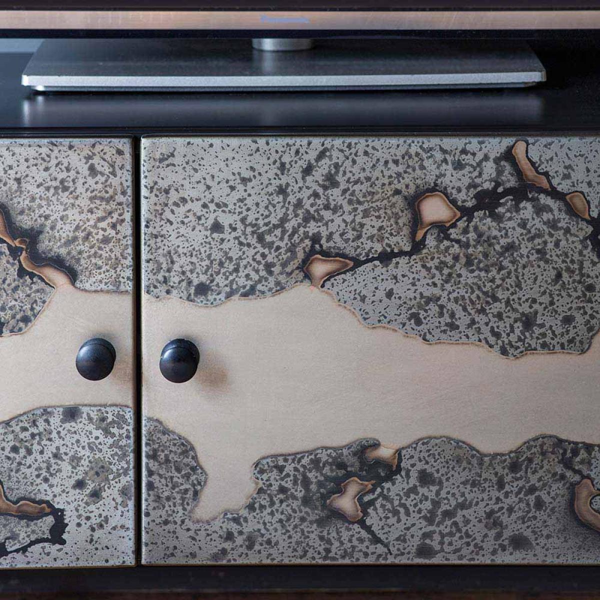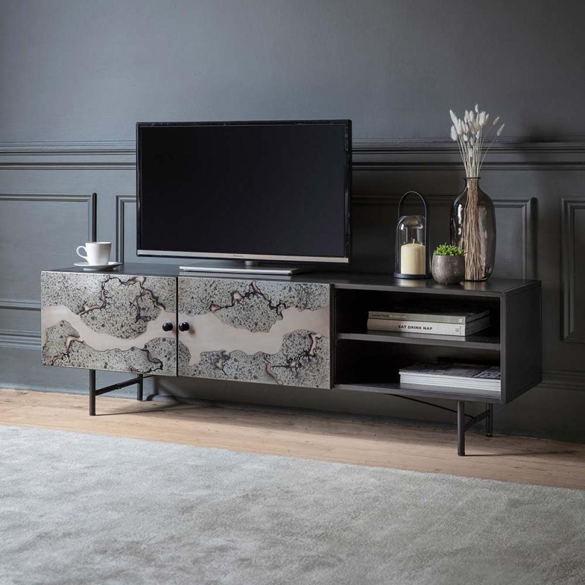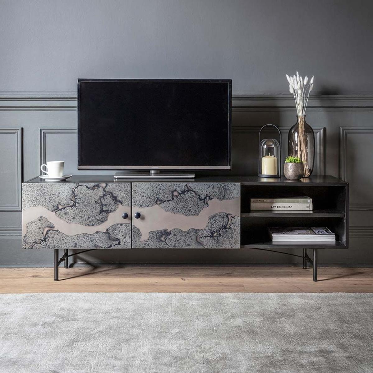 I love this media unit for its sleek, contemporary look and versatile design. Its contrasting patterns add visual interest without overwhelming the space, making it suitable for modern, industrial, or eclectic interiors. It works particularly well in living rooms that aim for a minimalist or statement style, providing a practical yet stylish platform for your TV and decorative accessories. For styling, consider keeping the top surface uncluttered with a few well-chosen decorative objects like vases or candles, while utilising the internal storage to keep essentials organised and out of sight. Pair it with other metallic or textured elements to enhance its modern vibe, and it will serve as both a functional and stylish centrepiece in your room.