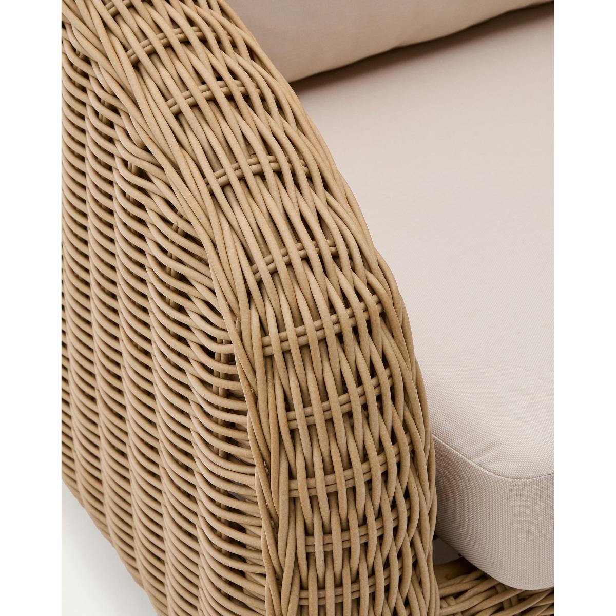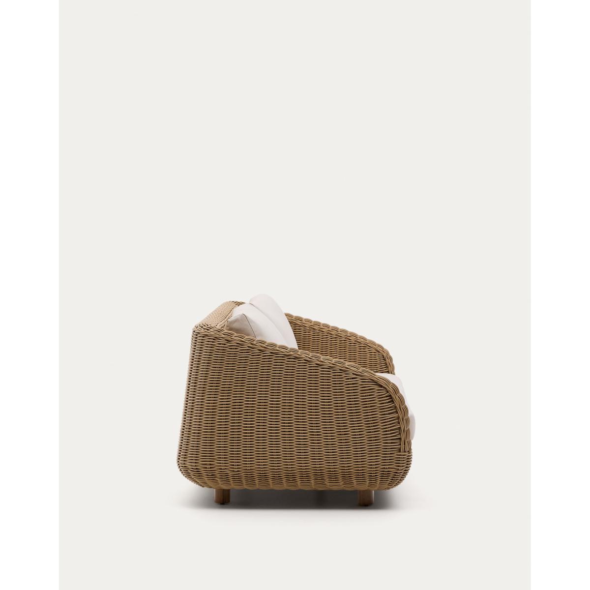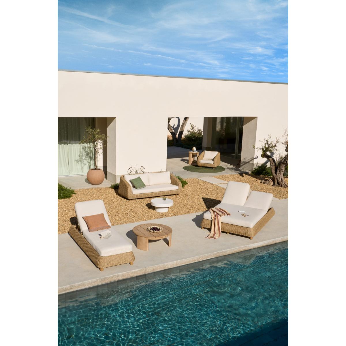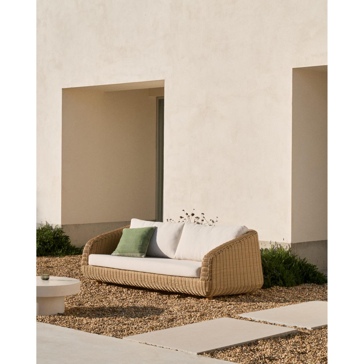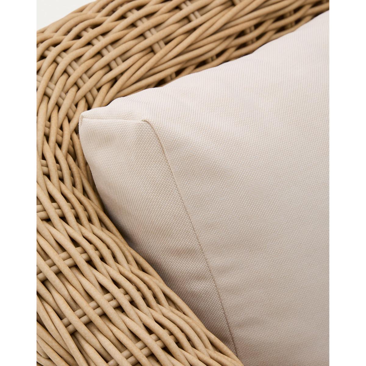 A collection that combines the rustic nature and practicality of synthetic rattan with an aesthetic featuring smooth, rounded lines. It is weather-resistant, allowing it to retain its beauty and structure both indoors and outdoors, as well as being easy to clean. The cushions have removable covers and are water-repellent, offering additional convenience. We recommend storing them away on rainy days or covering the sofa with the Iria protective cover to ensure its long-term preservation.