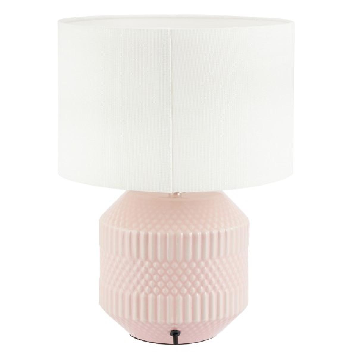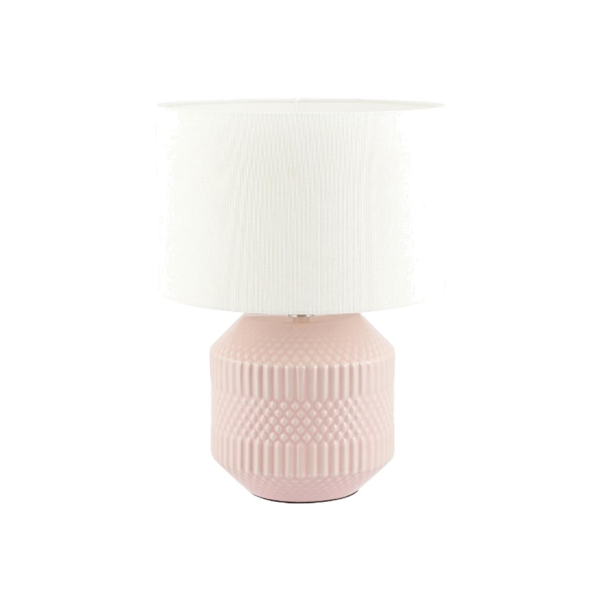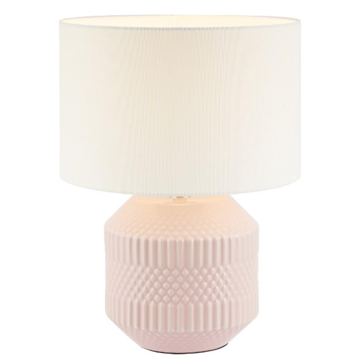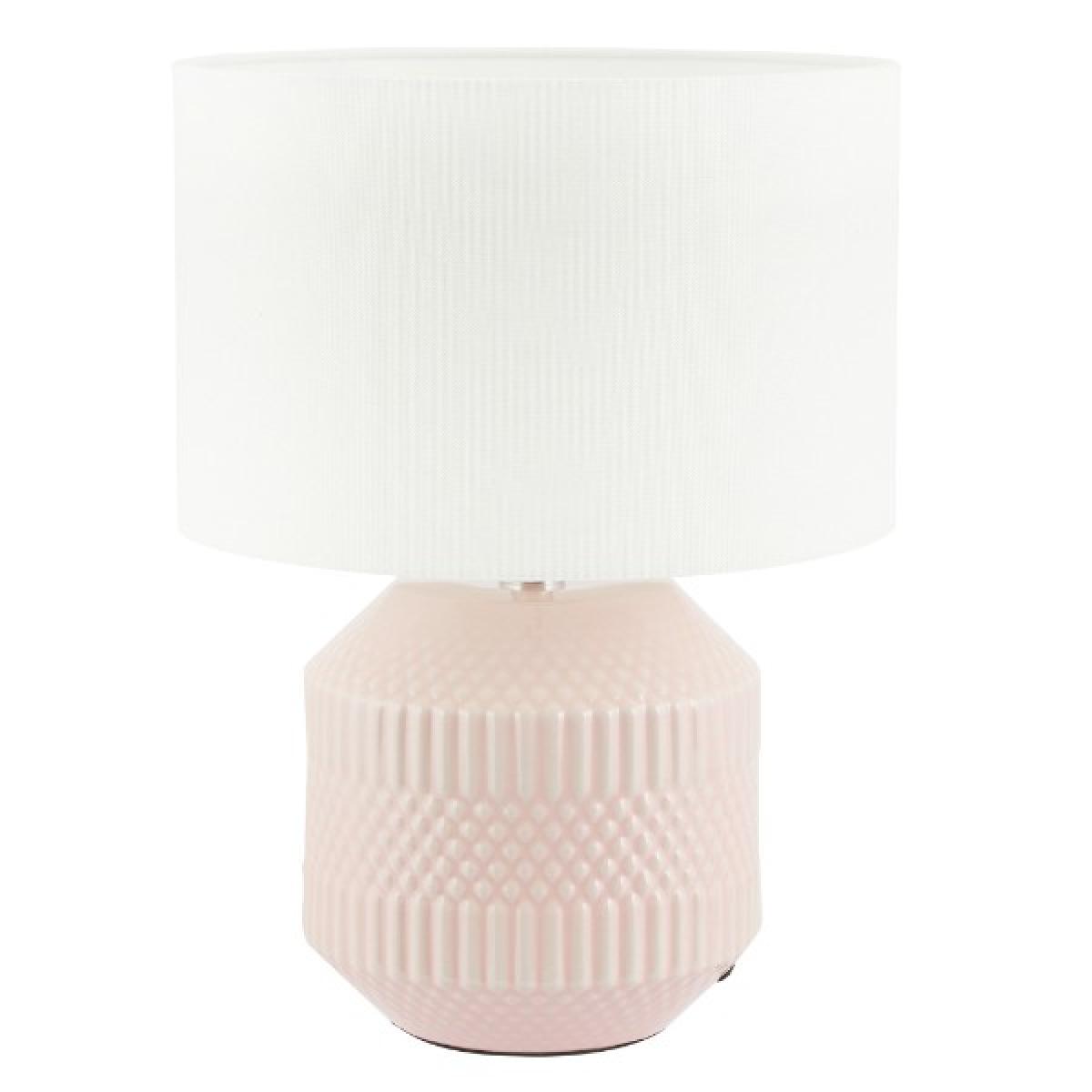 Modern geometric small pink table lamp. The Meribel table lamp features a pastel pink finish and crisp white faux cotton circular shade. The perfect table lamp to feature on bedside, console and side tables.