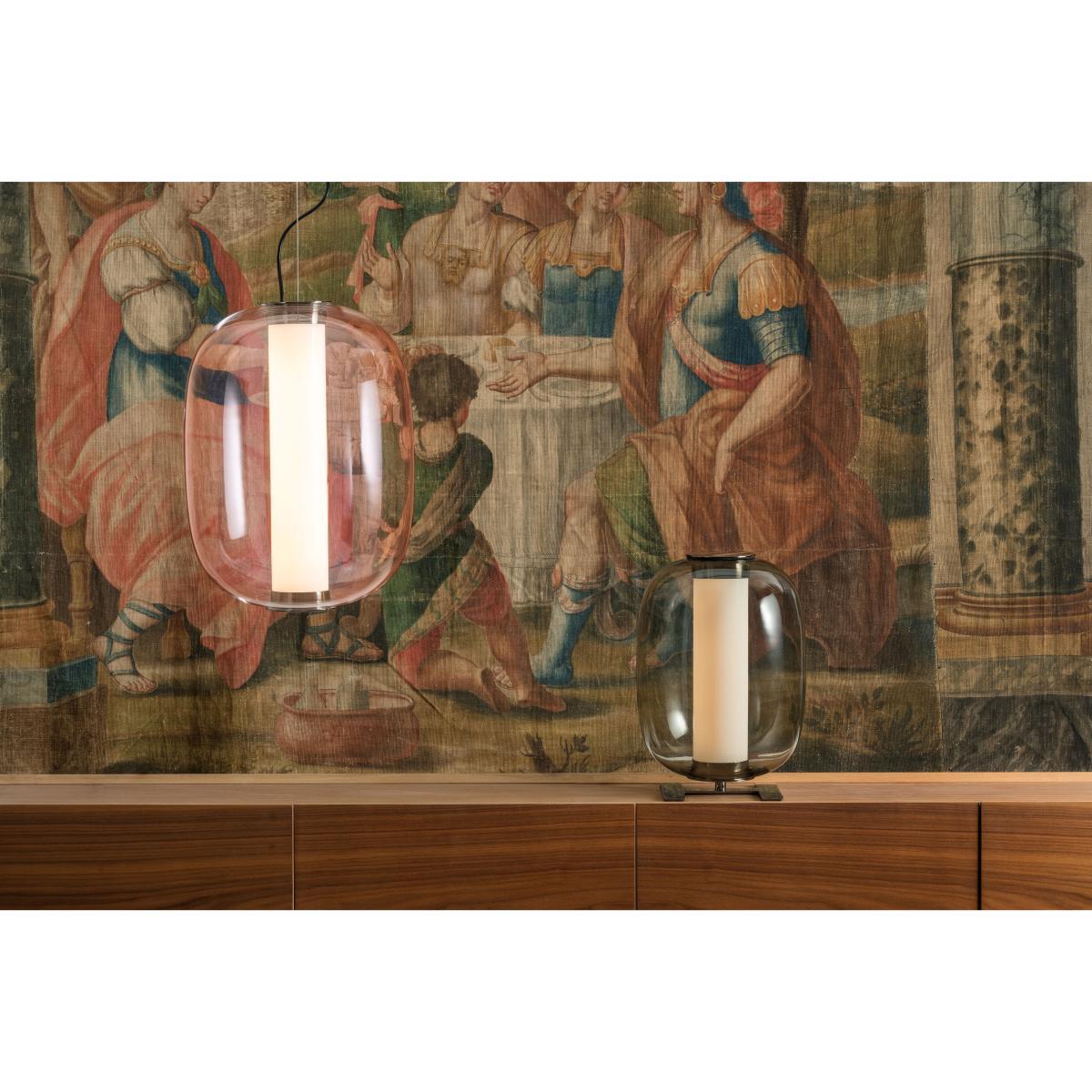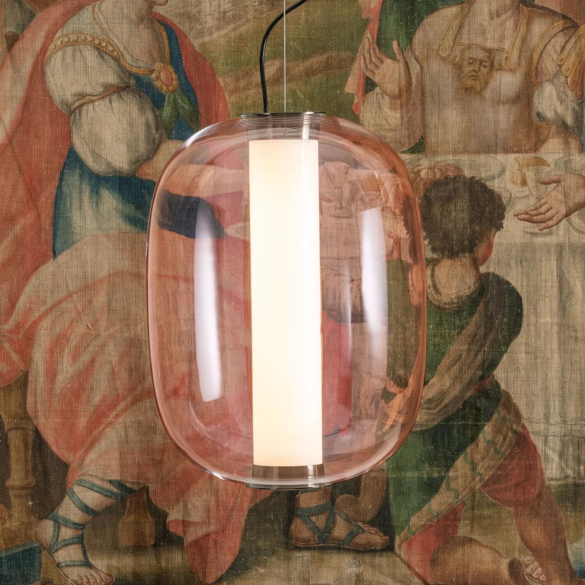 Light as a bubble, the Meridiano pendant plays an attractive graphic game. It presents two interlocking glass volumes. The large transparent blown glass globe is crossed by a vertical white light tube which leaves a strong imprint in space. This light cylinder traces a vertical line of light, magnifying the refined nature of the glass. Light and delicate, the superb transparent glass capsule forms an ethereal volume filled with luminous substance. The Meridiano pendant offers double lighting. In addition to the diffused light emitted by the diffuser tube, it emits direct, functional light thanks to a second LED light source at the bottom of the lampshade. The choice of quality materials and elaborate shape of the lampshade give this light a sophisticated, timeless feel worthy of the greatest design icons. Glass work is at the heart of the creation of the Italian company Fontana Arte. The tube frame is black metal.