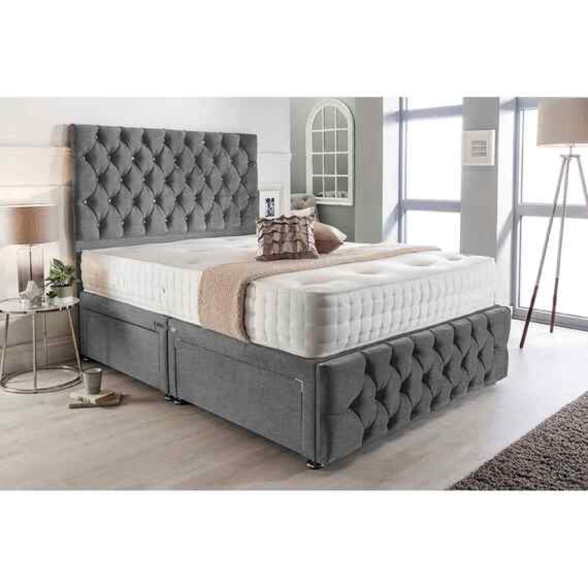 This beautiful Merina Divan bed range is sure to leave a lasting impression in your bedroom. It has been handcrafted by skilled craftsmen in Britain using the finest materials. This bed comes available in 6 sizes and various fabrics and colours. Storage options included of having 2 drawers on either side of the base or to have no storage. The fabrics include chenille, plush, and crushed velvet. A stunning tall 54 inch headboard is included. A handcrafted chesterfield design with a footboard to match. Quality 1000 pocket sprung mattress with a rating of medium to firm is also included, with a depth of 10 inches this mattress has been designed to relieve pressure points across the body when leading to a much better night's sleep. It is also dust mite resistant and hypo allergenic. Natural fibre and wool fillings this mattress has the best quality materials for a great nights sleep.