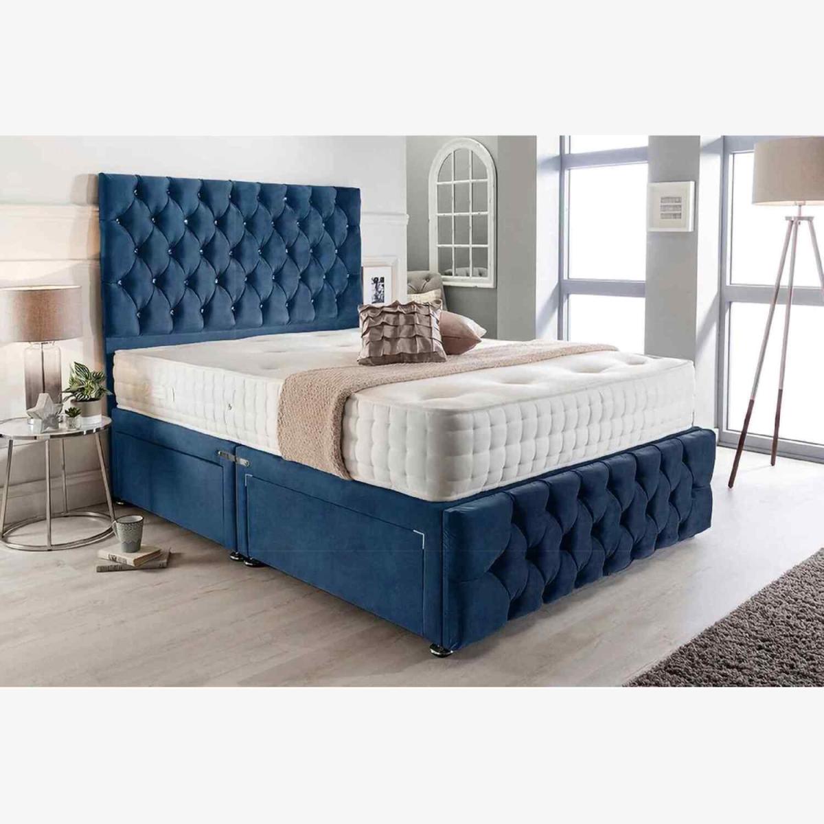 This beautiful Merina Divan bed range is sure to leave a lasting impression in your bedroom. It has been handcrafted by skilled craftsmen in Britain using the finest materials. This bed comes available in 6 sizes and various fabrics and colours. Storage options included of having 2 drawers on either side of the base or to have no storage. The fabrics include chenille, plush, and crushed velvet. A stunning tall 54 inch headboard is included. A handcrafted chesterfield design with a footboard to match. Quality 1000 pocket sprung mattress with a rating of medium to firm is also included, with a depth of 10 inches this mattress has been designed to relieve pressure points across the body when leading to a much better night's sleep. It is also dust mite resistant and hypo allergenic. Natural fibre and wool fillings this mattress has the best quality materials for a great nights sleep.