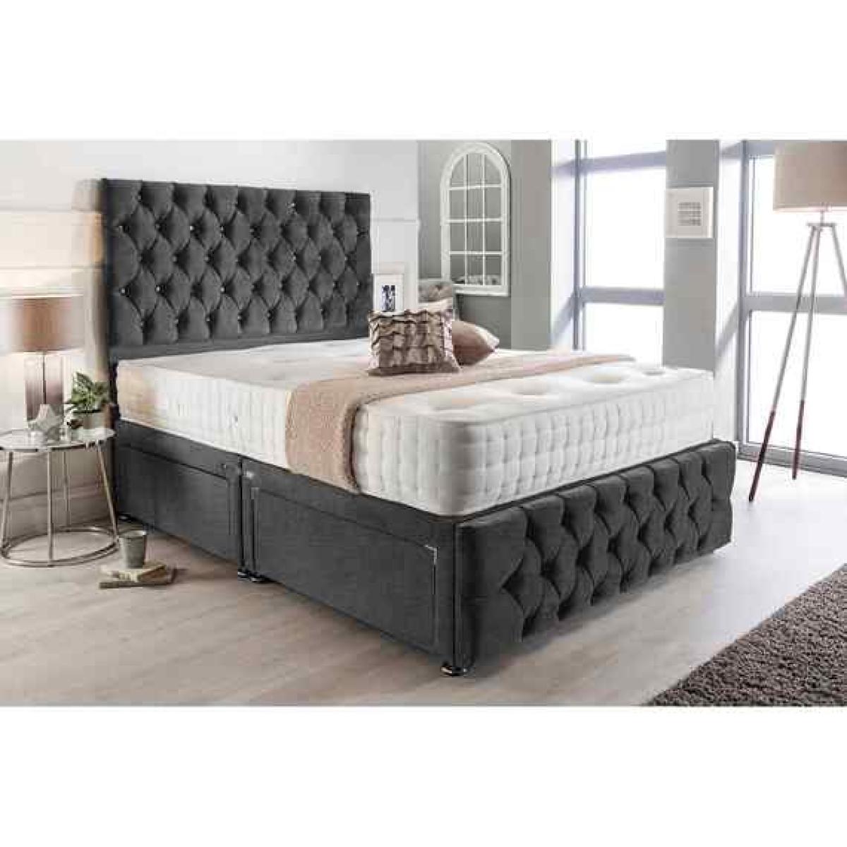 This beautiful Merina Divan bed range is sure to leave a lasting impression in your bedroom. It has been handcrafted by skilled craftsmen in Britain using the finest materials. This bed comes available in 6 sizes and various fabrics and colours. Storage options included of having 2 drawers on either side of the base or to have no storage. The fabrics include chenille, plush, and crushed velvet. A stunning tall 54 inch headboard is included. A handcrafted chesterfield design with a footboard to match. Quality 1000 pocket sprung mattress with a rating of medium to firm is also included, with a depth of 10 inches this mattress has been designed to relieve pressure points across the body when leading to a much better night's sleep. It is also dust mite resistant and hypo allergenic. Natural fibre and wool fillings this mattress has the best quality materials for a great nights sleep.