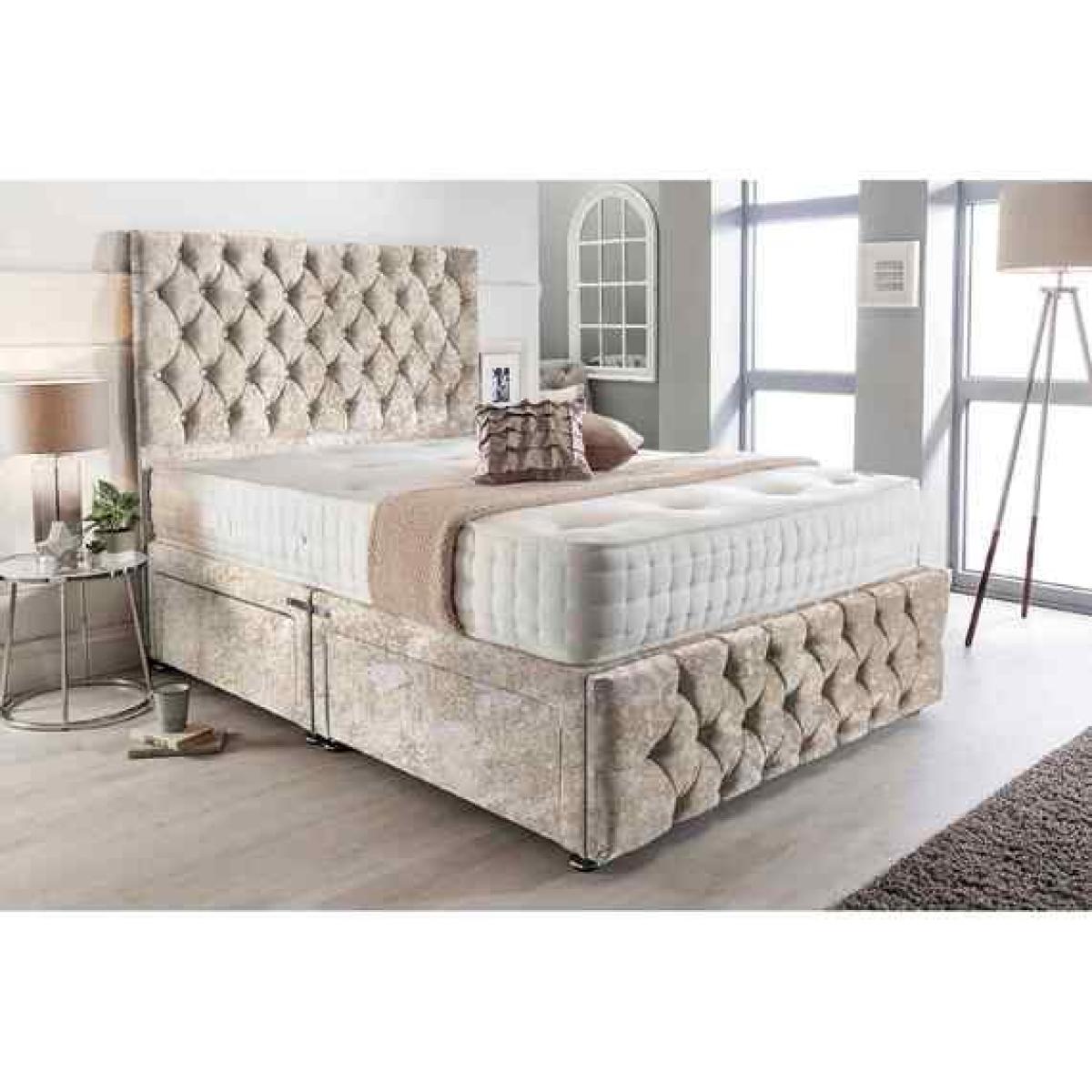 This beautiful Merina Divan bed range is sure to leave a lasting impression in your bedroom. It has been handcrafted by skilled craftsmen in Britain using the finest materials. This bed comes available in 6 sizes and various fabrics and colours. Storage options included of having 2 drawers on either side of the base or to have no storage. The fabrics include chenille, plush, and crushed velvet. A stunning tall 54 inch headboard is included. A handcrafted chesterfield design with a footboard to match. Quality 1000 pocket sprung mattress with a rating of medium to firm is also included, with a depth of 10 inches this mattress has been designed to relieve pressure points across the body when leading to a much better night's sleep. It is also dust mite resistant and hypo allergenic. Natural fibre and wool fillings this mattress has the best quality materials for a great nights sleep.