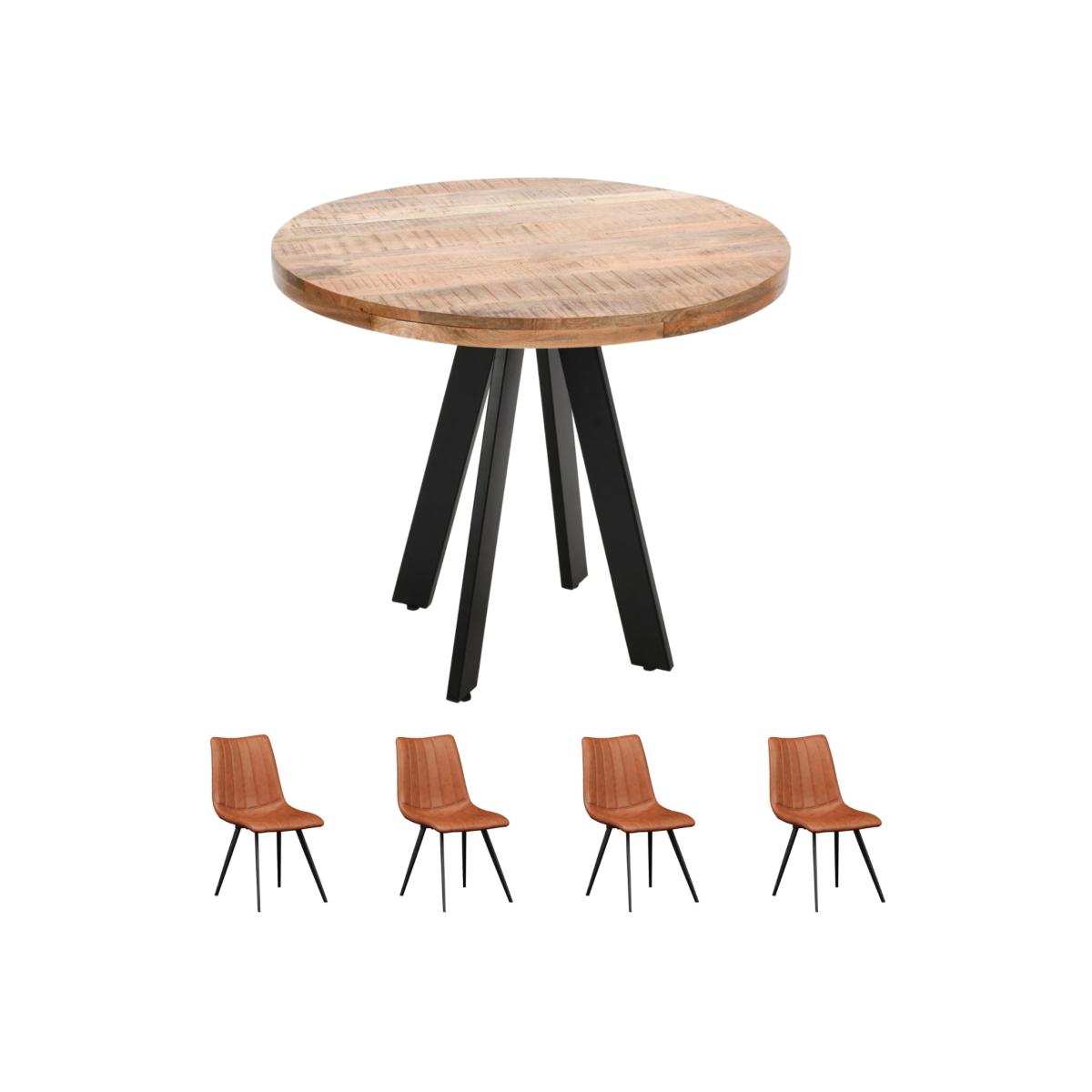 Introducing our Merlin Mango Wooden 4 Seater Round Dining Table Set with 4 Chairs. Our table is a stunning, versatile centerpiece for your dining room crafted from high-quality mango wood and metal. With its combination of natural wood and modern metal, it creates a contemporary, eye-catching look. Its round shape is perfect for intimate gatherings and dinner parties, and its lacquer coated top adds a protective layer. The metal base is also finished with a lacquer coating for stability and aesthetics. Our chairs are a modern, contemporary take with striking vertical accent stitching and a soft vegan leather seat that's comfortable for all guests.