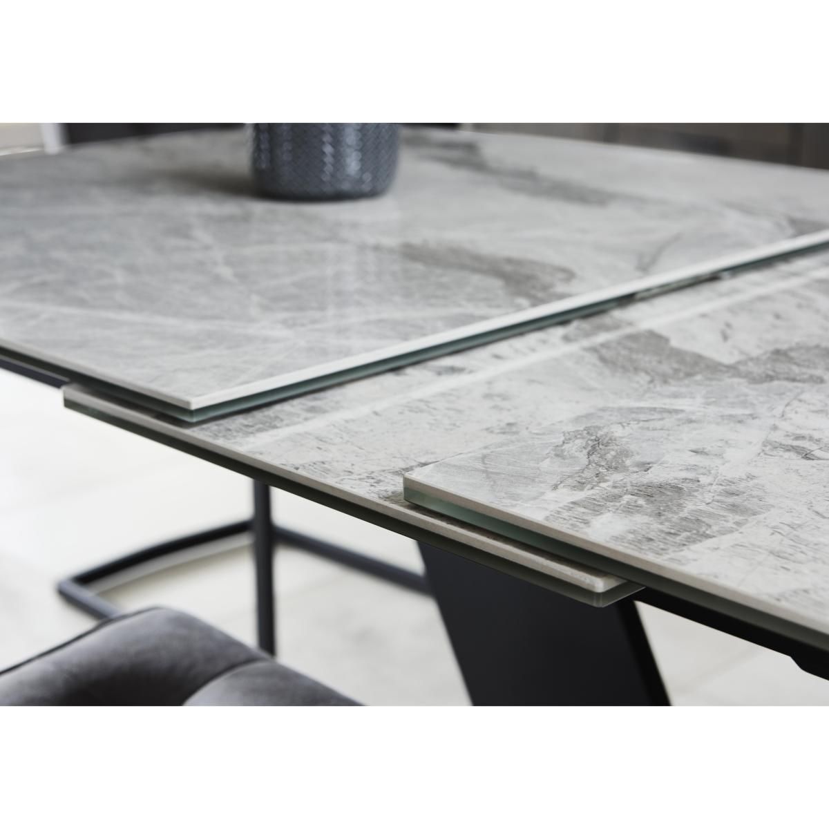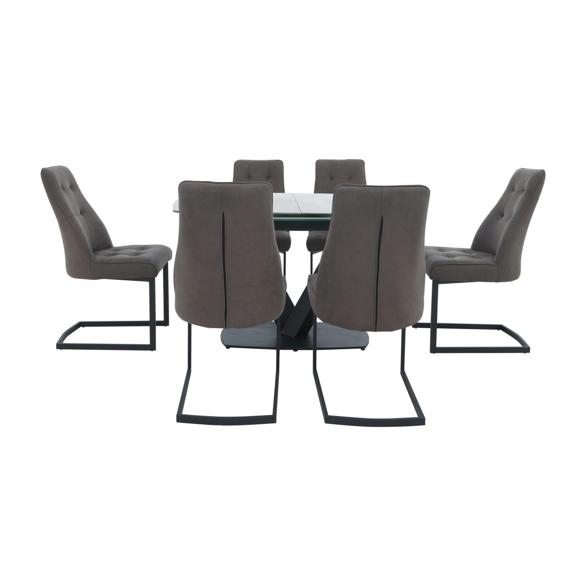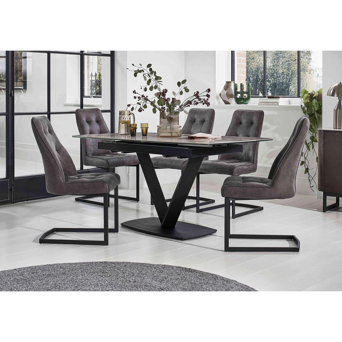Showcasing a contemporary combination of ceramic, glass, wood veneer and metal, the Merlin collection of designer dining room pieces will bring a striking aesthetic to any home. The large extending dining table sets the tone for the entire collection. Seating ten, it features a boat-shaped marble-effect ceramic on glass top in subtle tones of grey and taupe and rests on black powered-coated metal legs. The cantilevered dining chairs share the same finish for the legs and have superbly contoured and cushioned seating, upholstered in a charcoal grey fabric with buttoning. A sleek and spacious sideboard with a ceramic and glass top, and wood veneer drawer and cupboard door surfaces completes this stunning collection. Merlin is exclusive to Furniture Village. This small dining set saves on space yet still makes a strong design statement. The table's marble-effect ceramic top contrasts beautifully with its bold black metal base. Why you'll love it. Contemporary small dining set showcases refined industrial style. Boat-shaped small extending table with grey and taupe marbled ceramic finish. Durable and hardwearing – perfect for a family dining space. Black powder-coated metal pedestal base. Seats up to 8 with an easy to use pop-up extension mechanism. Dining set includes 6 Merlin dining chairs. Stylish cantilever bases in black powder-coated metal. Charcoal grey fabric upholstery with understated buttoning. Only at Furniture Village. This small dining set is part of the Merlin range of dining furniture. What you need to know. Chairs have foam seat cushioning and metal bases. Table has a ceramic on glass top and metal base. Ceramic surface is scratch- and heat-resistant. Each ceramic top is individually made and will have unique and distinctive characteristics. Table is 130 cm wide and seats 6. Extends to 170 cm, seating 8. This extending dining table is heavy and should not be moved once in place. Also available as part of a ready-made dining set.