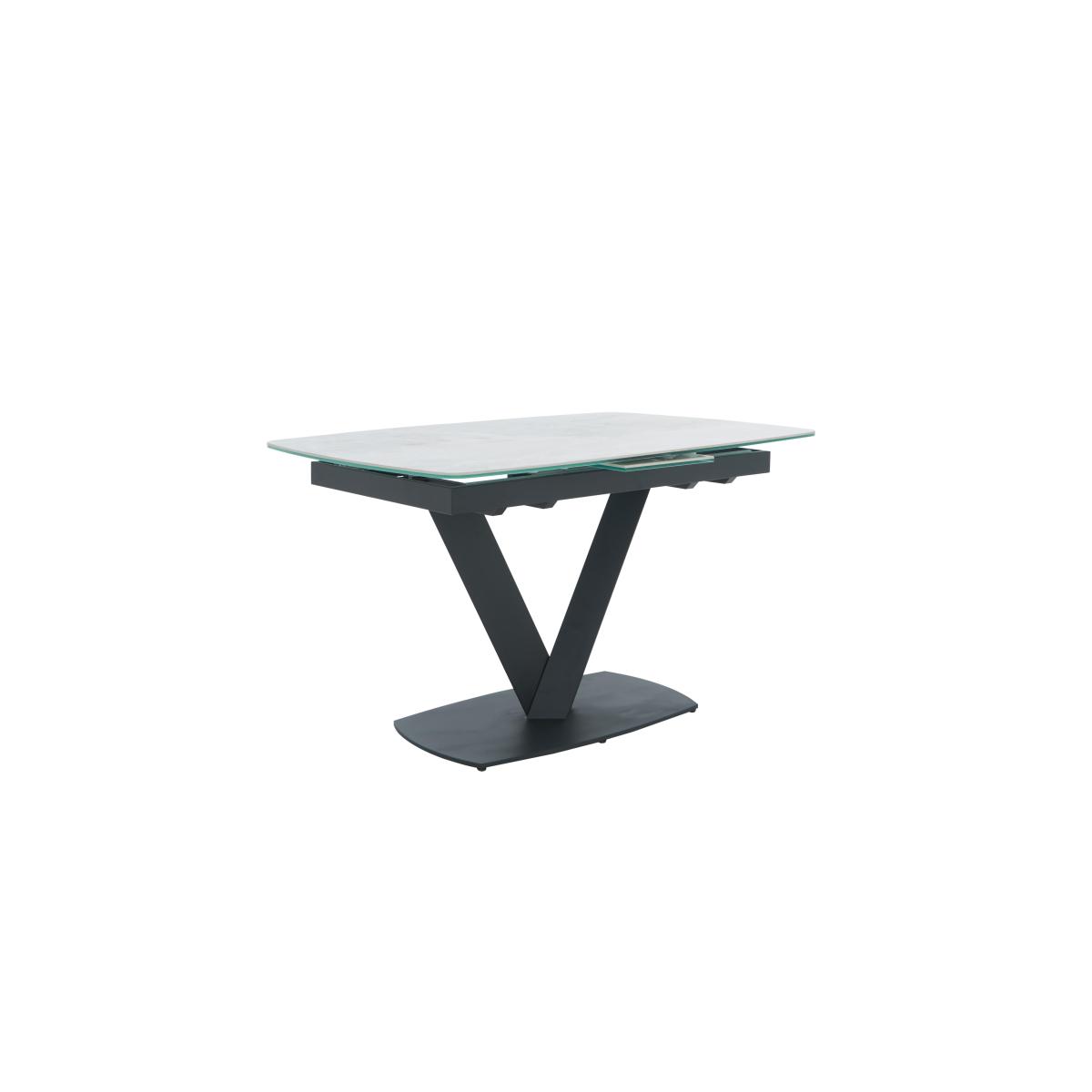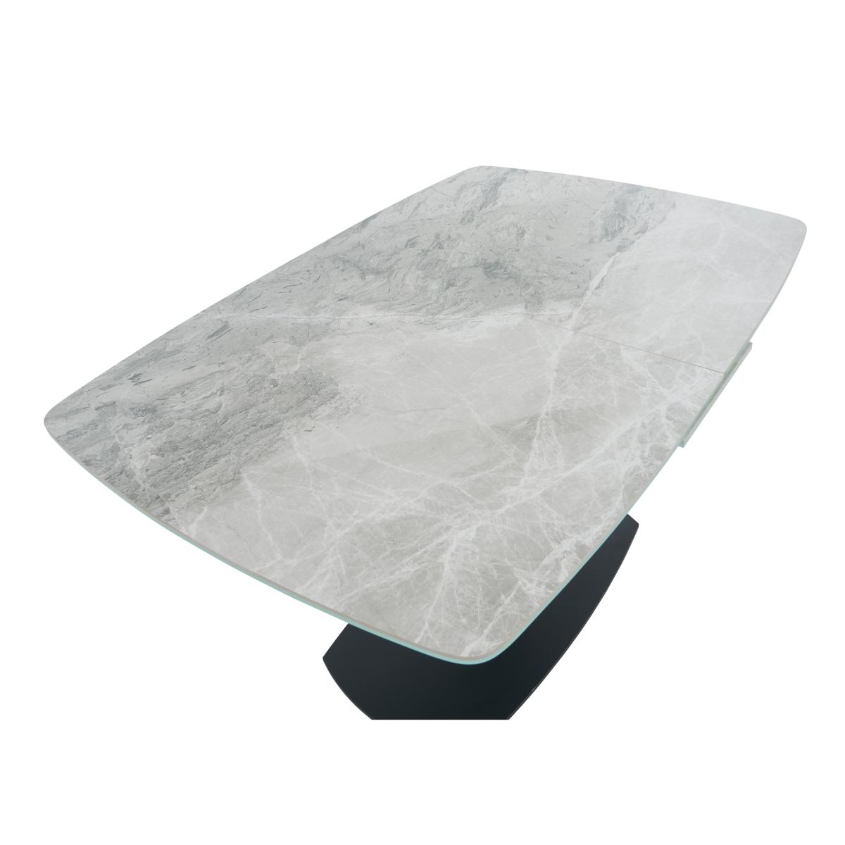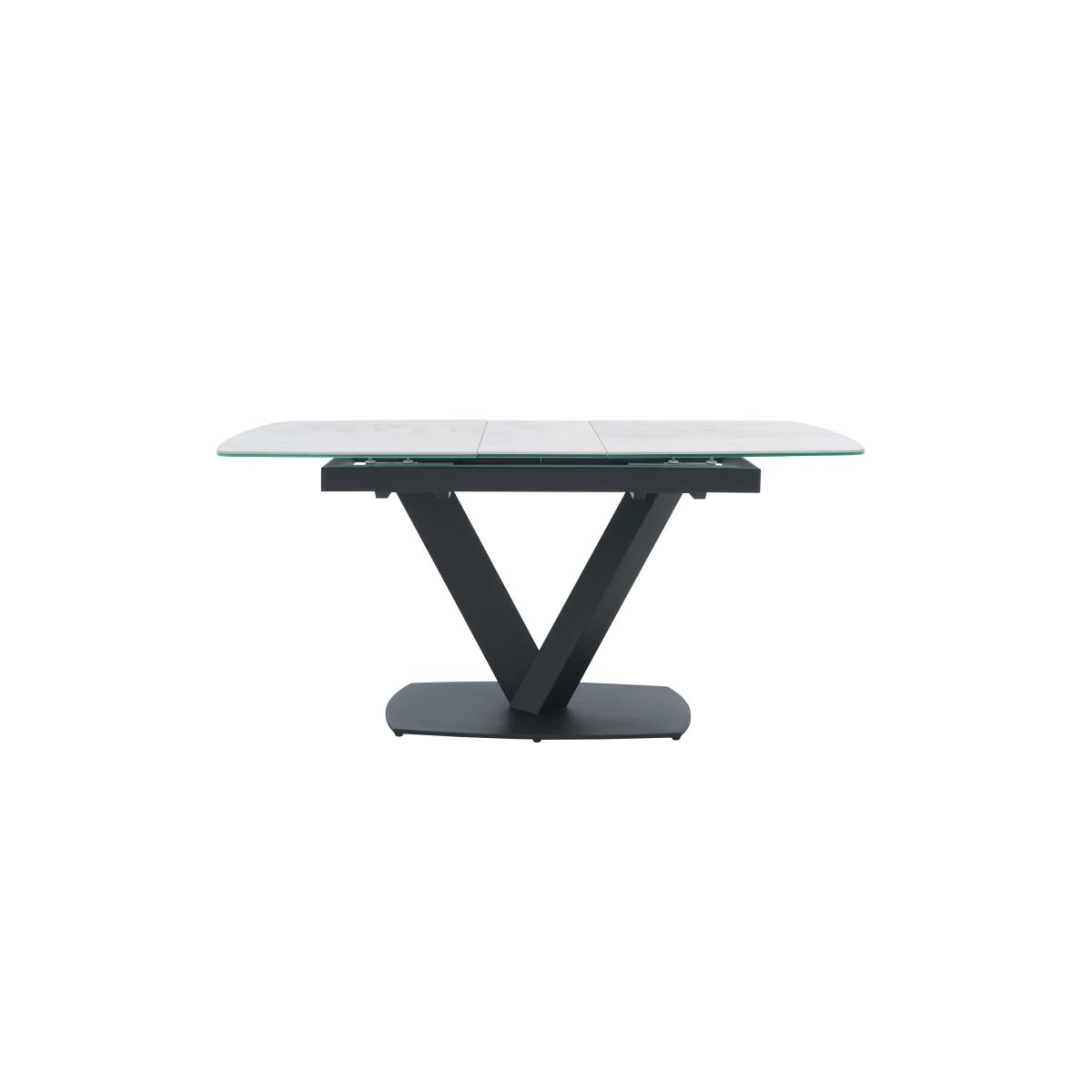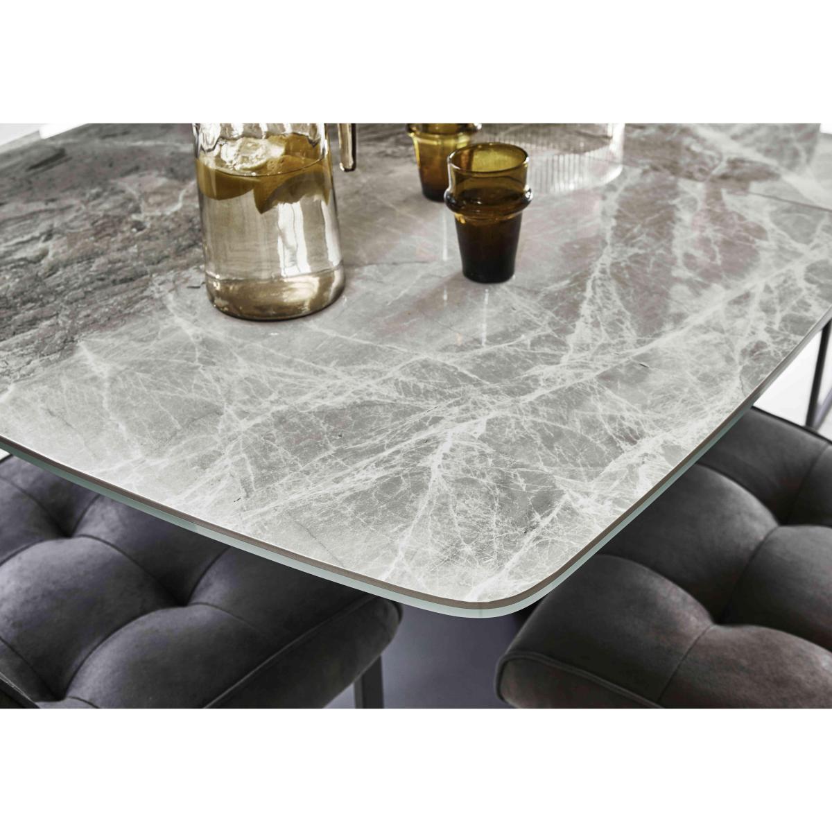 Showcasing a contemporary combination of ceramic, glass, wood veneer and metal, the Merlin collection of designer dining room pieces will bring a striking aesthetic to any home. The large extending dining table sets the tone for the entire collection. Seating ten, it features a boat-shaped marble-effect ceramic on glass top in subtle tones of grey and taupe and rests on black powered-coated metal legs. The cantilevered dining chairs share the same finish for the legs and have superbly contoured and cushioned seating, upholstered in a charcoal grey fabric with buttoning. A sleek and spacious sideboard with a ceramic and glass top, and wood veneer drawer and cupboard door surfaces completes this stunning collection. Merlin is exclusive to Furniture Village. This small dining set saves on space yet still makes a strong design statement. The table's marble-effect ceramic top contrasts beautifully with its bold black metal base. Why you'll love it. Contemporary small dining set showcases refined industrial style. Boat-shaped small extending table with grey and taupe marbled ceramic finish. Durable and hardwearing – perfect for a family dining space. Black powder-coated metal pedestal base. Seats up to 8 with an easy to use pop-up extension mechanism. Dining set includes 6 Merlin dining chairs. Stylish cantilever bases in black powder-coated metal. Charcoal grey fabric upholstery with understated buttoning. Only at Furniture Village. This small dining set is part of the Merlin range of dining furniture. What you need to know. Chairs have foam seat cushioning and metal bases. Table has a ceramic on glass top and metal base. Ceramic surface is scratch- and heat-resistant. Each ceramic top is individually made and will have unique and distinctive characteristics. Table is 130 cm wide and seats 6. Extends to 170 cm, seating 8. This extending dining table is heavy and should not be moved once in place. Also available as part of a ready-made dining set.