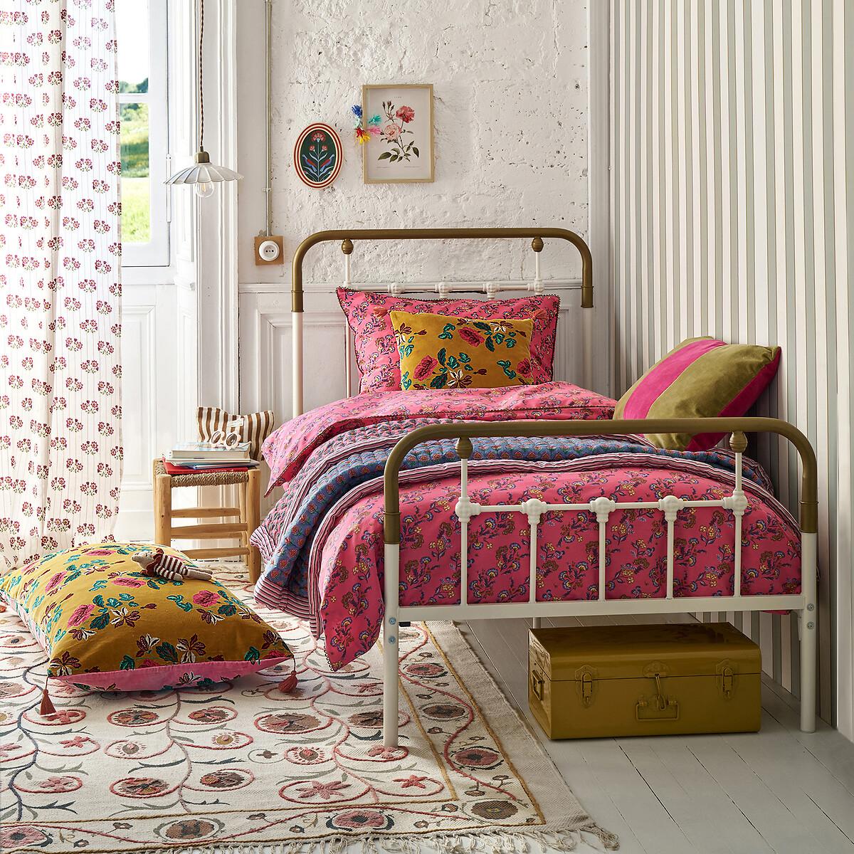 A bouquet of Indian flowers on a pink background brings modernity to the romantic style of the Merline washed cotton duvet cover. The contrasting crochet ribbon finish highlights the colour palette. The wavy bronze border offers a charming finish. 100% cotton bed linen, created by La Redoute Interiors. The washed cotton has been delicately bleached during its manufacture. Soft, supple and comfortable, it softens over time. Its slightly wrinkled appearance is incredibly on-trend, and it does not require ironing. Product Details • 100% cotton • Contains 50% recycled cotton • Washed cotton • 144 thread count • Floral print on both sides • Straight buttoned hem • Crochet ribbon trim. Match this item with the rest of the bedding in the range for a stylish bedroom. And you can mix and match it with different colours and styles from our other bedding ranges when you want to change things up and create your own unique look. Care Advice • Machine washable at 40°CDimensions • 140 x 150cm: Adjustable bed • 140 x 200cm: Single • 160 x 210cm : Double • 200 x 200cm: Double • Recycled cotton. Using recycled cotton is all about conserving resources and reducing waste. • OEKO-TEX® Standard 100. Standard 100 certification by OEKO-TEX® tests textile products for harmful substances via an independent, international label.