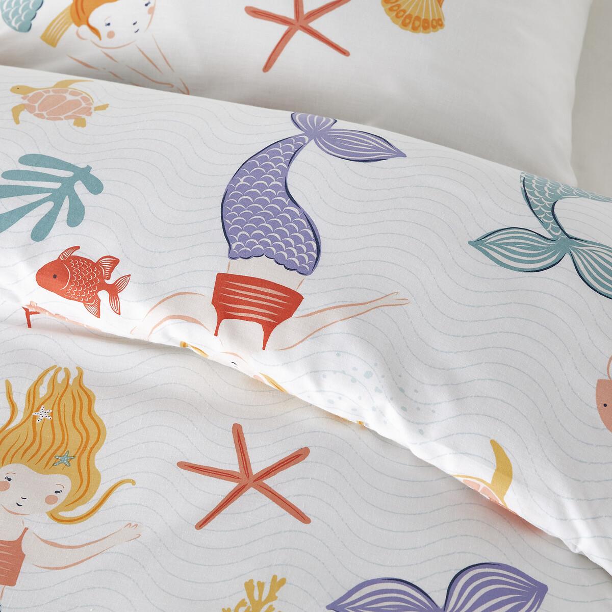 In the secret world of the oceans, there are characters of all colours and shapes. But the most beautiful is the Mermaid. Polycotton combines the softness of cotton with polyester. Easy to live with, it is perfect for daily use and regular washing. Plus, it does not require ironing! The set includes the duvet cover and its matching square pillowcase. Product Details • 52% polyester, 48% cotton • 52% polyester, 48% cotton • Print front and back • Straight buttoned hem Care Advice • Machine washable at 60°C • By washing your laundry at 40°C instead of 60°C, you limit energy consumption. Sizes • Duvet cover 140 x 200cm + 1 pillowcase 63 x 63cm :Single • OEKO-TEX® Standard 100. Standard 100 certification by OEKO-TEX® tests textile products for harmful substances via an independent, international label.