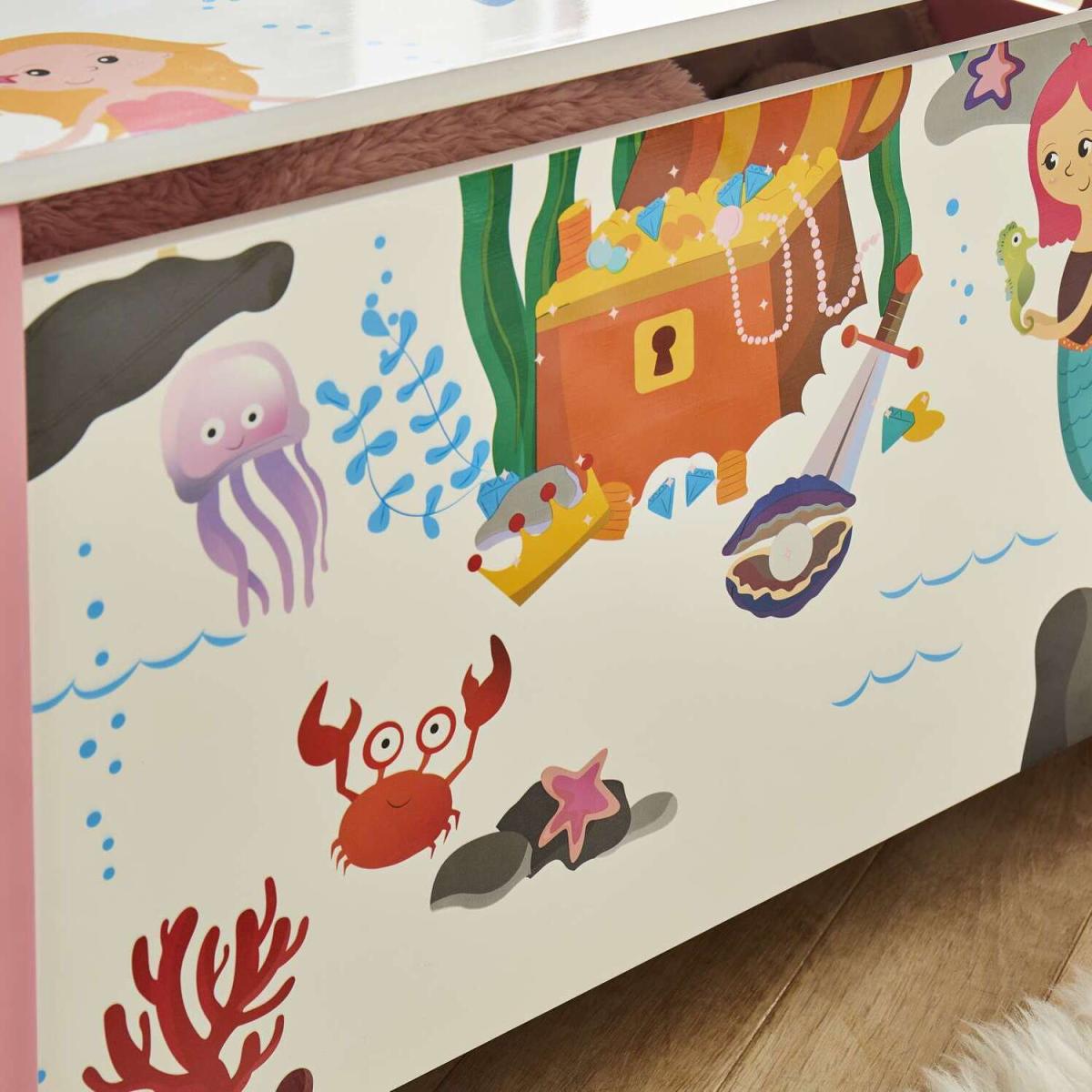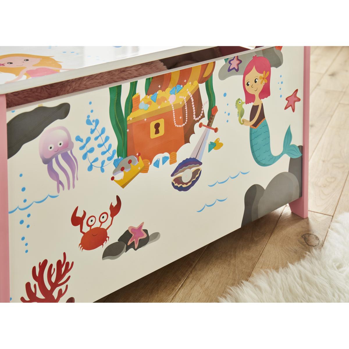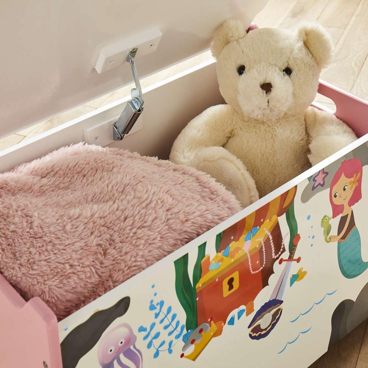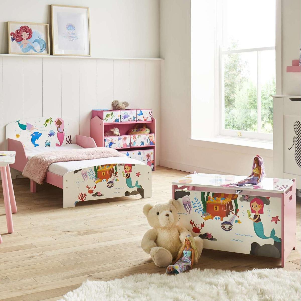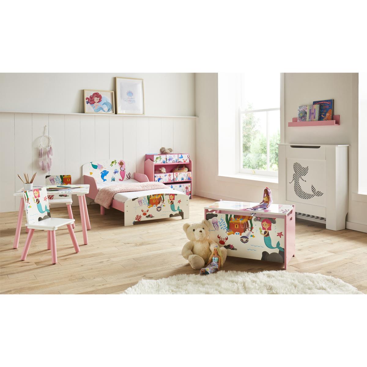 Make a splash and create a playful underwater space with the Mermaid Storage Box. Bright and colourful in design, the children's storage container features an adorable mermaid-inspired print paired with a soft pink palette. Complete with a soft close lid and cut-out handles on each side, the toy box can easily be moved around the home. Let your child's imagination run wild with matching mermaid furniture items.