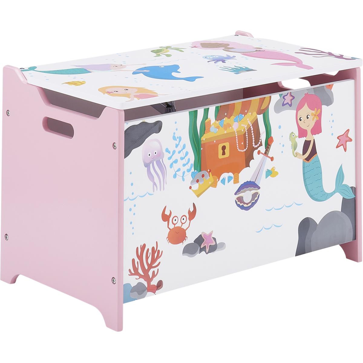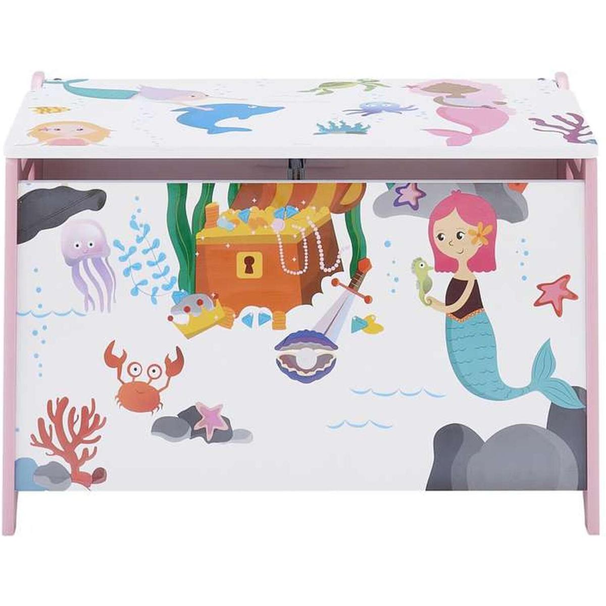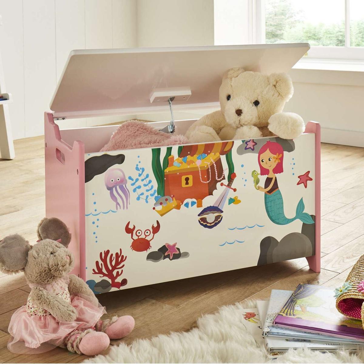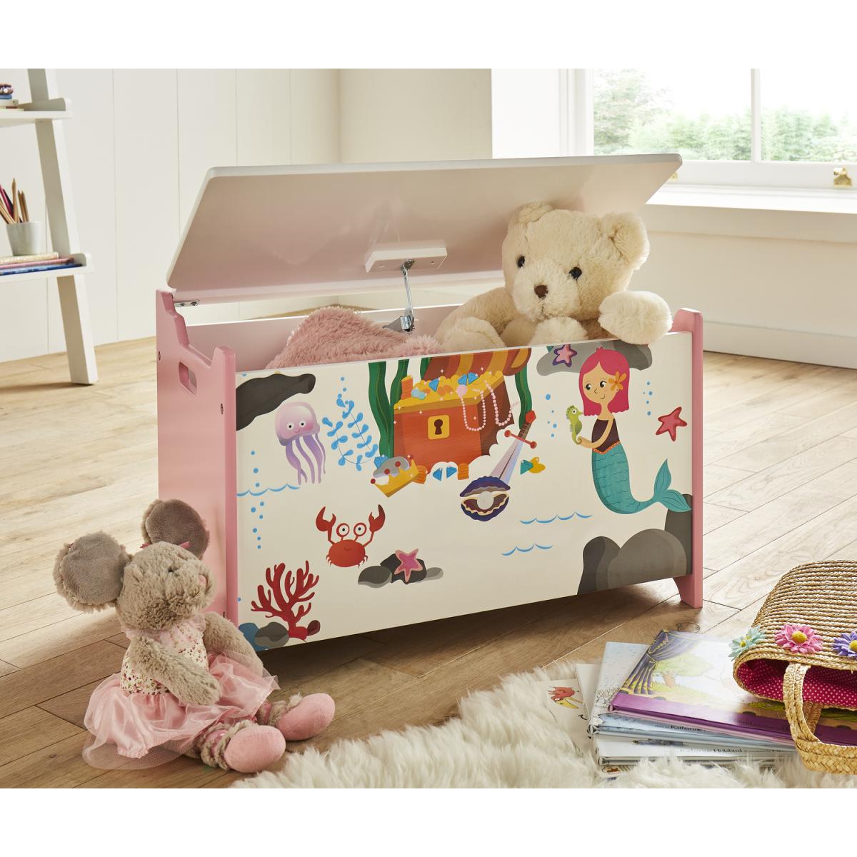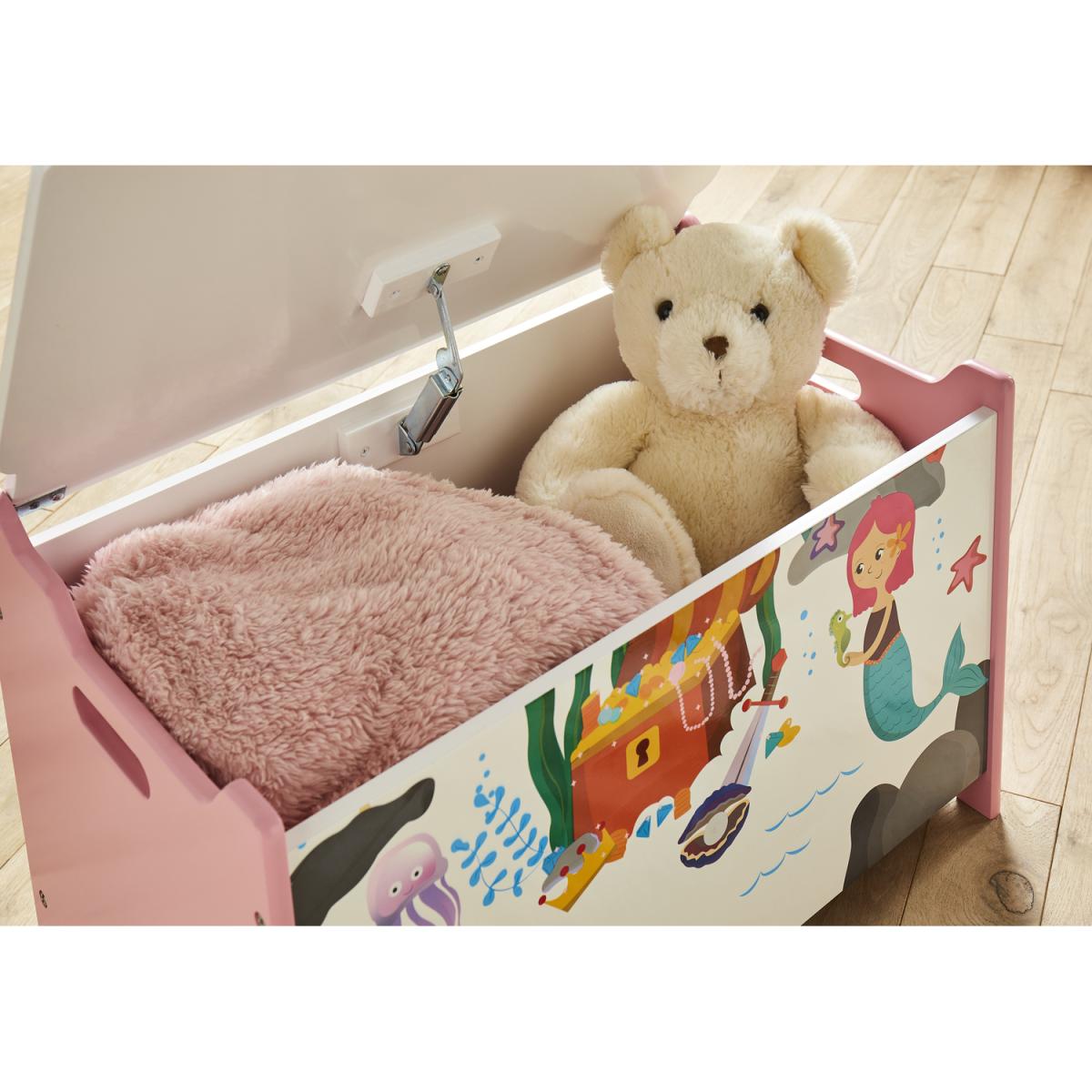Make a splash and create a playful underwater space with the Mermaid Storage Box. Bright and colourful in design, the children's storage container features an adorable mermaid-inspired print paired with a soft pink palette. Complete with a soft close lid and cut-out handles on each side, the toy box can easily be moved around the home. Let your child's imagination run wild with matching mermaid furniture items.