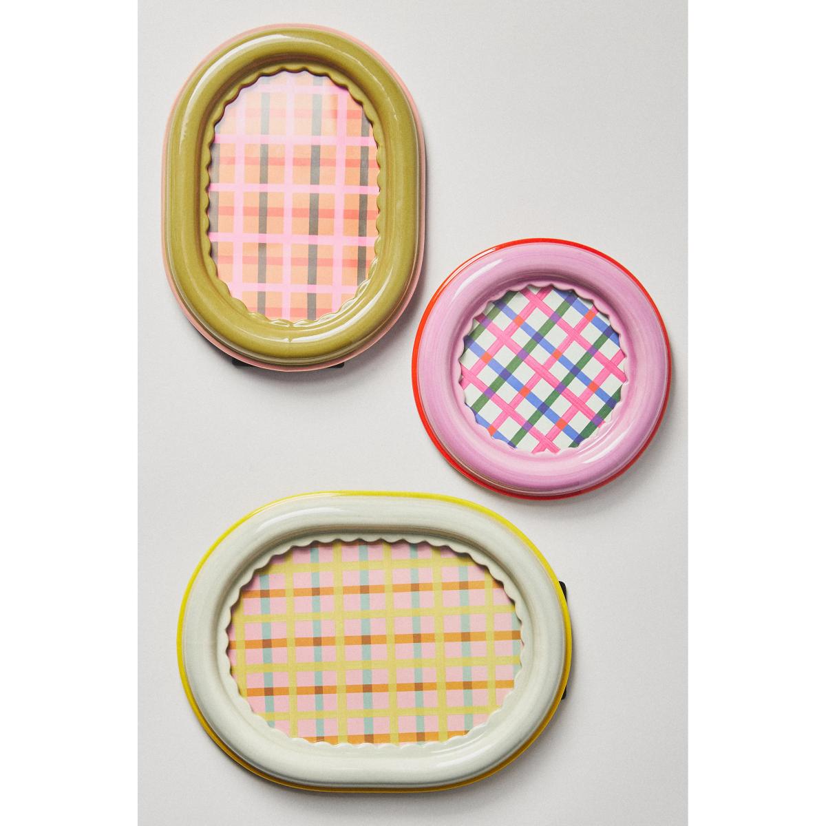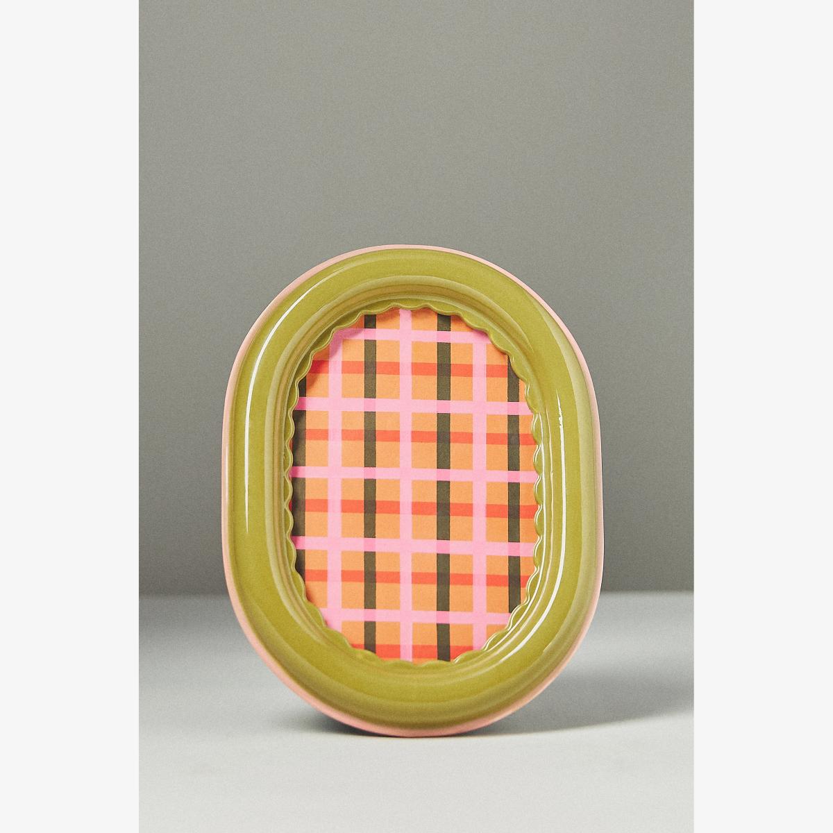 I really like this ceramic frame for its playful design and versatile size. It works particularly well in contemporary or eclectic interiors where a pop of colour can add personality. The pastel green border offers a fresh vibe, making it a great accent piece on a shelf or within a gallery wall. For styling, I recommend pairing it with other colourful or patterned accessories to create visual interest, or keeping it simple for a modern look by surrounding it with neutral tones. Its oval shape adds a softer, more intimate feel, ideal for framing personal photos or small artwork, and it’s a lovely way to introduce a dash of colour into a minimalist space.