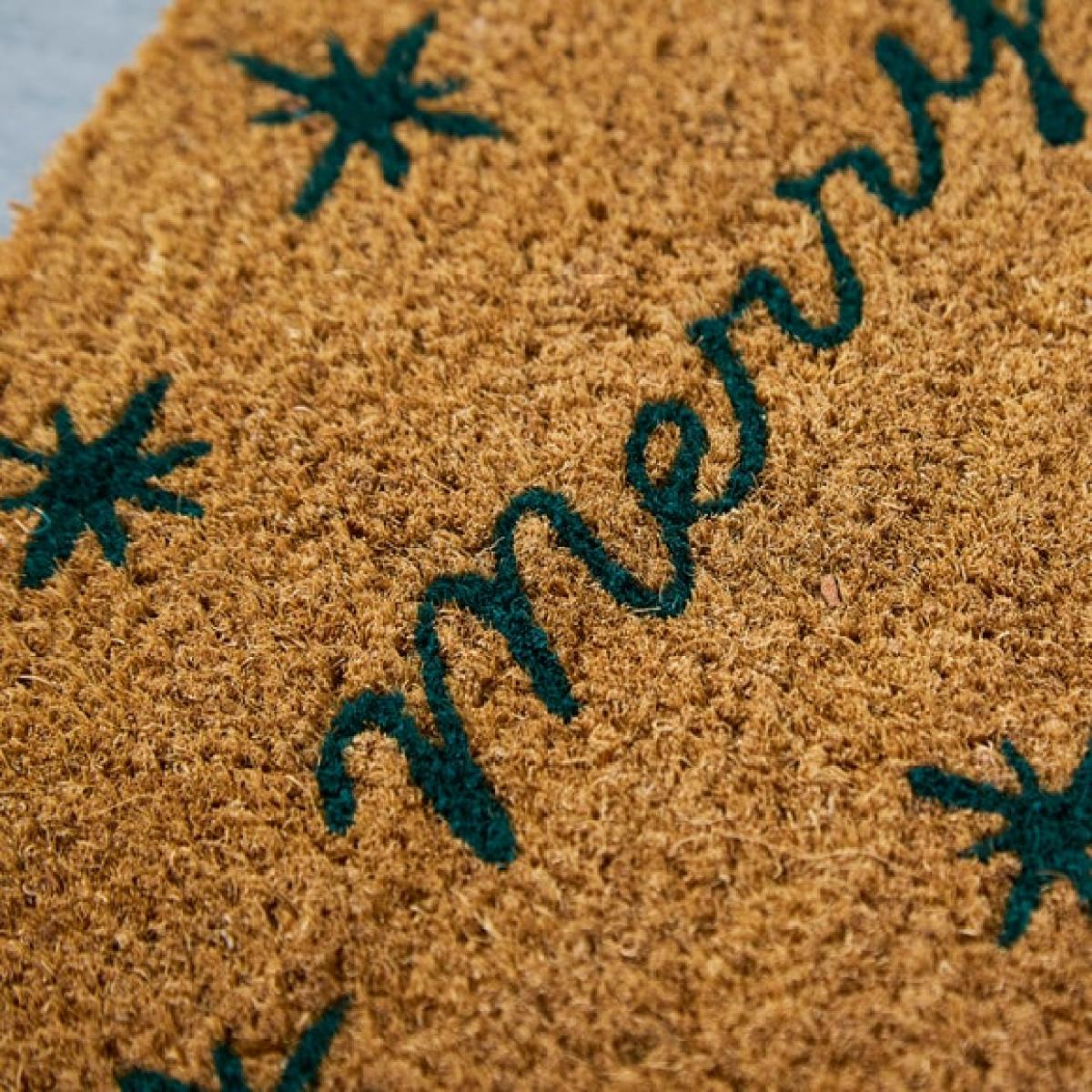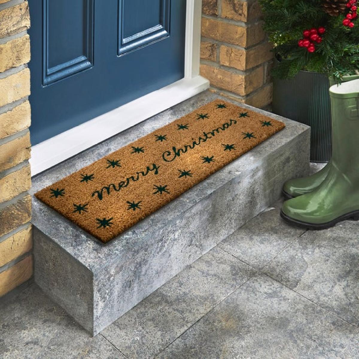 * 'Merry Christmas' text * Star detail * Coir doormat * Shaped for steps Step into the festive season with the 'Merry Christmas' Coir Outdoor Step Doormat. Designed to fit neatly on steps, it features classic text and star detailing for a cheerful welcome. Made from durable coir, it’s ideal for brushing off boots and keeping your home tidy. A simple yet stylish addition to your seasonal décor, and perfect for spreading holiday spirit right from the doorstep.