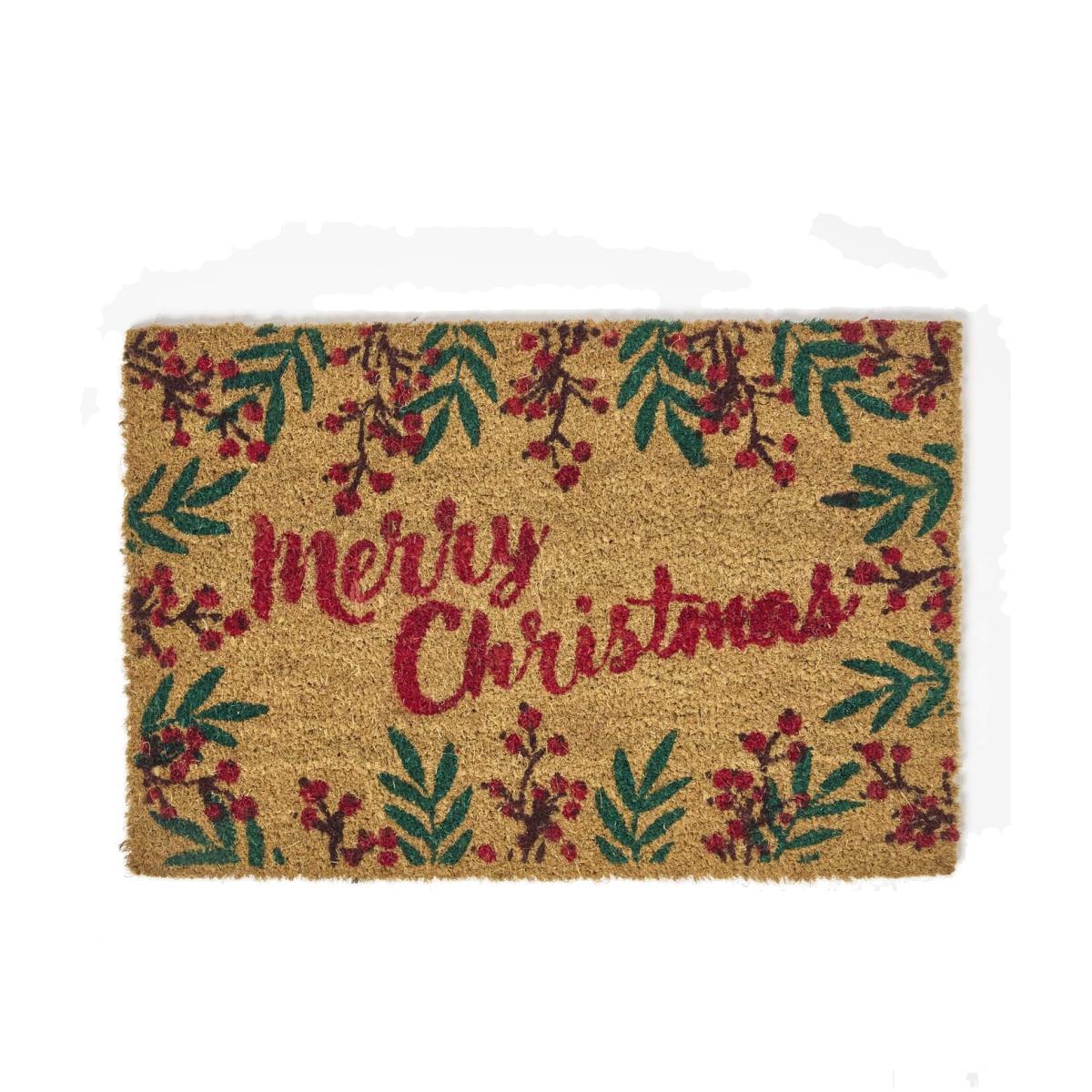 Get your home ready for the festive season with Homescapes' Christmas door mats outdoor! Add a touch of holiday elegance with this fun Christmas doormat featuring red berries and green pine leaves with a "Merry Christmas" print in red. This trendy Xmas door mat meaures 60 x 40cm. Made from 100 coir with an anti-slip PVC backing. With its thick PVC backing, this non slip mat is durable and suitable for all grounds, including tiles, wood, pebbles and brick and will remain sturdy and in place whatever the weather. Suitable outside door mats for front door or door mats indoor. This welcome mat will be the perfect addition to your home. Whether welcoming friends and family or simply enhancing your festive holiday decorations, this versatile Christmas doormat will fit in perfectly at entryways, front doors and entrances. Low-maintenance and easy to care for outdoor mat. To keep your christmas mat clean, it is recommended that you shake dirt and brush mud off regularly outdoors. Part of Homescapes' collection of doormats the range includes coir door mats, boots scrapers and boot trays. Complete the look with Homescapes collection of festive home accessories.