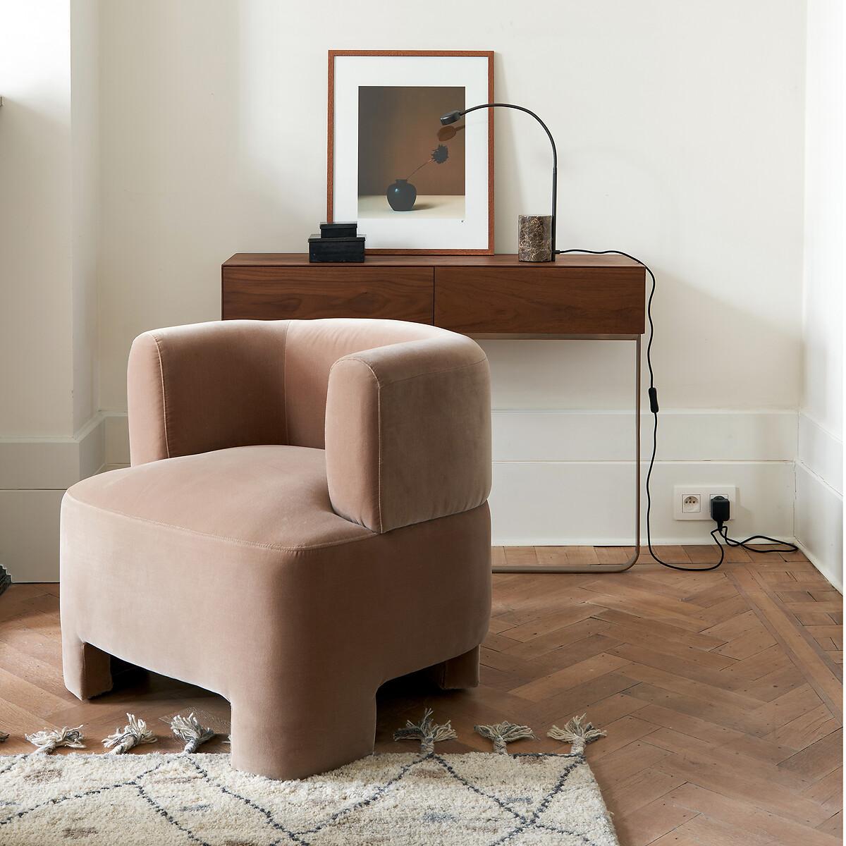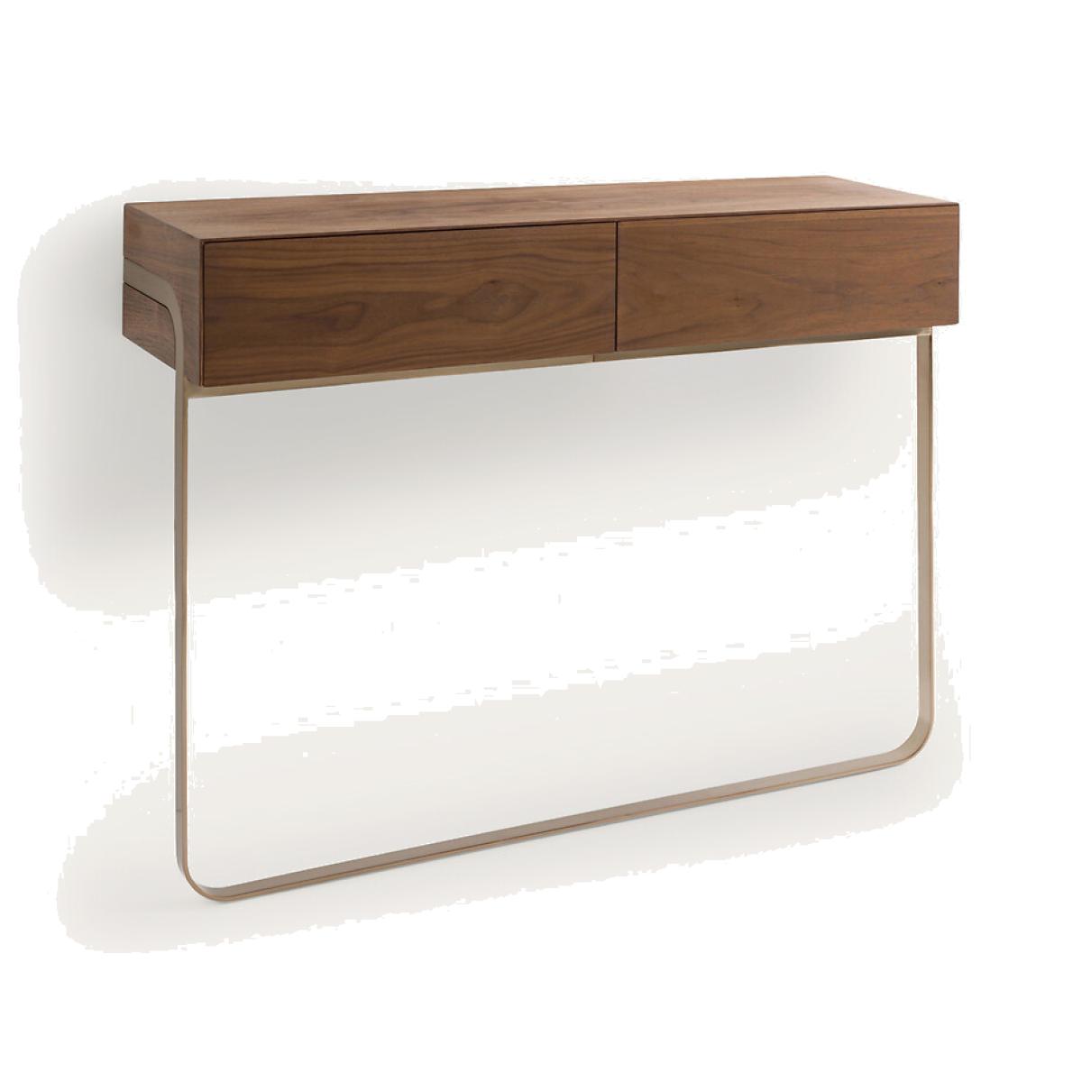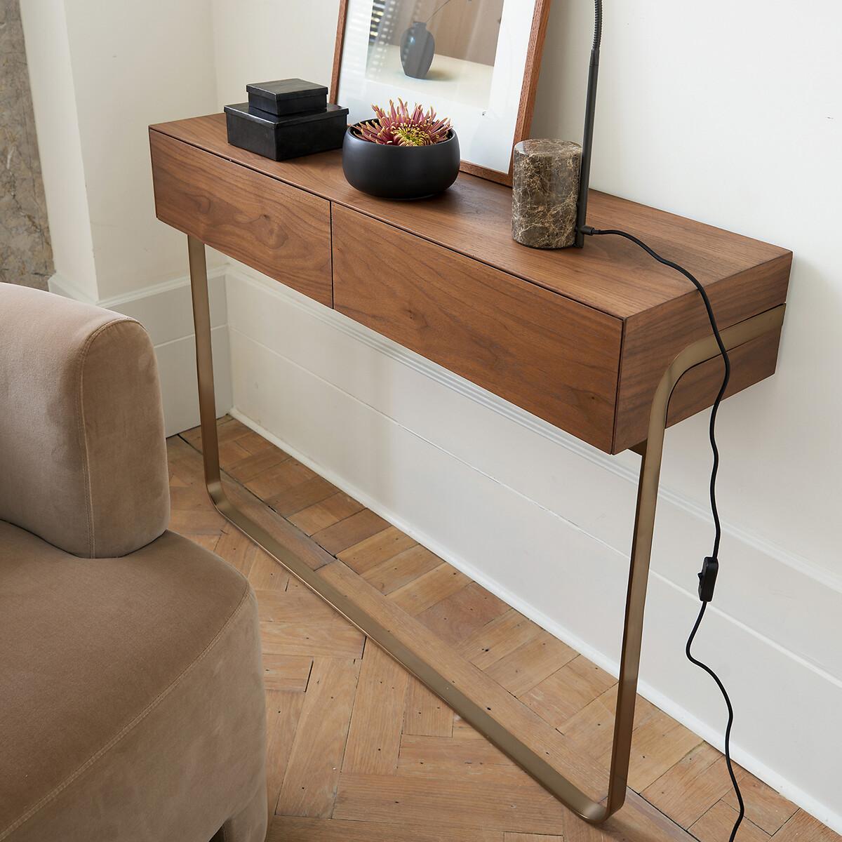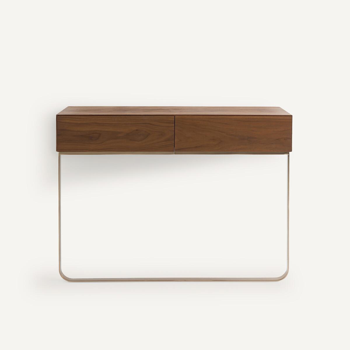 Both functional and very elegant, the Merten console, designed by AMPM, combines vintage and modern styles. A mocha-coloured metal ribbon lightly supports a walnut-veneered MDF box Product Details • Cabinet and drawers in walnut veneered MDF with NC finish. FSC® certified wood • Mocha finish flat iron base • 2 drawers with soft closing system • Mandatory wall fixing (screws and dowels not supplied)Quality Info • This furniture is equipped with German brand hardware: reliable, discreet and functional. These accessories ensure the longevity of your product. • Soft-closing : system for closing doors smoothly, silently, also preventing fingers from getting caught. Dimensions. Overall • Width: 100cm • Height: 75cm • Depth: 30cm. Usable space • Drawers :L43.5 x H8 x D24cm Delivery: • Assembly required. Available for home delivery. Note! Please check that all access points are large enough to accommodate your delivery (doors, stairs, lifts). • WOOD FROM SUSTAINABLY MANAGED FORESTS. FSC® certified wood comes from forests that are environmentally, socially and economically well managed. Dimensions and weight of package::1 parcel • L107 x H30 x D77cm. 30kg