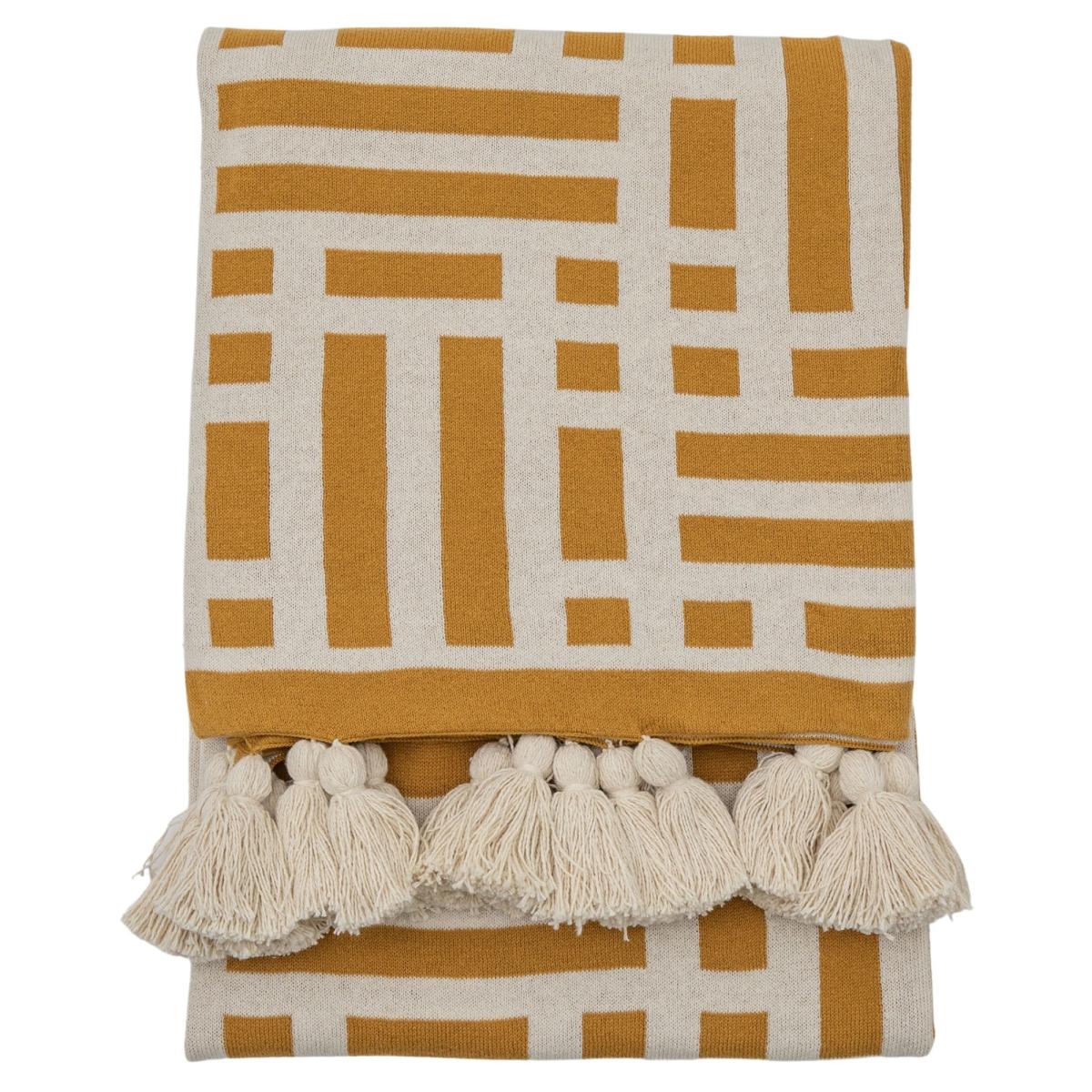 A Stylish Knitted throw with a contemporary ochre and cream design and finished with charming cream tassels. Colour - Ochre / Cream Material - Cotton Technique - Knitted Fabric Weight - 970 gsm Size - 1.3m x 1.7m All screens vary in colour reproduction and whilst every effort has been made to display the colour as accurately as possible it is for guidance only.