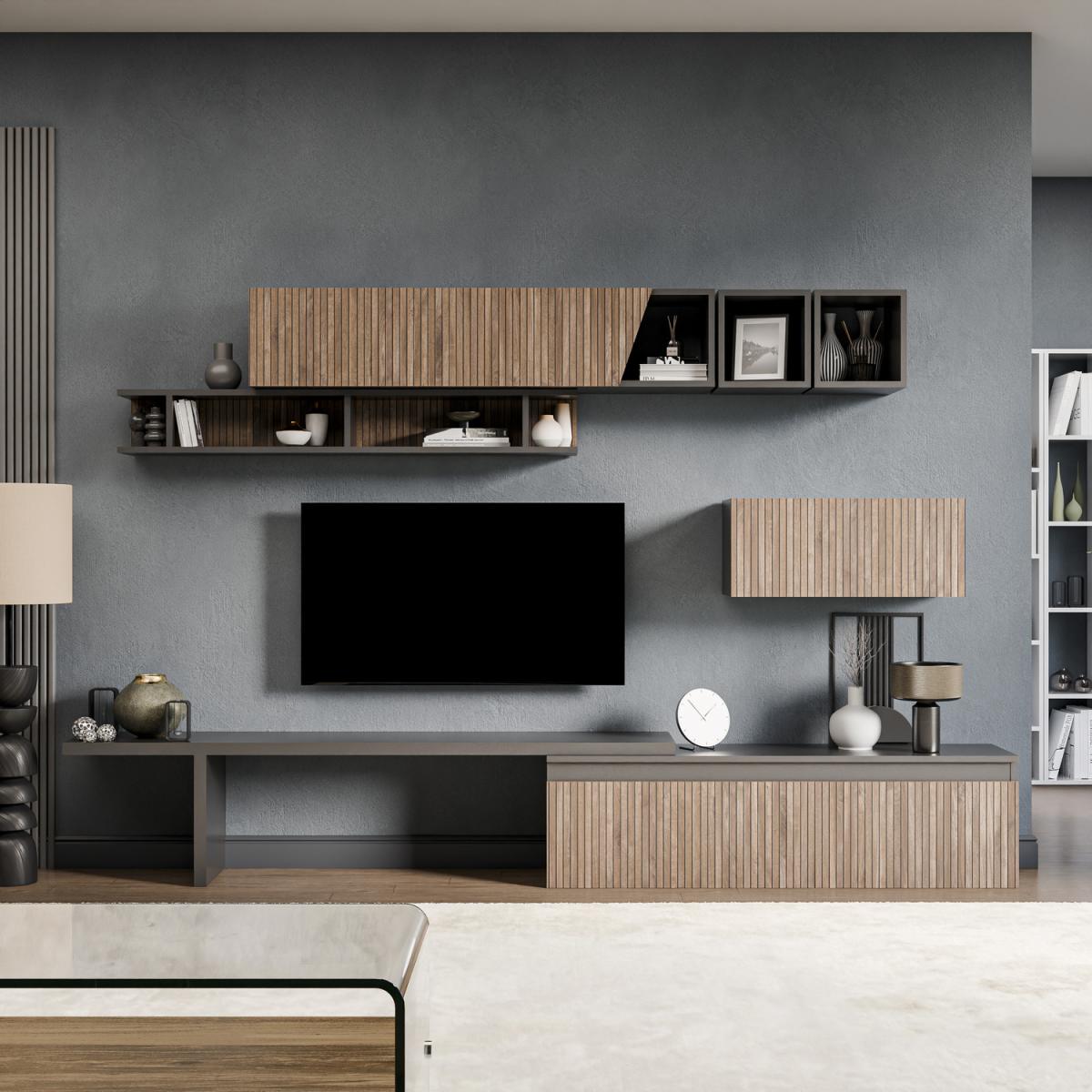 Designed for modern interiors, this floating wall unit combines sleek vertical lines with geometric cuts for a refined, architectural aesthetic. The unit features a modular layout with a central TV zone, elevated side cabinets, and a floating base, creating a bold, space-saving entertainment solution. With a mix of open and closed compartments, this system offers ample room for dcor, books, and multimedia accessories while maintaining a clean, minimalist look. Slatted textures enhance the visual depth, and asymmetric design details add an element of contemporary sophistication. Key Features. Floating modular design for a modern, streamlined appearance Unique mix of vertical and horizontal wall-mounted cabinets. Textured slatted fronts add depth and design character Central TV space supports most flat-screen sizes. Smart combination of hidden storage and display niches. Ideal for upscale living rooms, media areas, and contemporary homes. Perfect for homeowners looking to add structure and modern flair to their entertainment area while maximizing floor space.