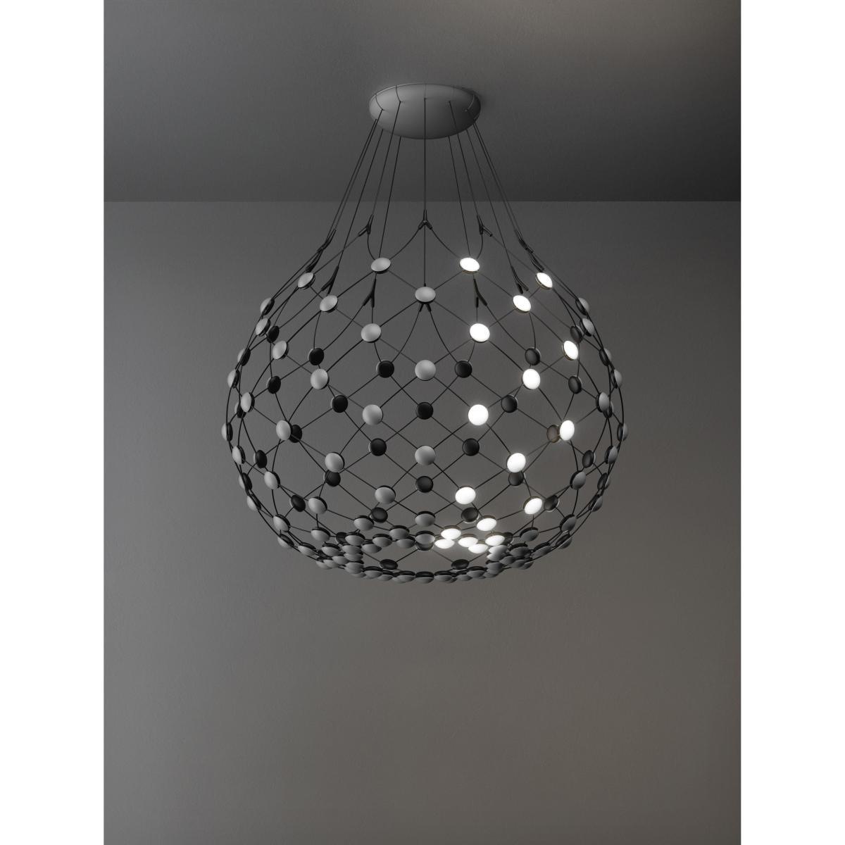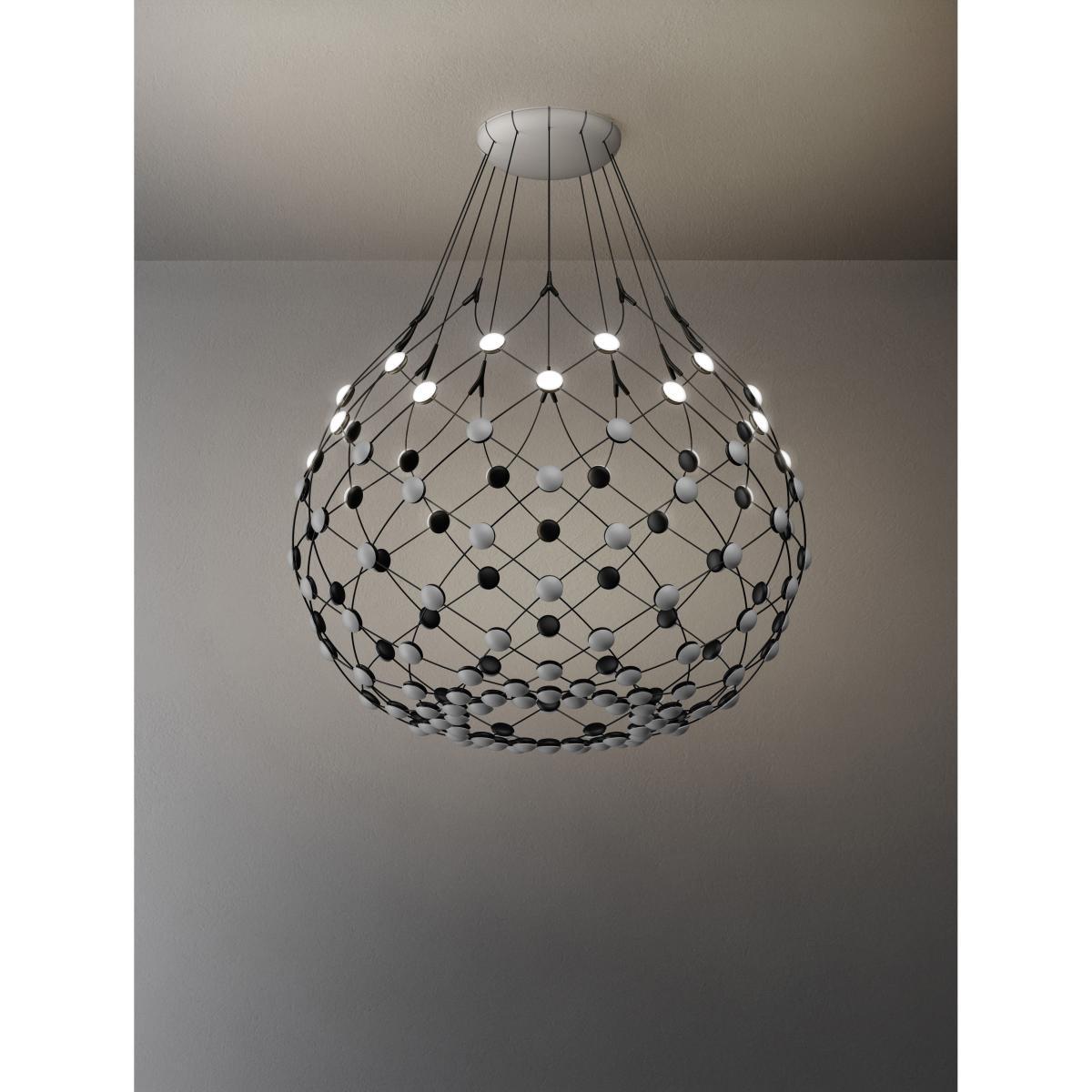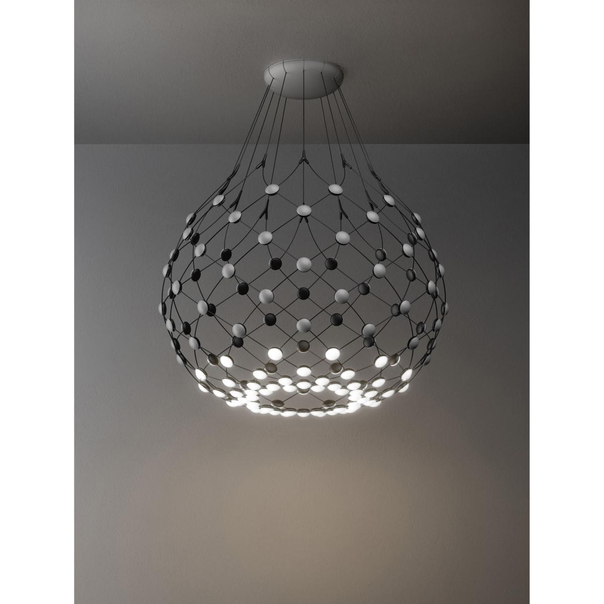 A suspension lamp offering multiple lighting scenarios for personalized aesthetic and functional performance. Based on experimentation with the potential of LEDs, a technology that permits separation into very small units, Mesh is a dramatic and highly innovative project. The lightweight, almost transparent structure composed of a network of metal cables with the LED positioned at their intersections conceals the complexity of the product, dematerializing it to leave space only for light, the true protagonist of the lamp. A poetic creation of great impact that makes it possible to generate a refined, evocative atmosphere. The particular structure of the lamp permits exceptional freedom in the control of its luminance: the intensity can be adjusted, and it is possible to choose which sectors to illuminate – an upper ring, the lower zone, a lateral sector. Thanks to its versatility and spectacular image, Mesh is perfect for both the home and contract markets.