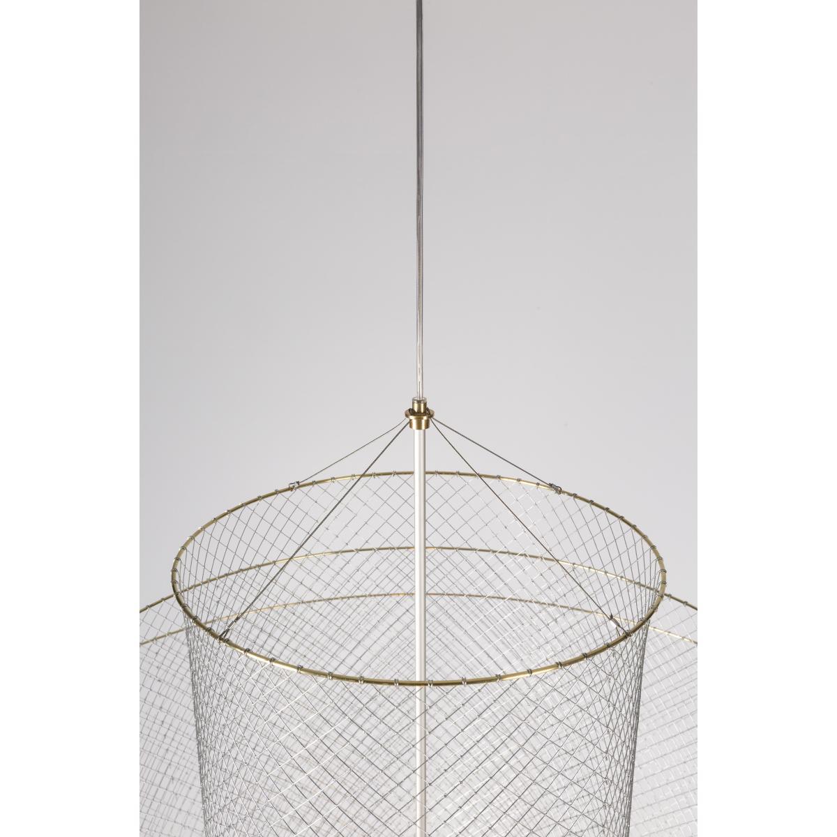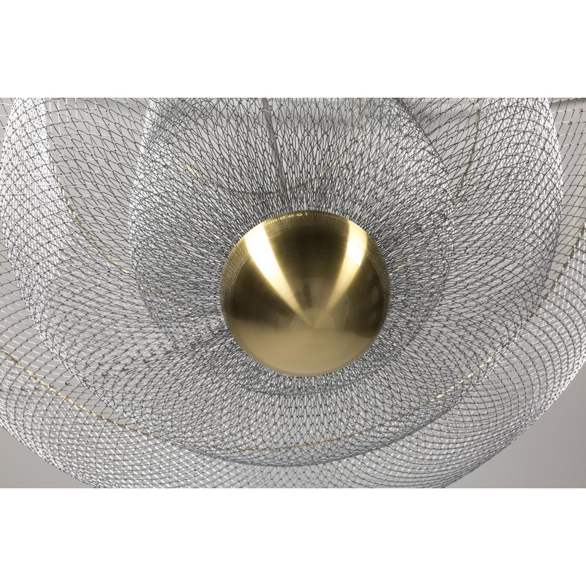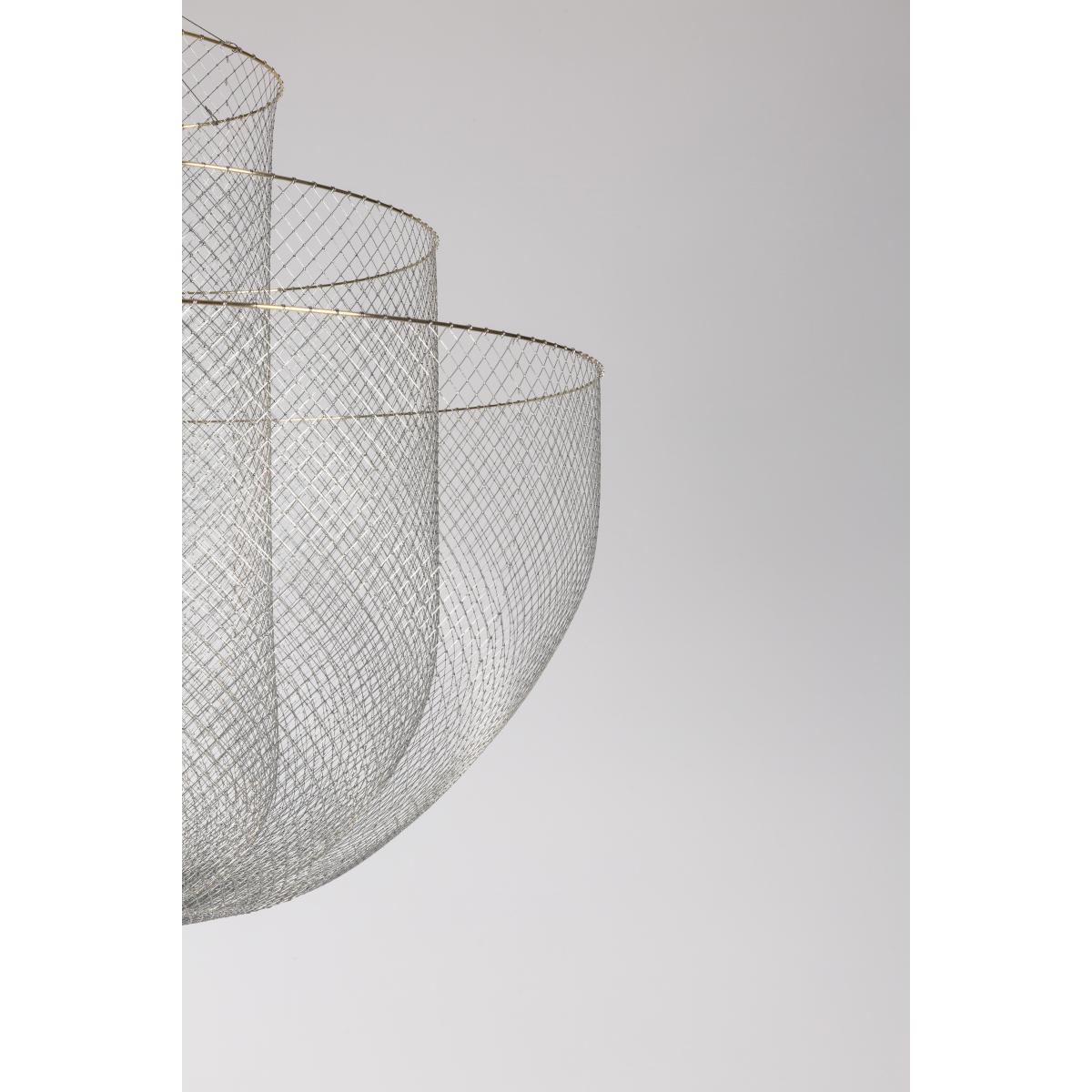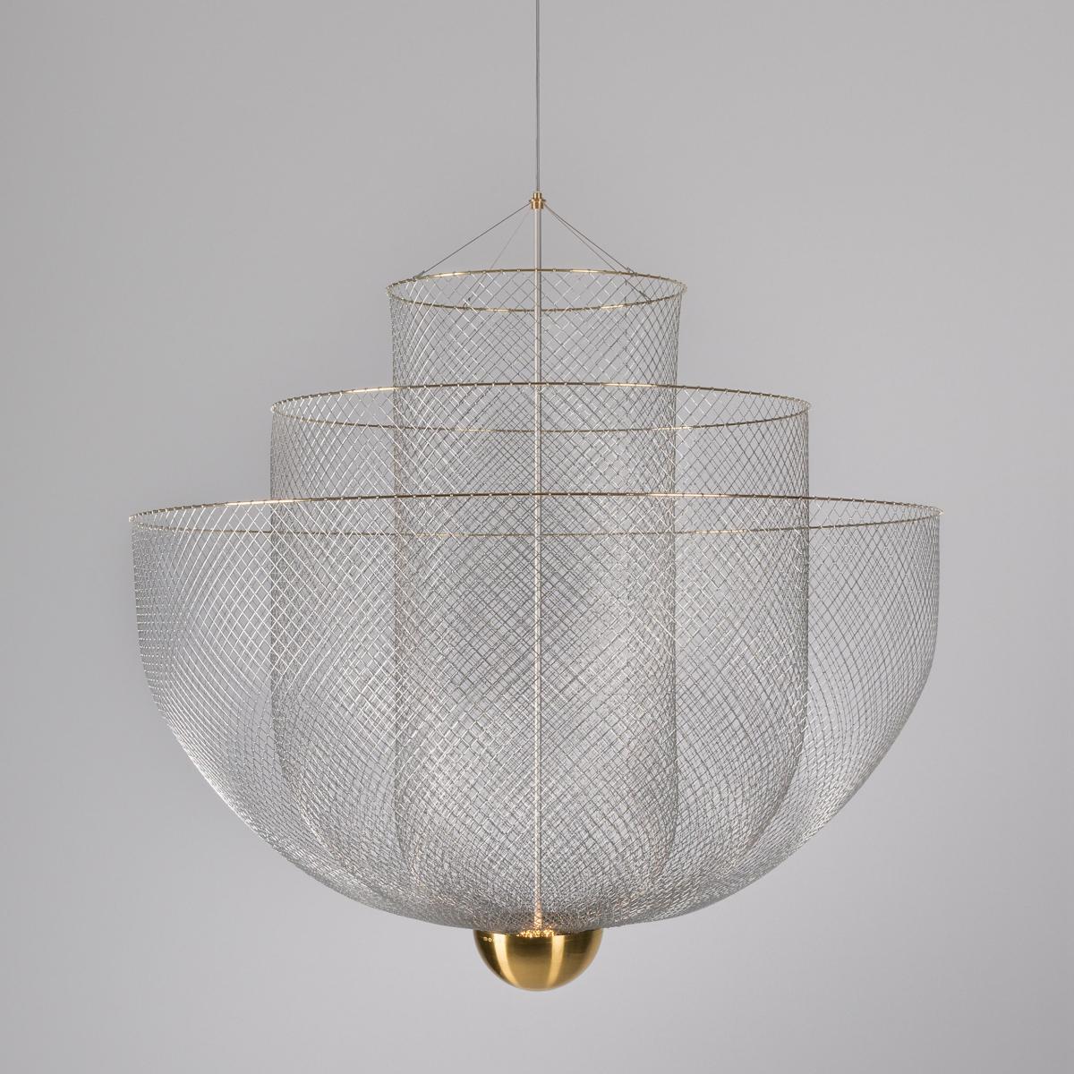 An unusual visual effect for this exceptional item, the result of a remarkable piece of work using shape, volume and material. Taking the majestic silhouette of chandeliers of old, this XXL pendant presents a sublime cascade of transparency. The Dutch designer Rick Tegelaar transforms mesh, a modest and ordinary material, into a precious creation, dreamlike and fleeting. The designer has specially developed a machine to stretch and shape steel mesh. The lampshade consists of three domes of different layered sizes. The ethereal volumes intertwine, giving birth to a large openwork structure that’s incredibly balanced. The intertwined galvanised steel wires form beautiful, repeating geometric patterns. The light filters through the multitude of metal wires, producing a beautiful luminescence that plays with light and shadow. This remarkable piece will dress beautiful high ceilings with panache! The LED light source is integrated into the brass dome in the centre of the pendant (at the bottom).