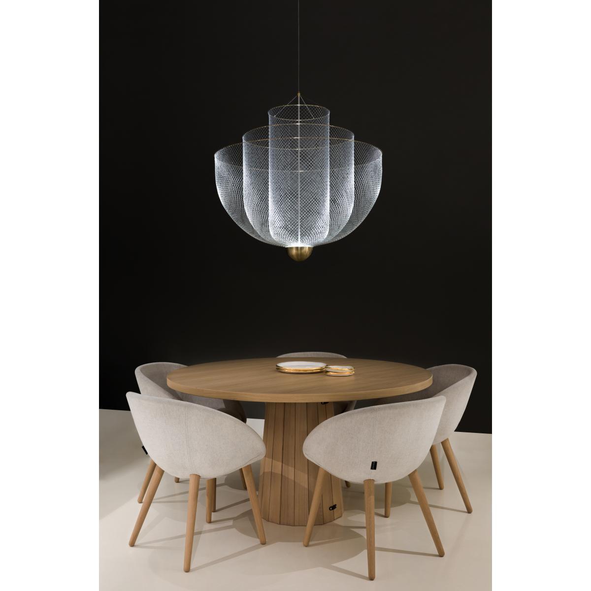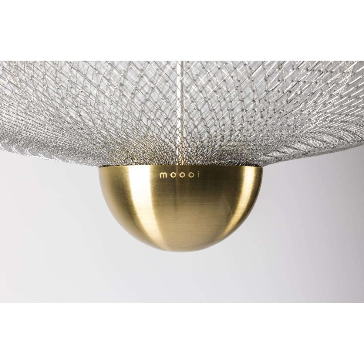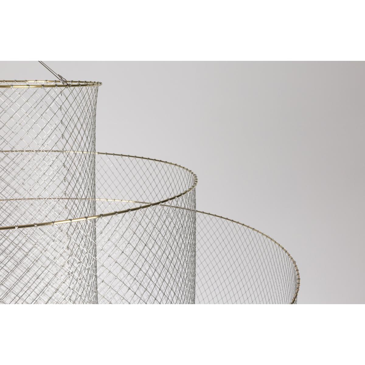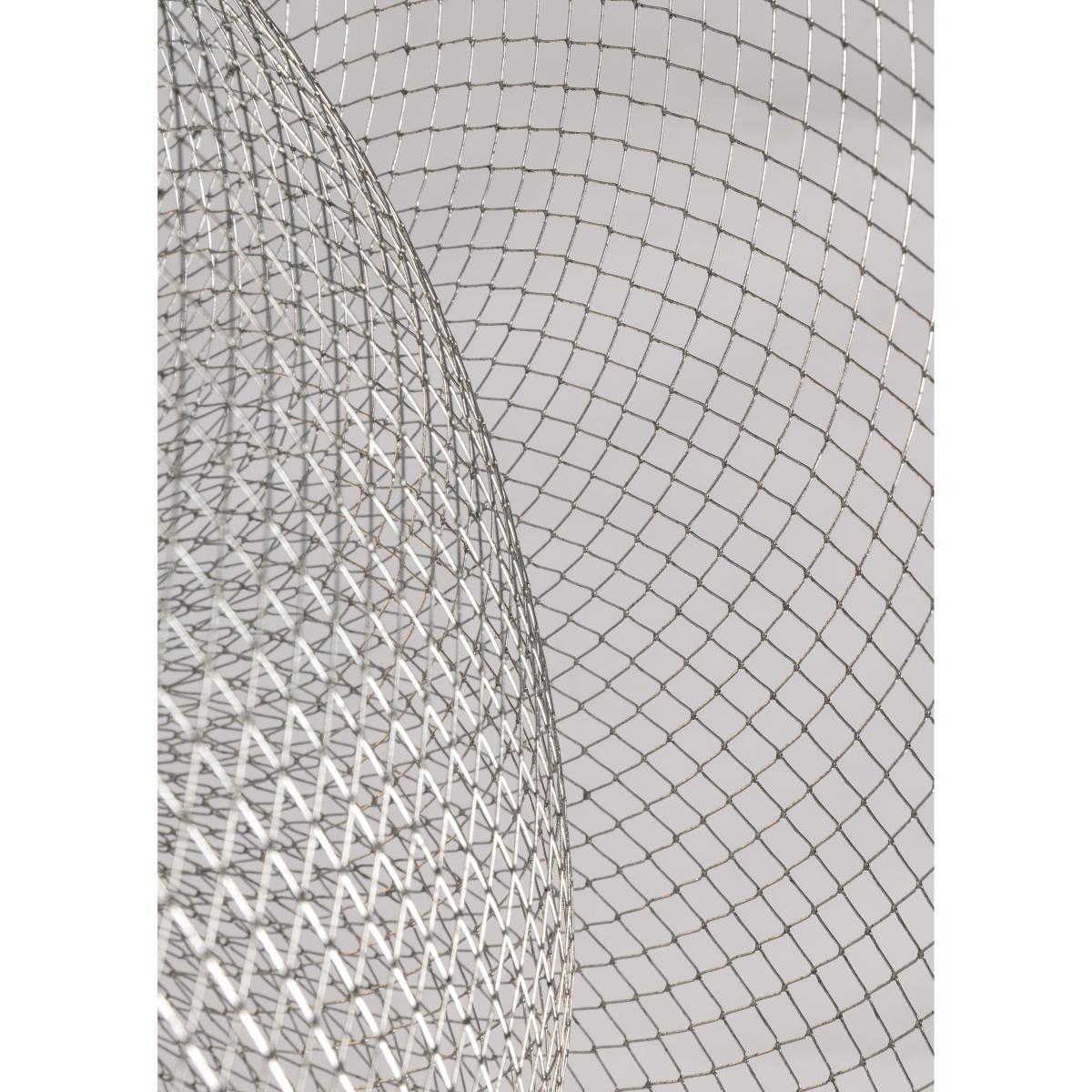 An unusual visual effect for this exceptional item, the result of a remarkable piece of work using shape, volume and material. Taking the majestic silhouette of chandeliers of old, this XXL pendant presents a sublime cascade of transparency. The Dutch designer Rick Tegelaar transforms mesh, a modest and ordinary material, into a precious creation, dreamlike and fleeting. The designer has specially developed a machine to stretch and shape steel mesh. The lampshade consists of three domes of different layered sizes. The ethereal volumes intertwine, giving birth to a large openwork structure that’s incredibly balanced. The intertwined galvanised steel wires form beautiful, repeating geometric patterns. The light filters through the multitude of metal wires, producing a beautiful luminescence that plays with light and shadow. This remarkable piece will dress beautiful high ceilings with panache! The LED light source is integrated into the brass dome in the centre of the pendant (at the bottom).