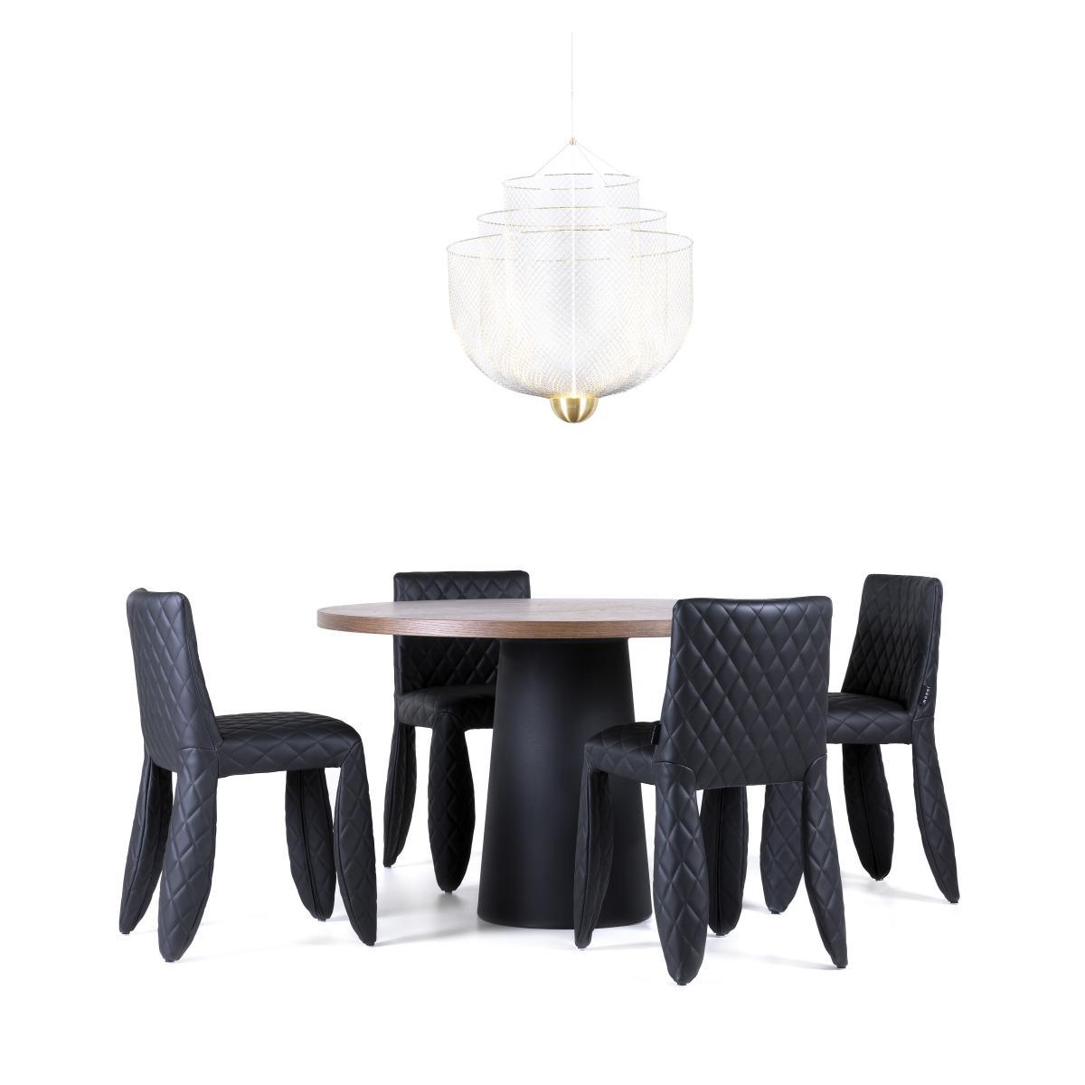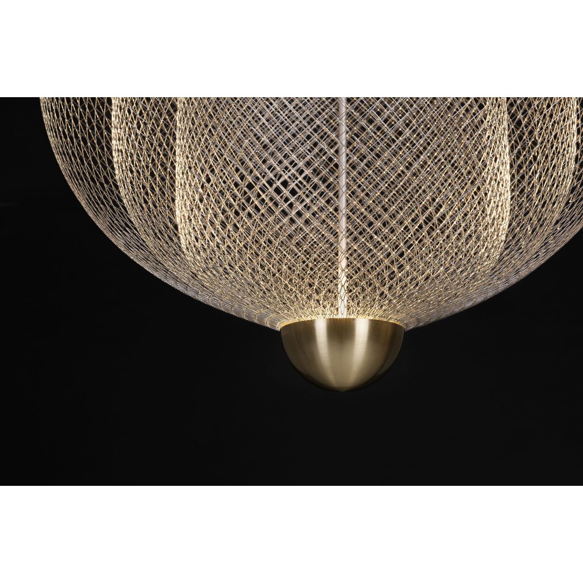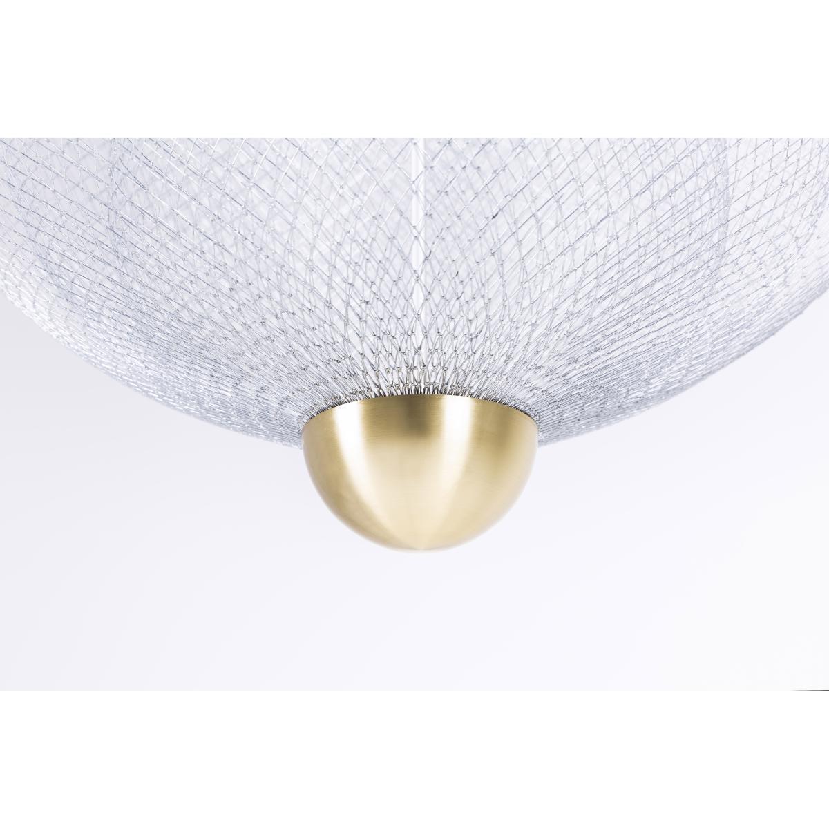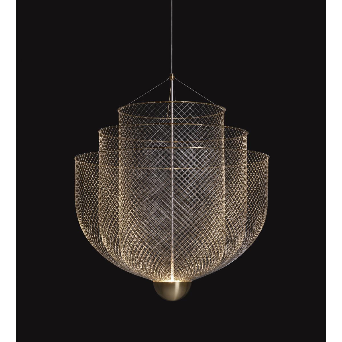 An unusual visual effect for this exceptional item, the result of a remarkable piece of work using shape, volume and material. Taking the majestic silhouette of chandeliers of old, this XXL pendant presents a sublime cascade of transparency. The Dutch designer Rick Tegelaar transforms mesh, a modest and ordinary material, into a precious creation, dreamlike and fleeting. The designer has specially developed a machine to stretch and shape steel mesh. The lampshade consists of three domes of different layered sizes. The ethereal volumes intertwine, giving birth to a large openwork structure that’s incredibly balanced. The intertwined galvanised steel wires form beautiful, repeating geometric patterns. The light filters through the multitude of metal wires, producing a beautiful luminescence that plays with light and shadow. This remarkable piece will dress beautiful high ceilings with panache! The LED light source is integrated into the brass dome in the centre of the pendant (at the bottom).
