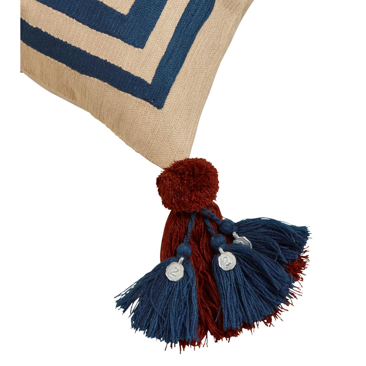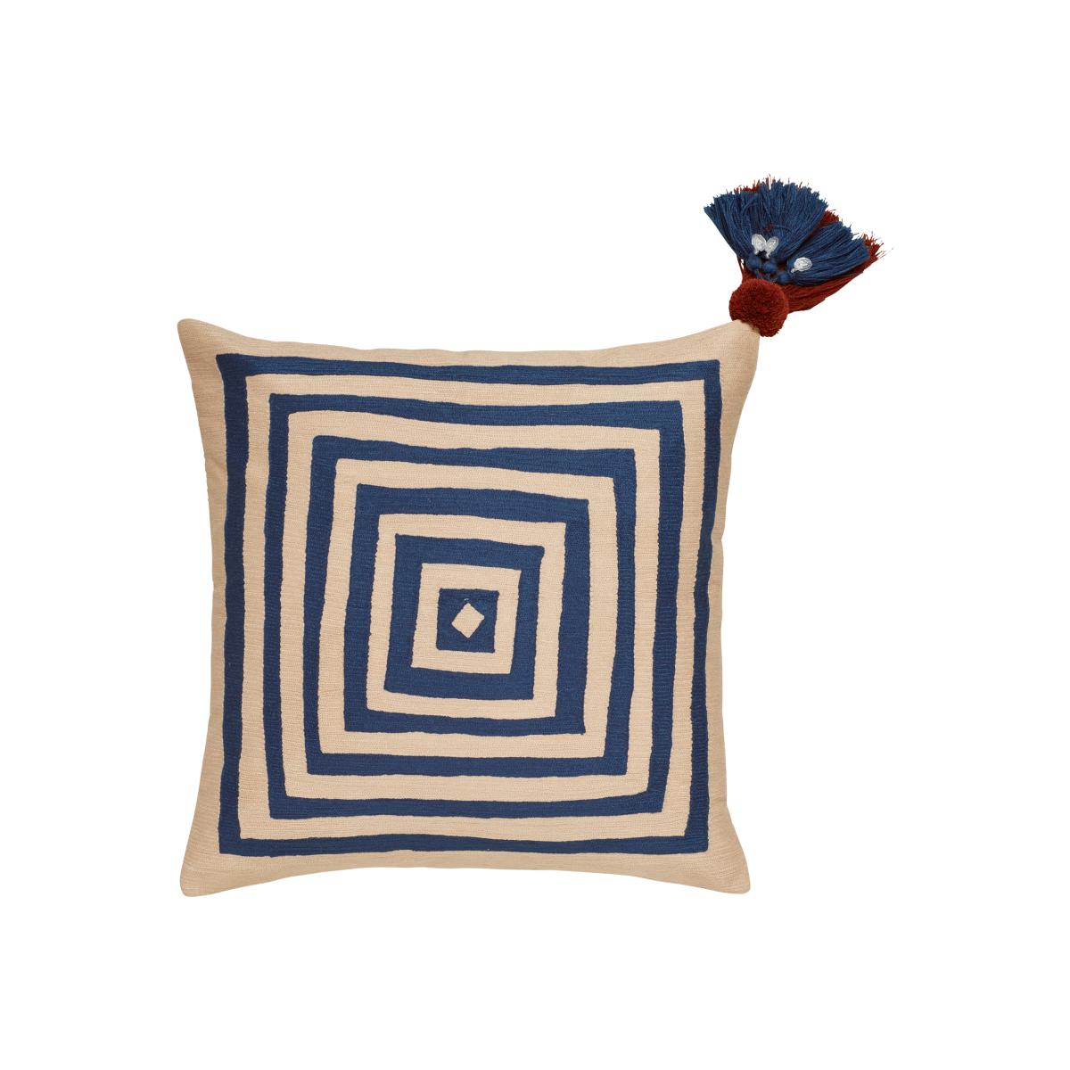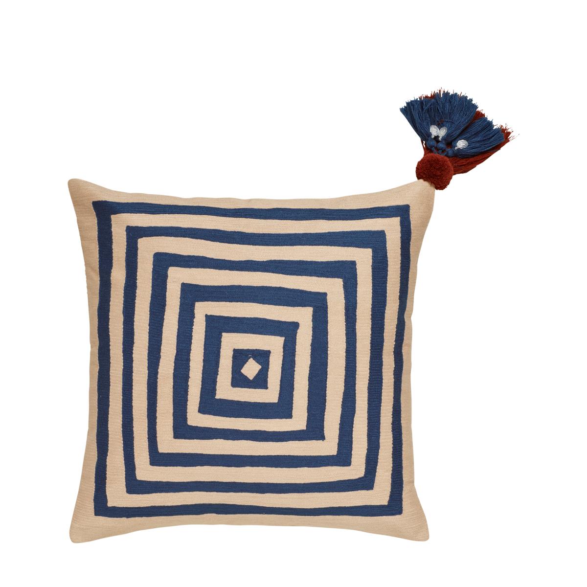 With a geometric design reminiscent of 1960s film credits and graphic motifs, the Mesmer Cushion Cover is an intriguing touch. A single hand-embroidered tasseled corner adds to the cushion's playful appearance, lending a touch of flamboyance to a sitting room or bedroom scheme.