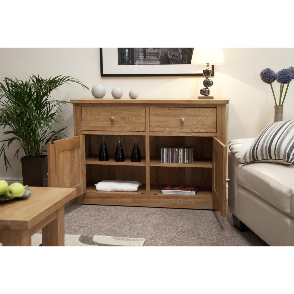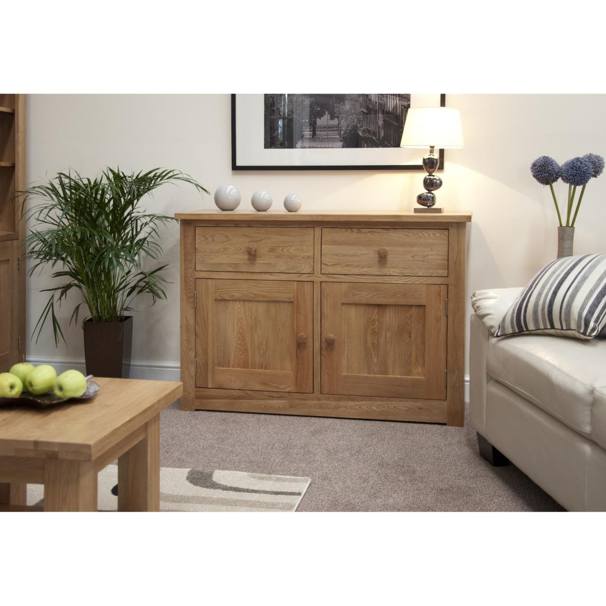 The Messina 130cm Oak Sideboard is a wonderfully compact piece of furniture that will effortlessly blend with any dining or living room. Two good sized and dovetail jointed drawers offer plenty of room for your silverware whilst the two door cupboard space is more than enough room for your tableware. The modest design of the 130cm sideboard effortlessly blends with any décor whilst the solid oak craftsmanship means it is a piece that will last a lifetime. Finished with a light lacquer, the Messina 130cm Oak Sideboard is a wonderful addition to any home. * PLEASE NOTE this item is supplied with Metal handles. Please contact us once your order is placed to purchase Oak Handles. Further Items in the Collection: Messina 130cm Oak Computer Desk, Messina Oak Bookcase, Messina 100cm Oak Glazed Display Cabinet, Messina 110cm Oak TV Unit and Messina 90cm Oak TV Cabinet.