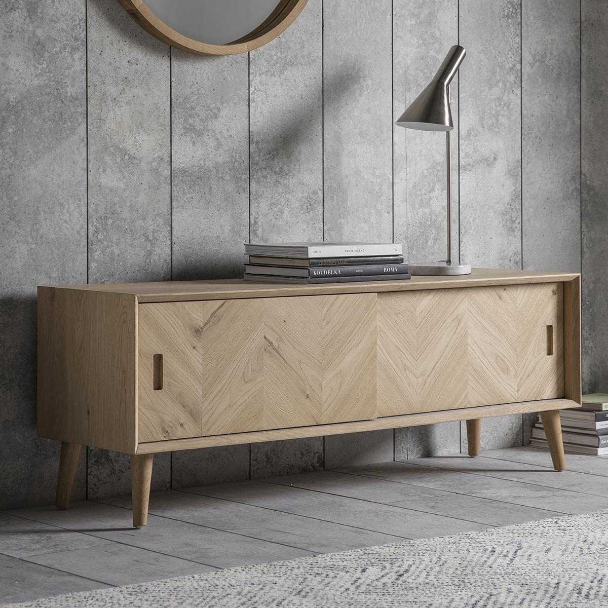 I love this piece for its clean, minimal aesthetic and warm oak finish, which works well in a variety of interiors-from Scandi-inspired spaces to modern, neutral settings. Its sleek design and sliding doors make it both stylish and functional, providing ample storage without cluttering your room. Practical styling tips include layering with nice books, a few decorative objects, or greenery on top to create an inviting vibe. It also pairs nicely with other light woods or statement metallic accents for a curated, contemporary look. This media unit’s versatility makes it an easy choice to anchor your living space while keeping everything tidy.
