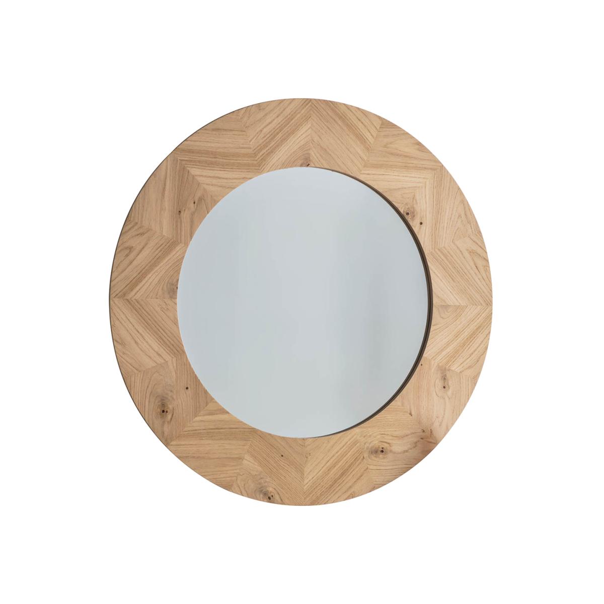 Cool and sleek Messina Round Wall Mirror features a beautiful inlay chevron design, and made using European oak and rustic oak structured veneers which show the natural beauty of the oak grain and knots. Finished in a specialist mat lacquer, which keeps the timber looking natural and dry, with brushed out grain, the media unit is tactile to touch and looks amazing. Shape: Round. Material: Glass, Oak. Colour/Finish: Light Wood. Mount Type: Wall.
