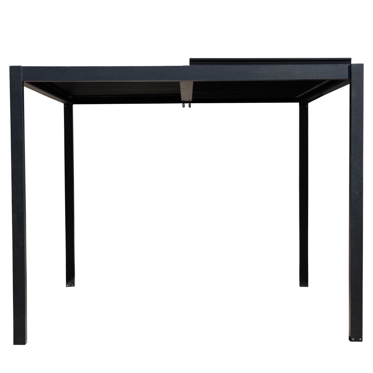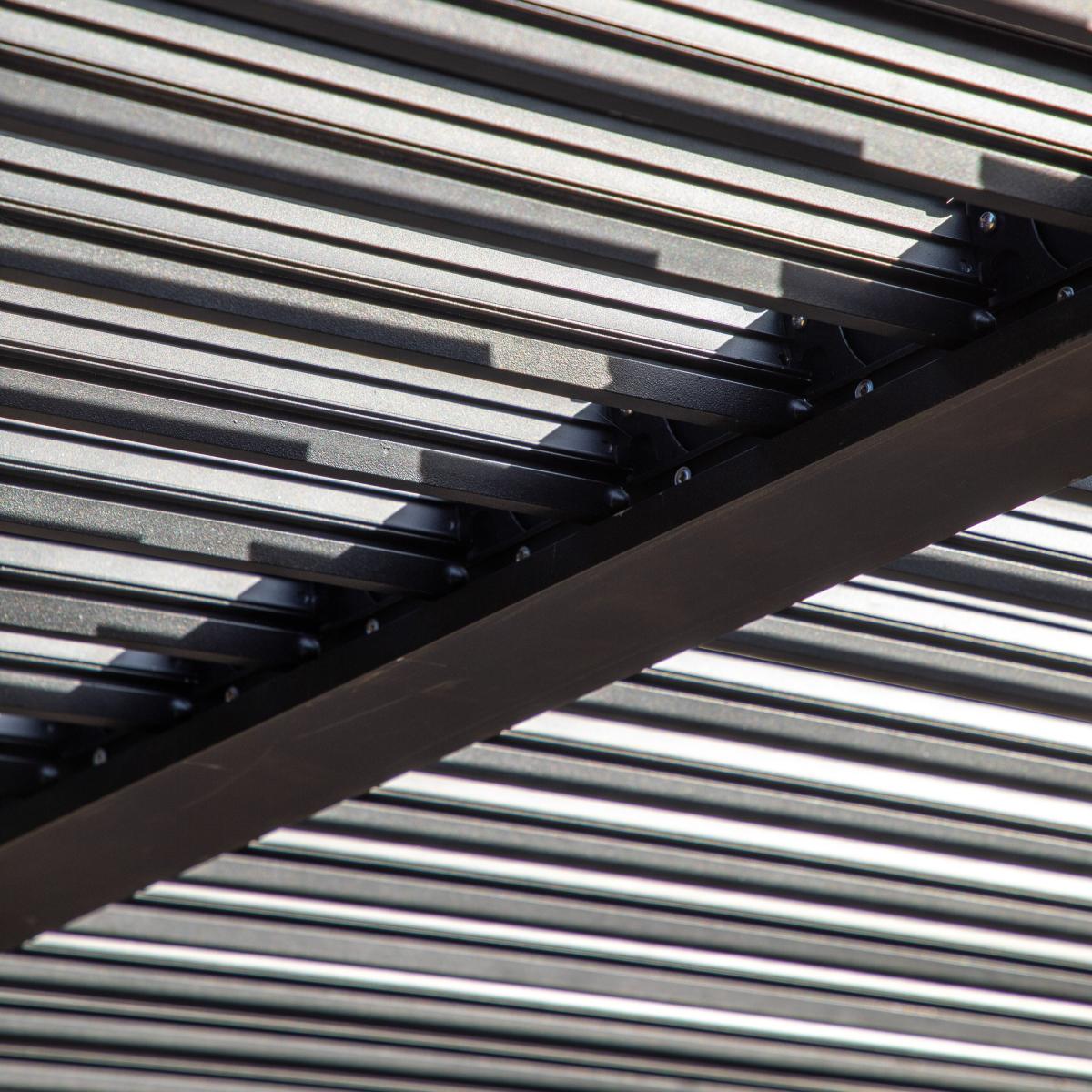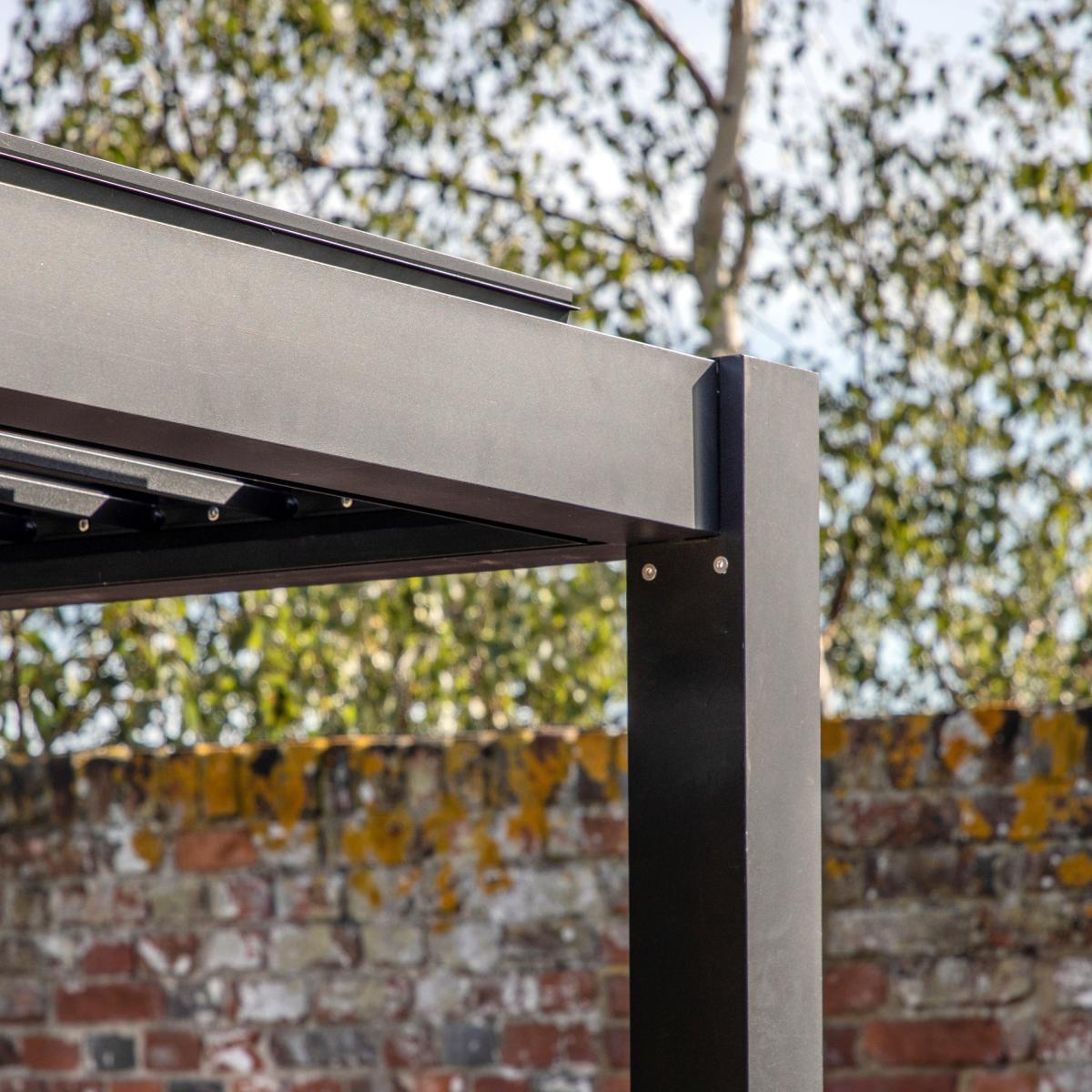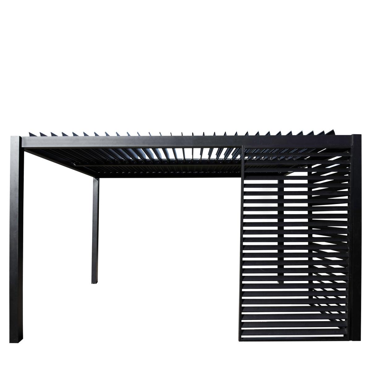 This stunning, high quality pergola is designed to allow you to enjoy your outdoor space for longer. The roof louvres can be tilted, using a handle winder, allowing you to let in the sunshine, or closing them to offer shade and cover from rain. The clever design features a drainage system; the louvres overlap when closed, making the roof watertight, and they incorporate drainage, so water runs from them into the frame and then down the inside of the legs. Slatted side screens in two sizes are available separately to accompany the pergola, with different options for position, allowing you to place them to suit your own design. To make a complete side, three of the larger screens are needed for the 4m side and three of the smaller screens for the 3m side. The pergola and screens are crafted from aluminium with a contemporary black powder coated finish.